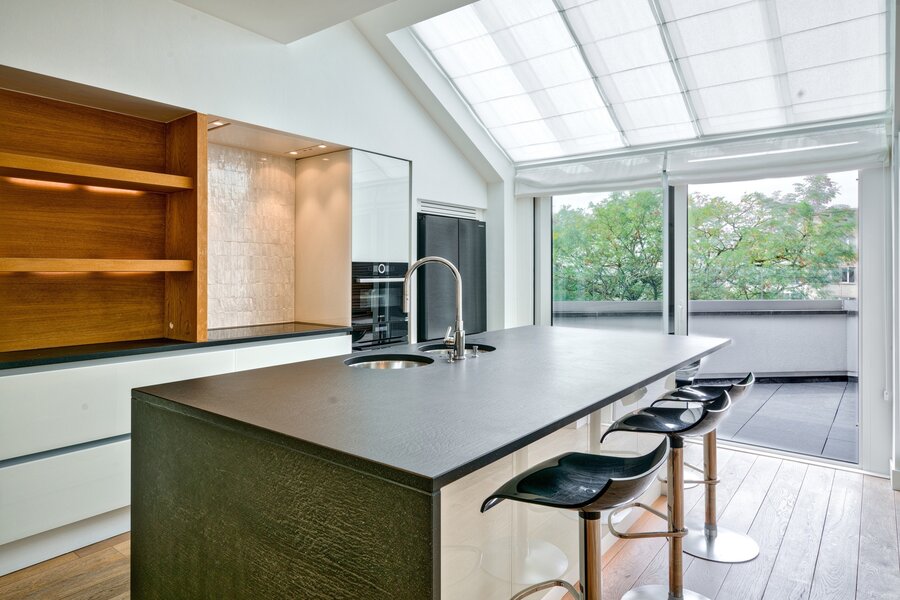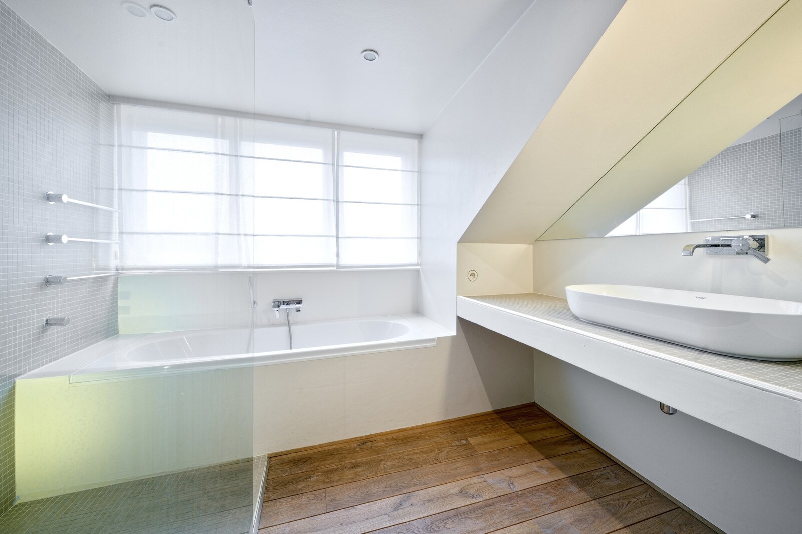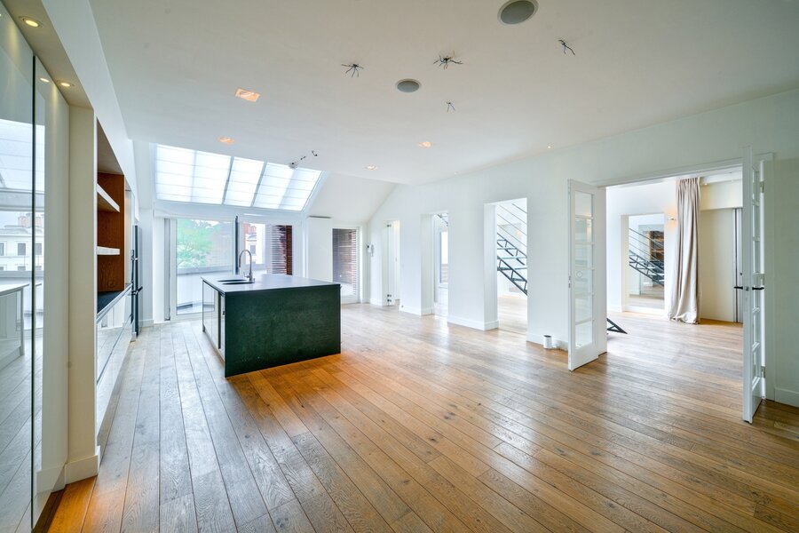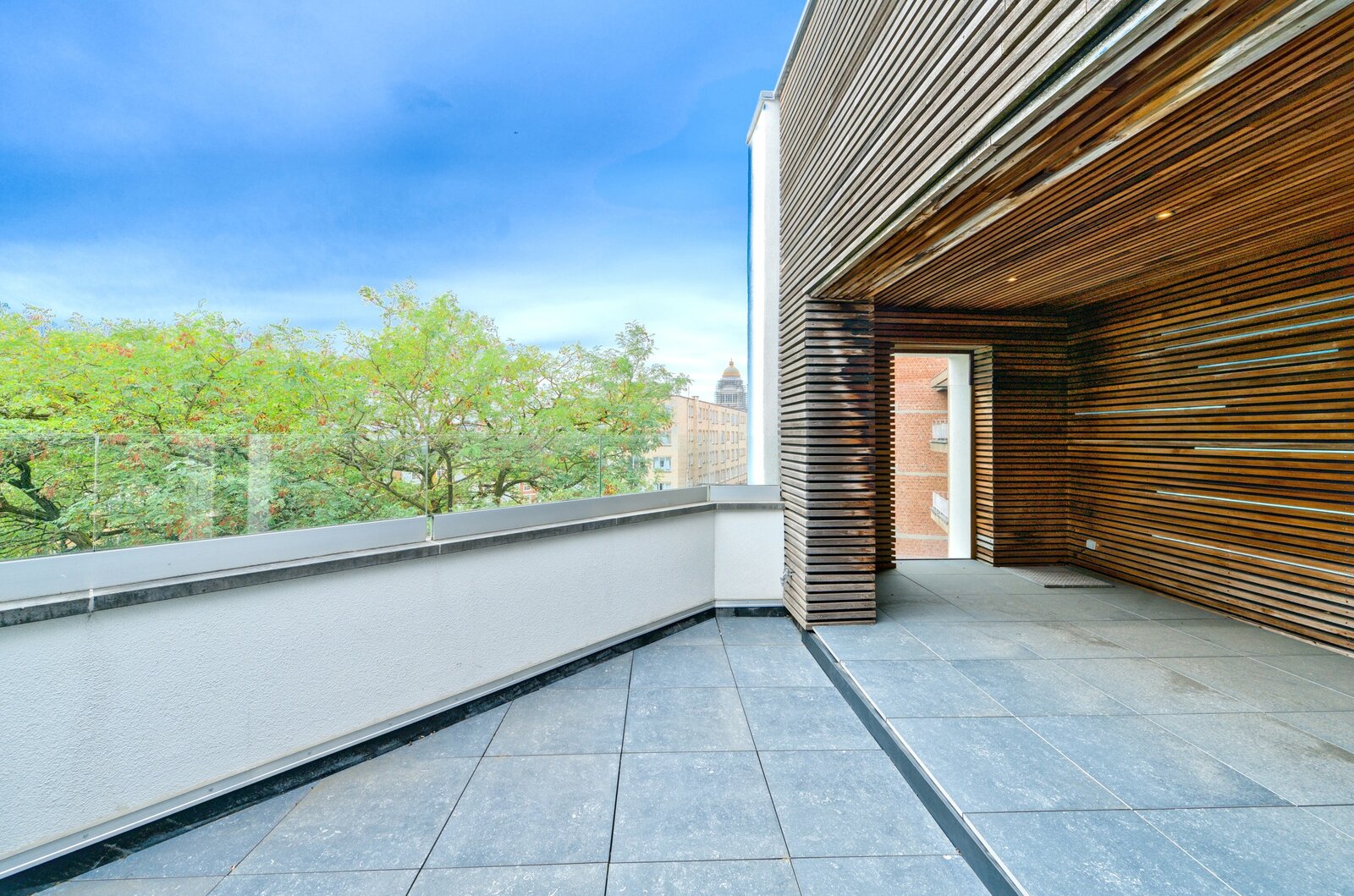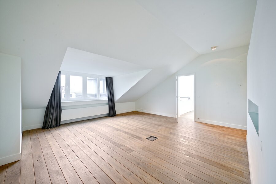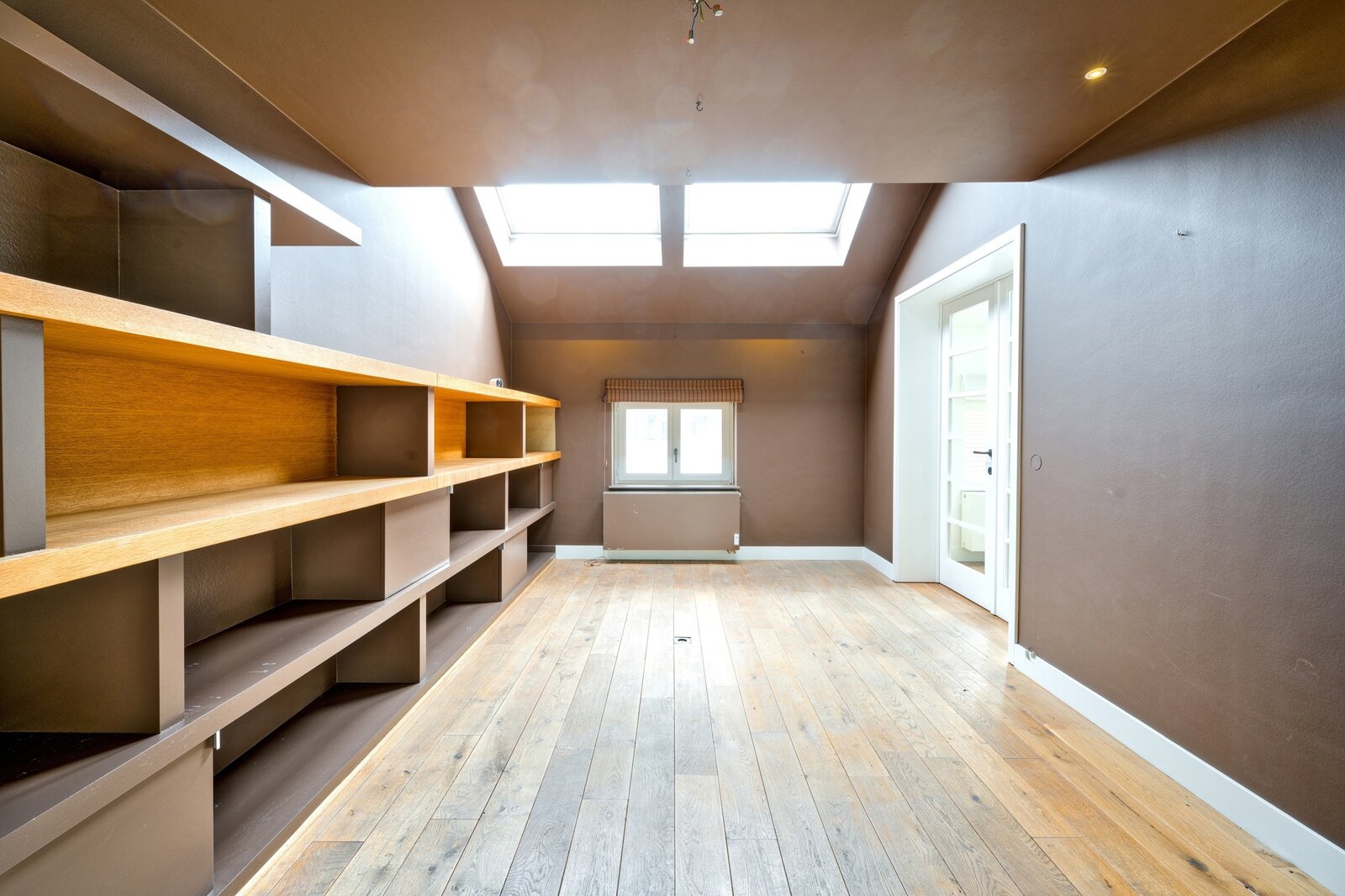 L'étage supérieur offre une belle chambre de maitres comprenant dressing et salle de bain, un spacieux bureau dotés d'une terrasse avec vue dégagée sur Bruxelles et deux autres chambres avec chacune leur salle de bain.