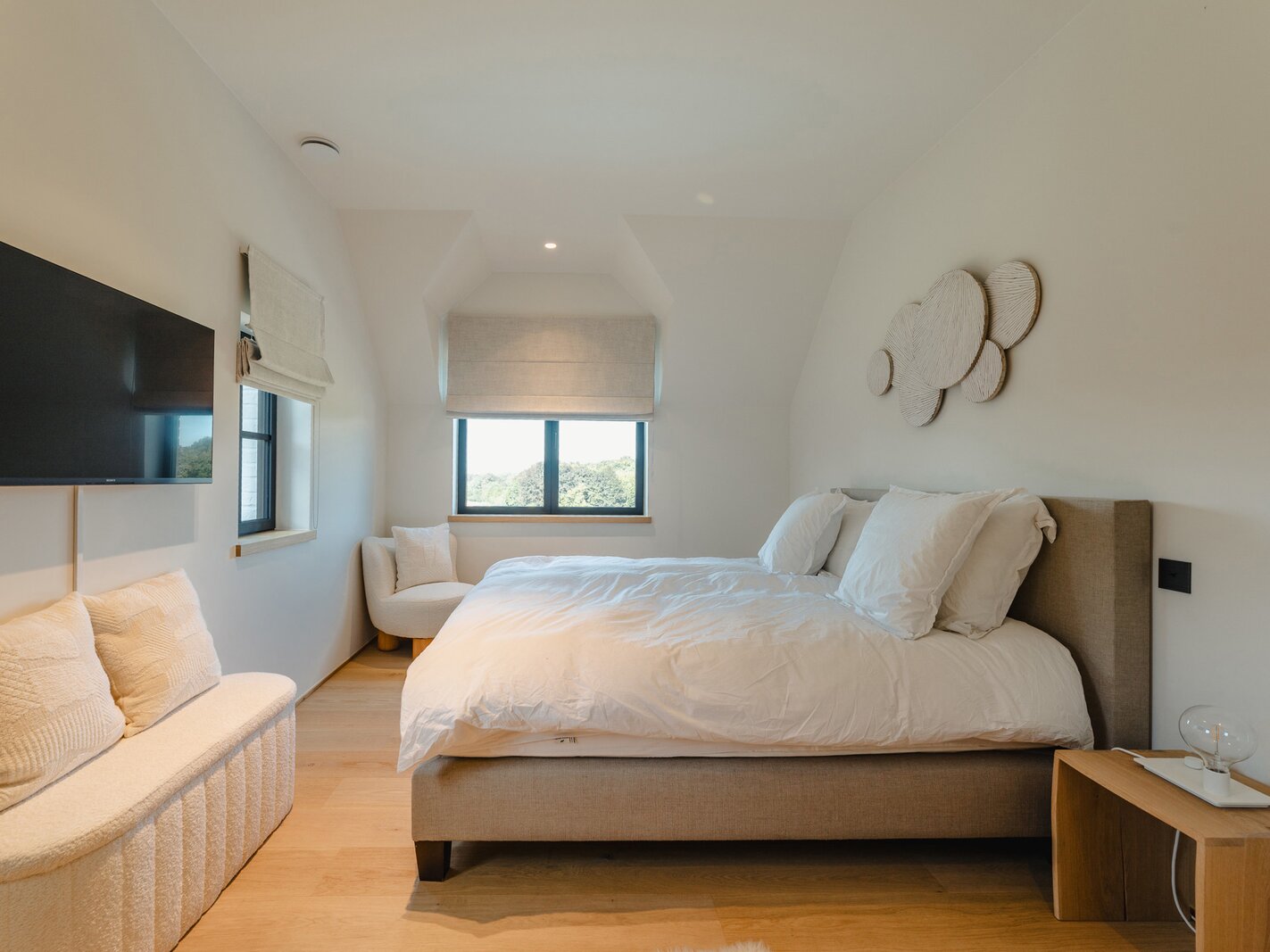 Le pool house, doté d’un hammam, sauna et douche, s’ouvre sur la piscine. Un garage double, un parking pour huit voitures, un cellier et des locaux techniques complètent l’ensemble. Les matériaux, choisis avec soin, créent une ambiance élégante et cohérente.