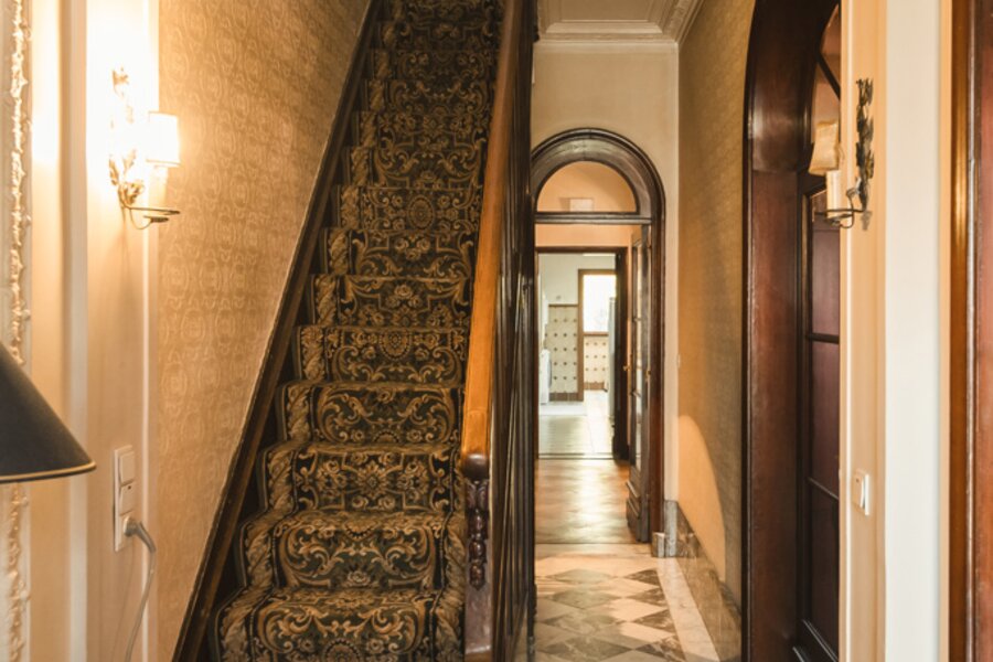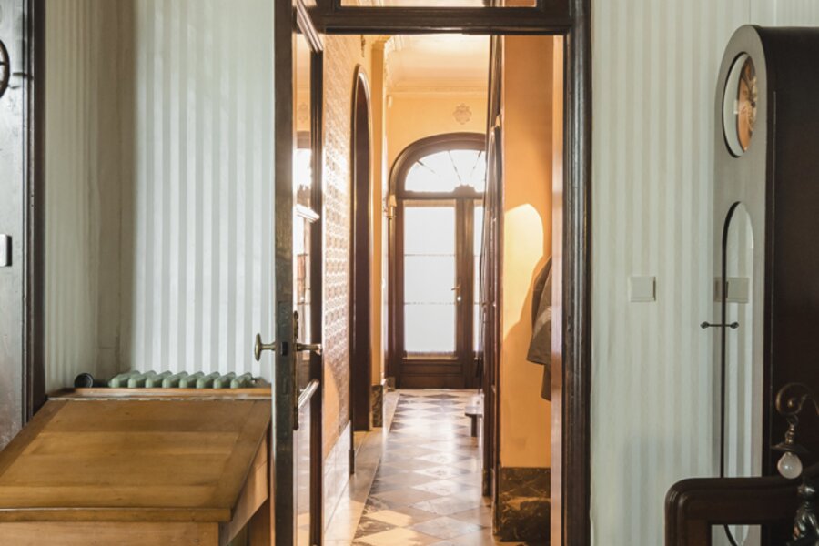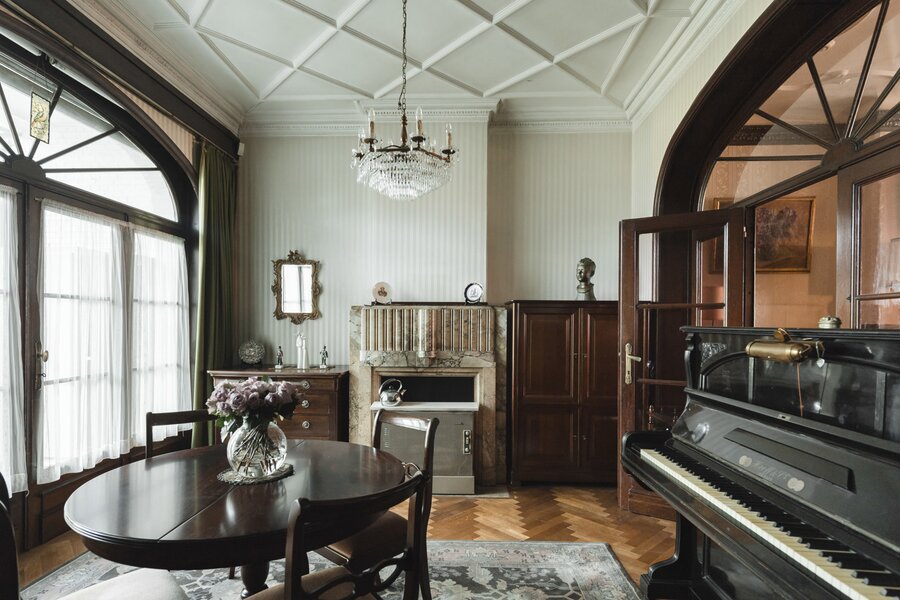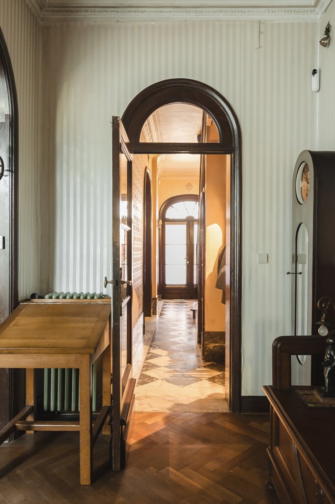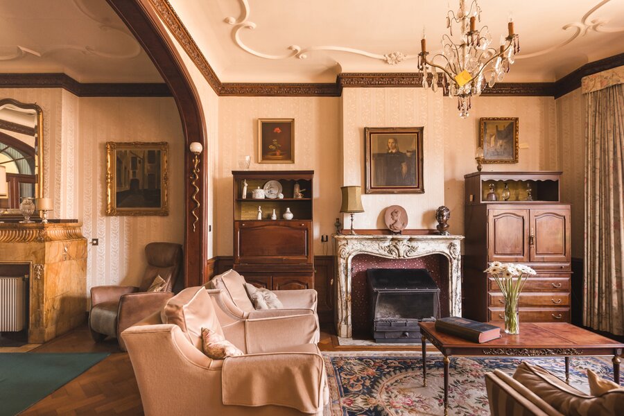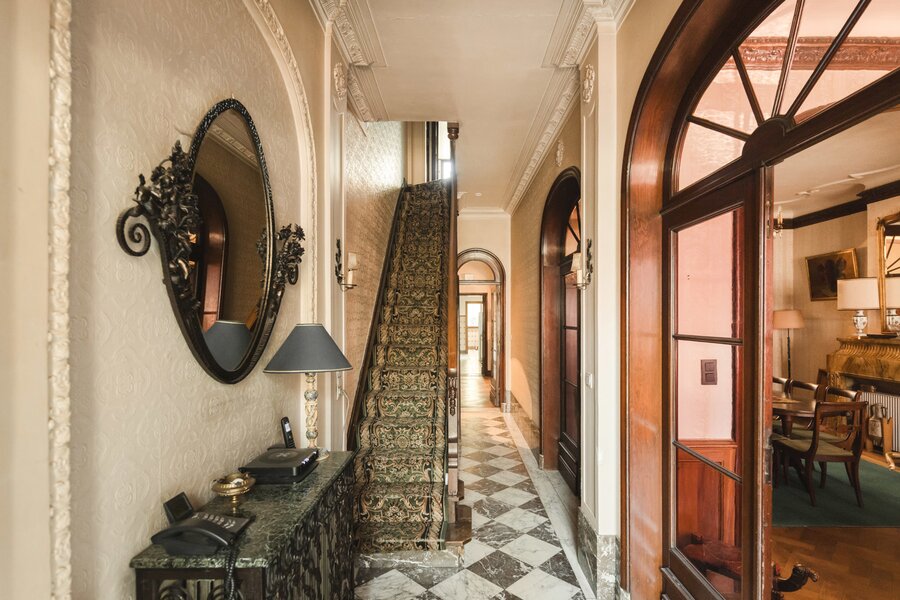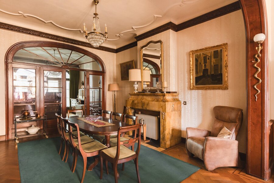 Le superbe magnolia du jardin avant donne immédiatement le ton : élégance et raffinement se prolongent à l’intérieur, où le vestibule en marbre, le parquet à chevrons, les hauts plafonds et les portes ornées murmurent les histoires du passé. Dans le salon, la lumière danse sur le parquet, tandis que la salle à manger attenante et la véranda invitent à de longues conversations face au jardin orienté à l’ouest — un havre de paix intime et verdoyant.