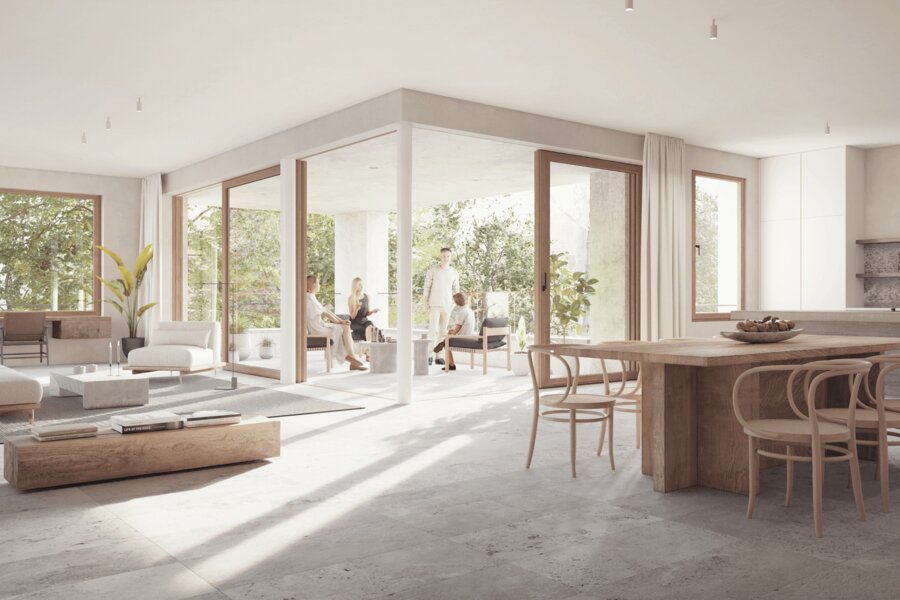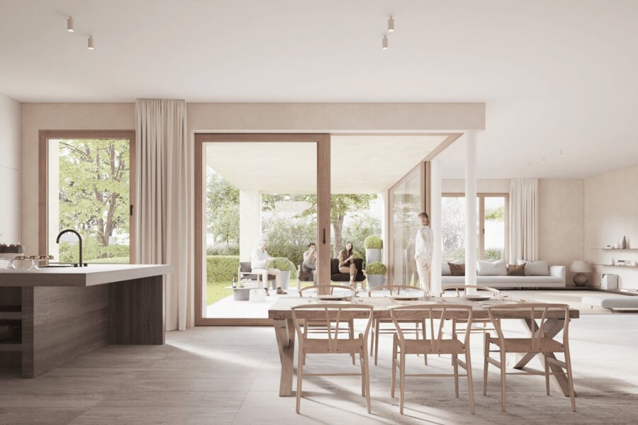 Binnen geniet u van een ongekend ruimtelijk gevoel, dankzij plafondhoogtes van meer dan 3 meter en leefruimtes met raampartijen langs 3 zijden.