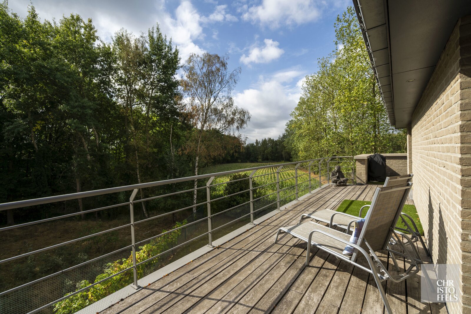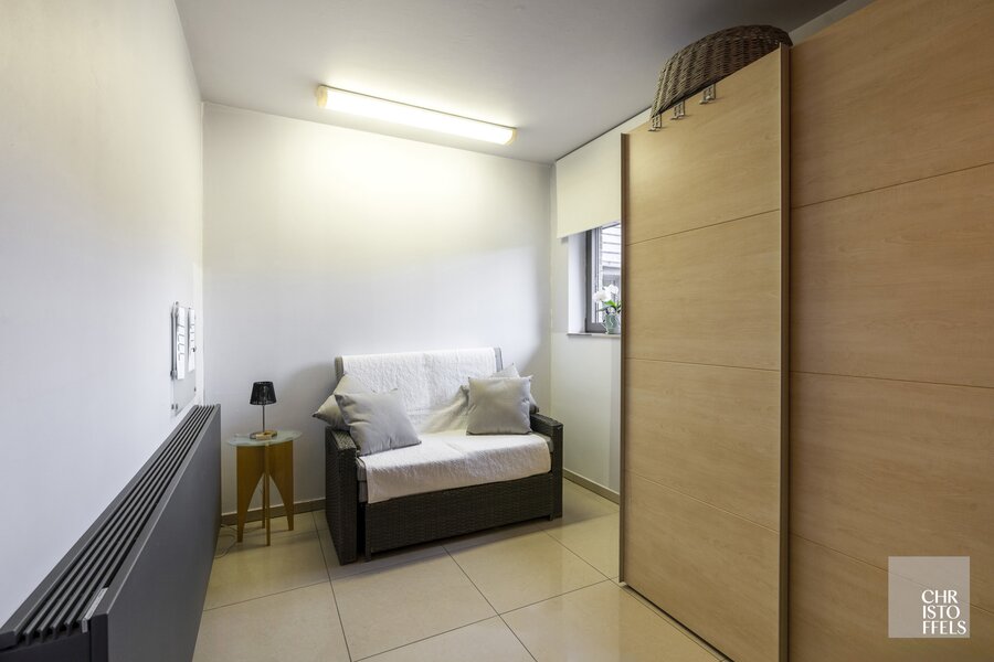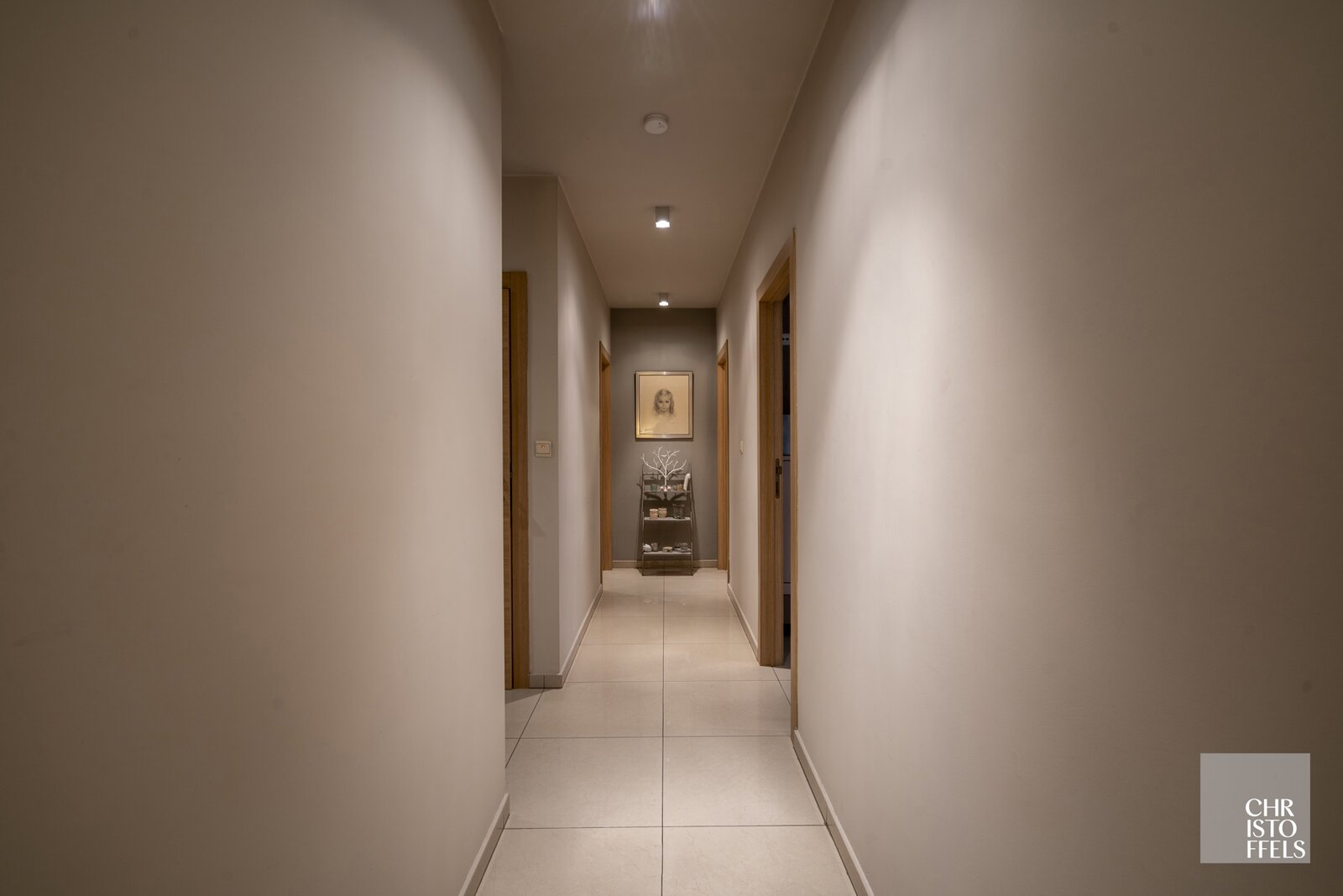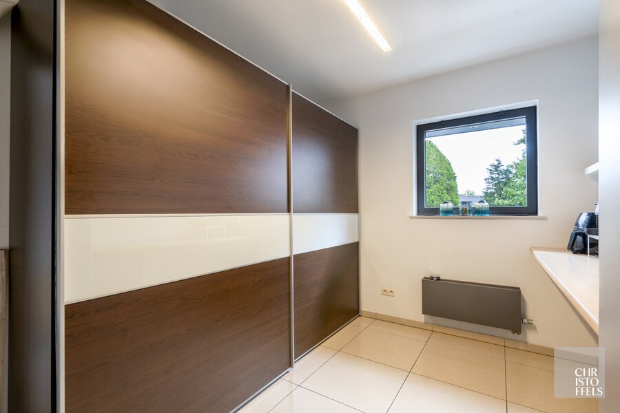 De inkomhal met vestiaire en gastentoilet geeft toegang tot een bureau aan de ene zijde en tot het leefgedeelte aan de andere zijde. Dit leefgedeelte omvat een ruime eetkamer en een gezellige zithoek met gashaard, die naadloos aansluiten op de lichtrijke leefkeuken. Deze keuken is volledig uitgerust met maatwerk kasten. Grenzend aan de keuken bevindt zich een handige berging en bovendien is er een rechtstreekse toegang tot de lift. Aansluitend ligt een royale wasplaats met douchekamer die uitkomt bij de buitenjacuzzi, een ideale plek voor ontspanning.