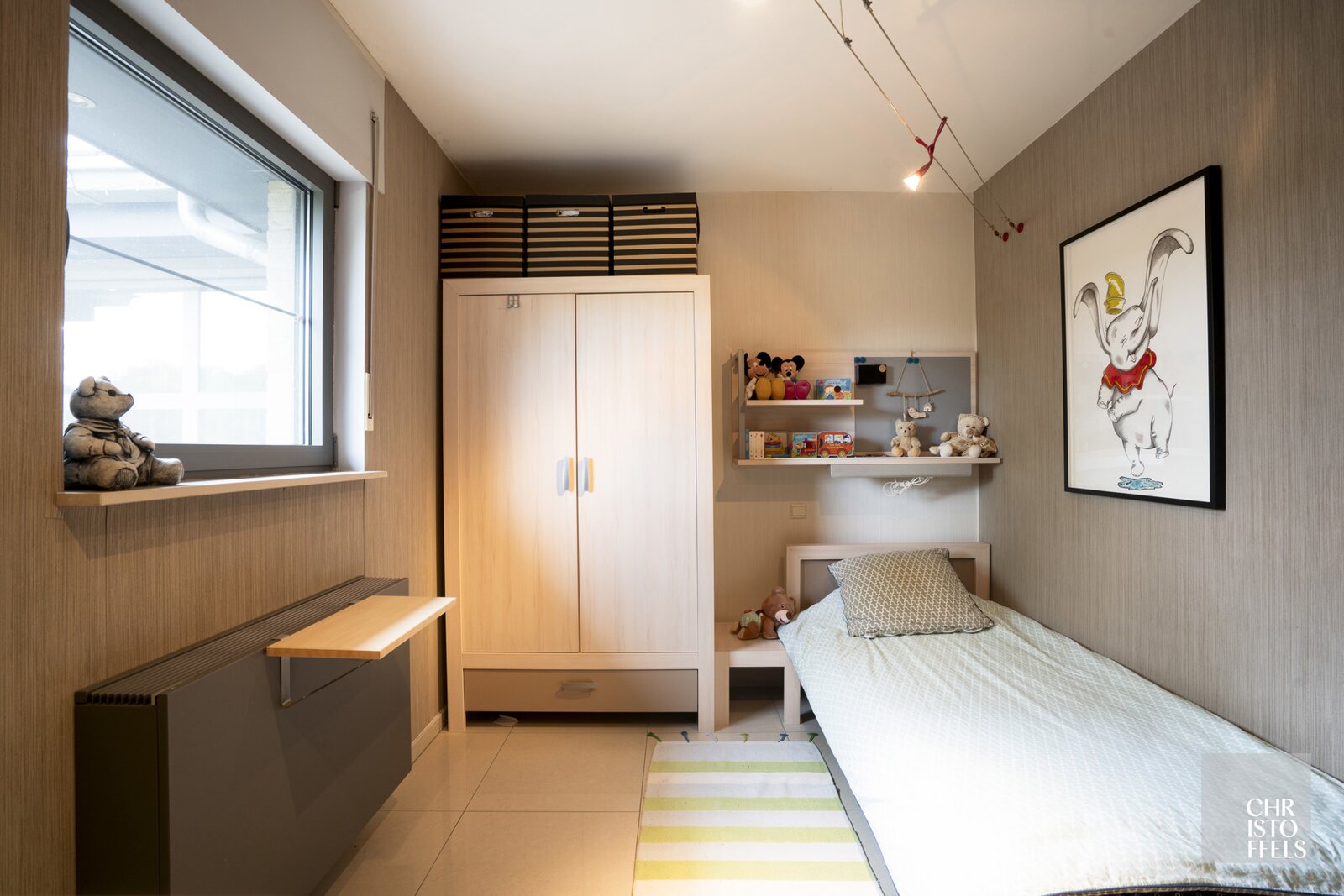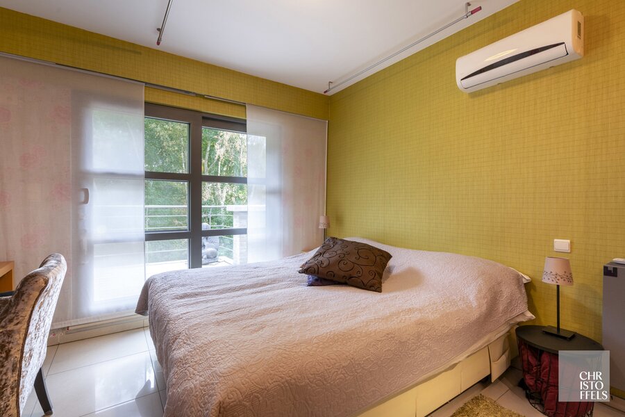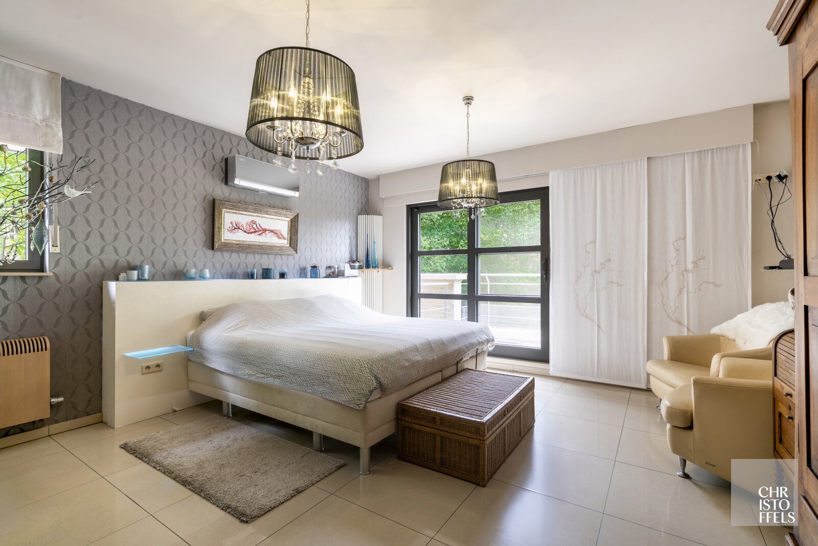 Het nachtgedeelte biedt een master bedroom en drie bijkomende slaapkamers, elk voorzien van rolluiken voor optimaal comfort. Verder zijn er een apart toilet, een extra berging, een inloopdressing en twee badkamers.