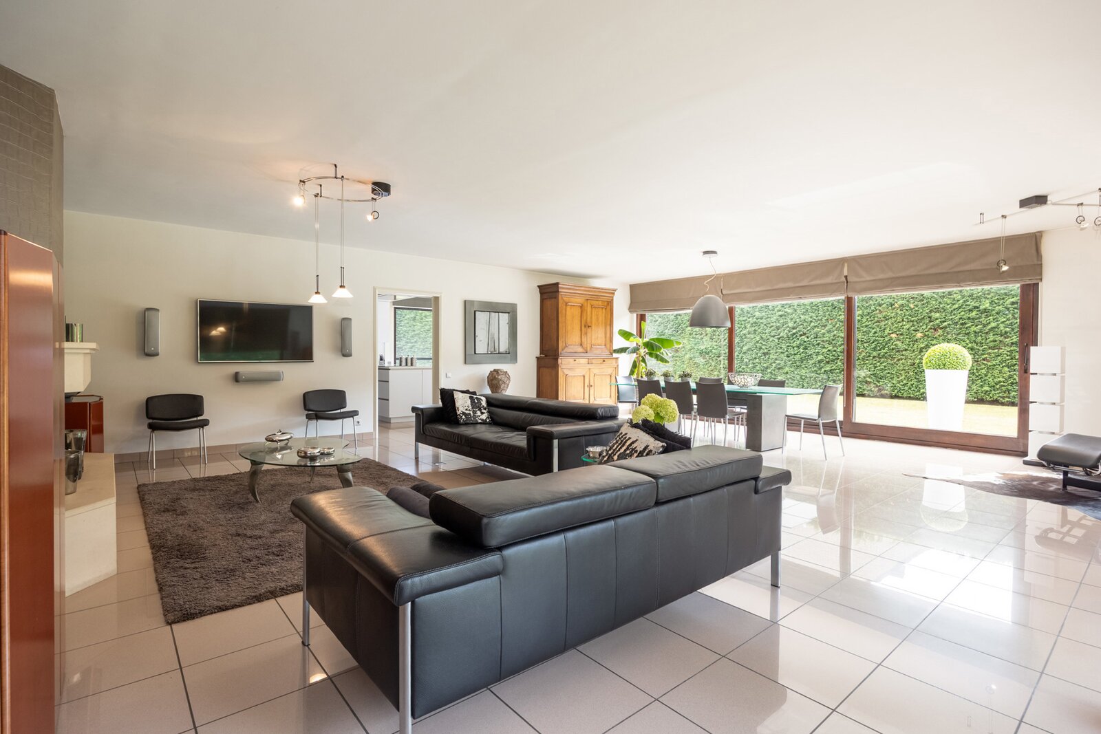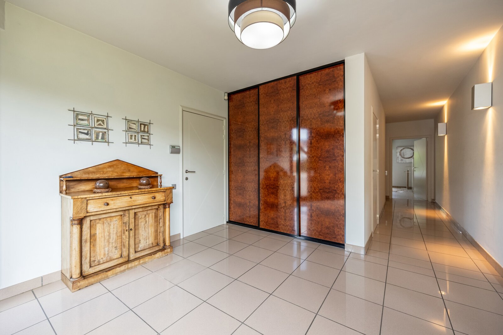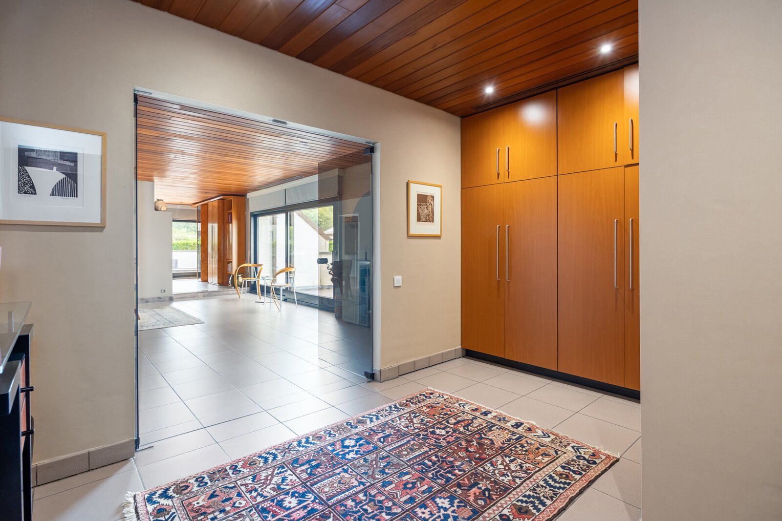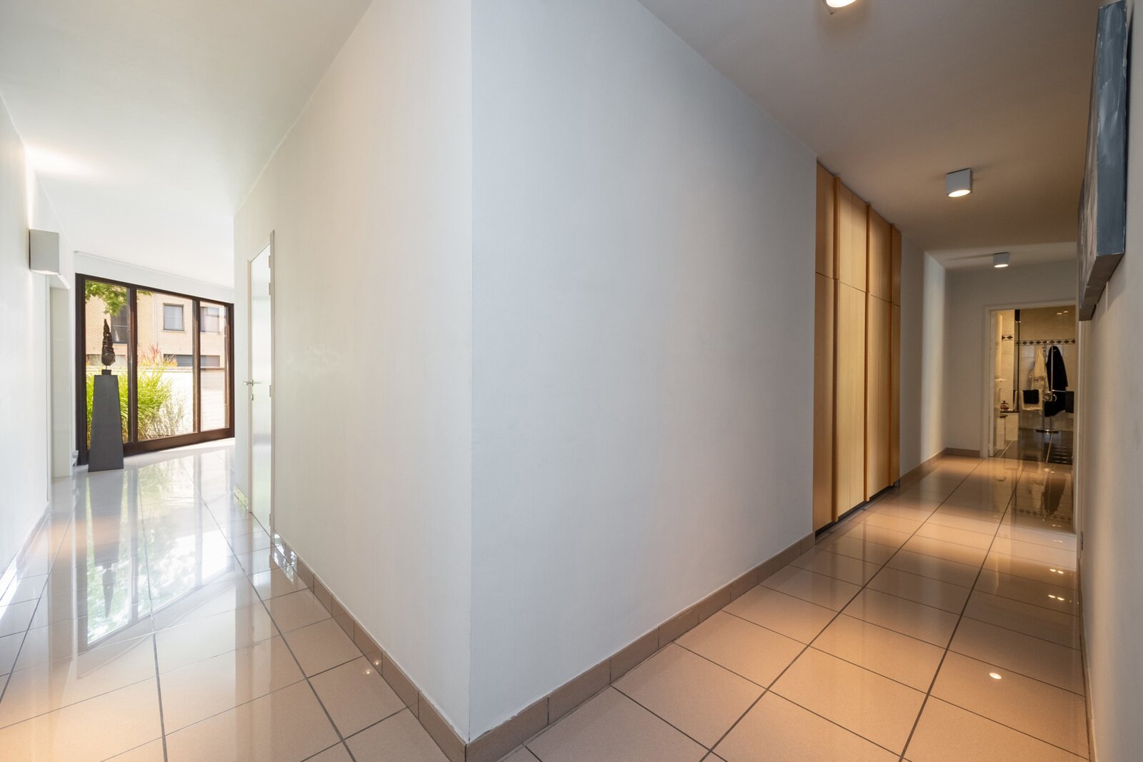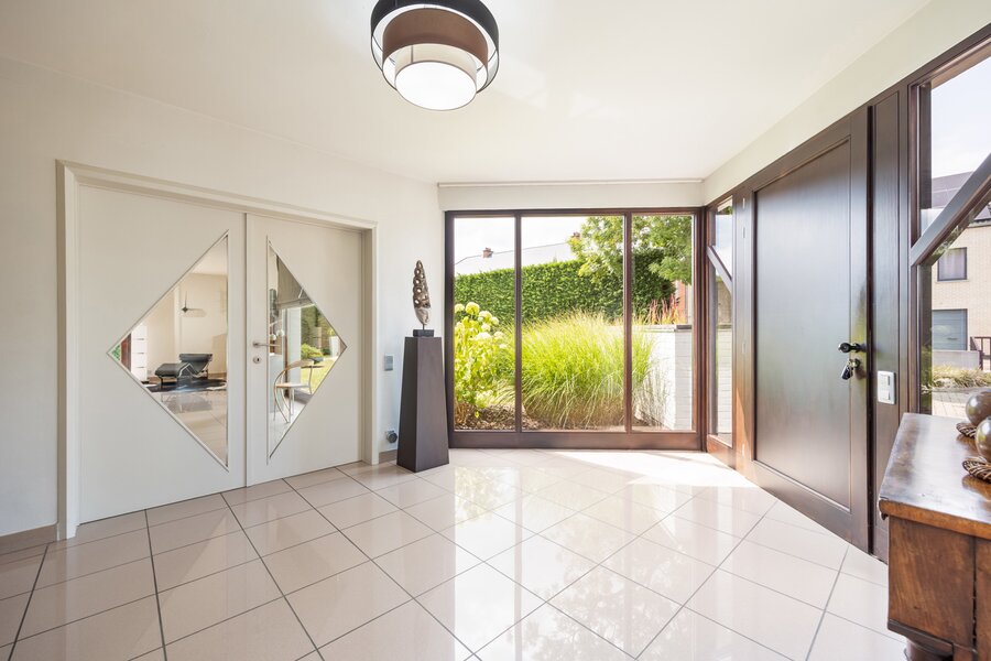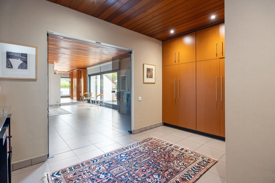 De woning beschikt over twee volwaardige wooneenheden en twee busnummers. Bij binnenkomst langs de rechterzijde word je verwelkomd door een grote inkomhal, die de toon zet voor de rest van de woning. Ruimte, lichtinval en zicht op de tuin staan hier centraal.