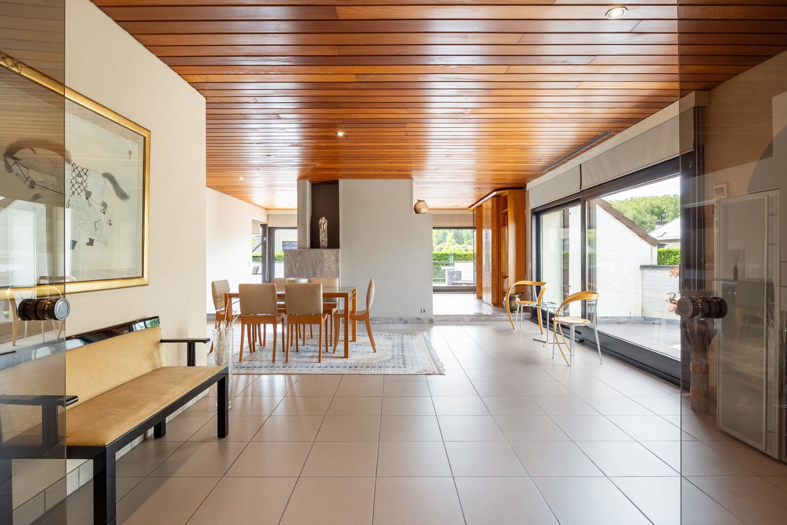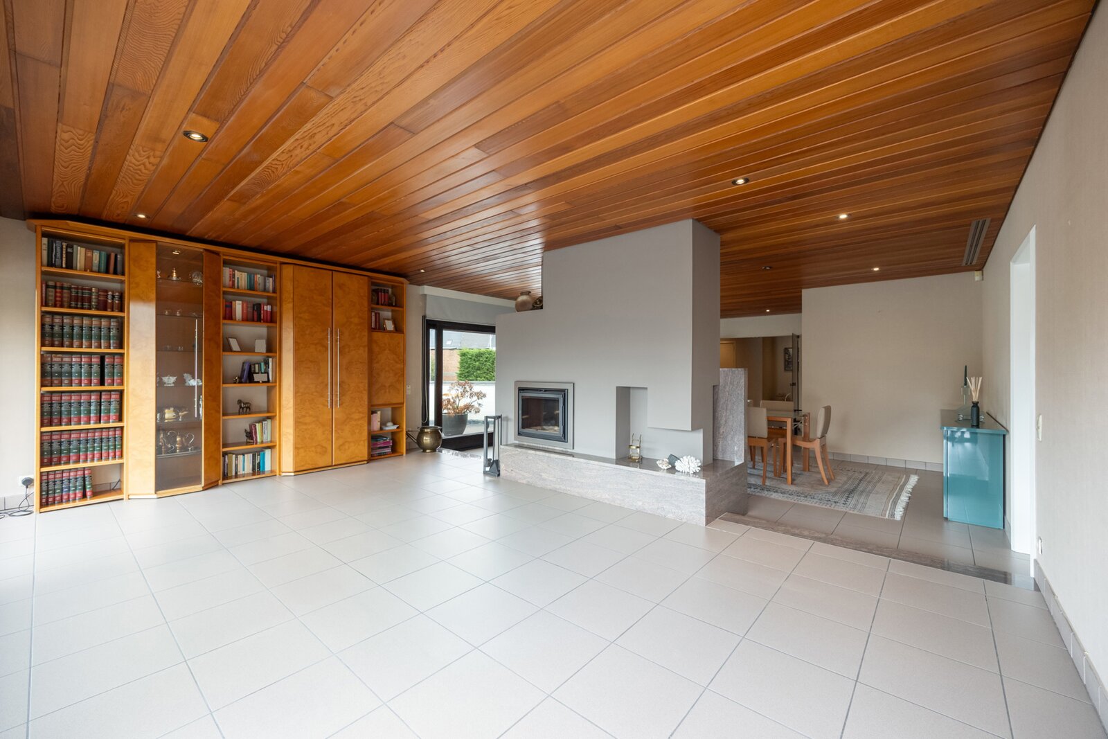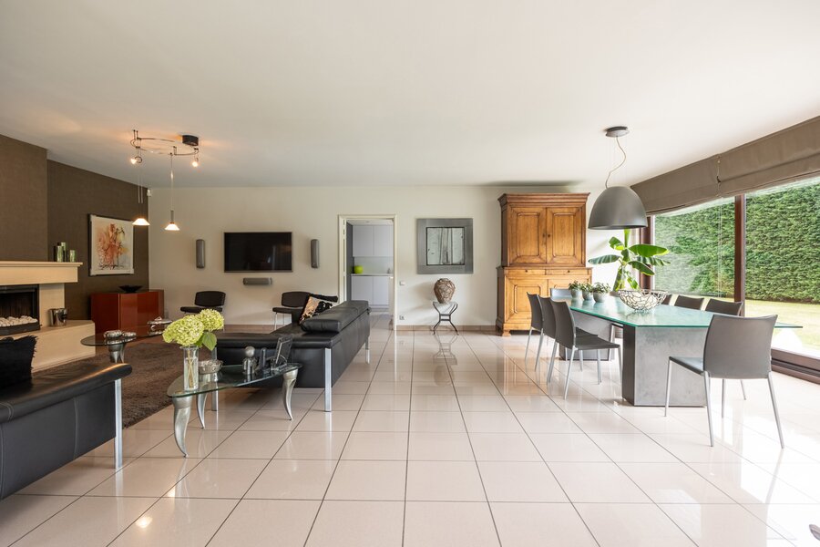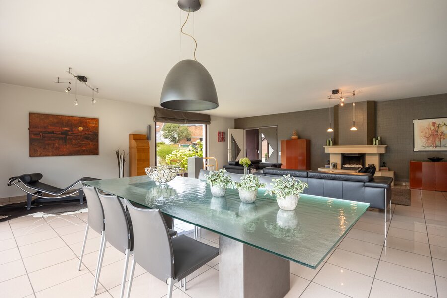 De woonkamer is bijzonder ruim en biedt plaats voor een grote eettafel en dito salon, gezelligheid troef, in de winter mede dankzij de haard maar altijd op een aangename temperatuur dankzij de vloerverwarming.