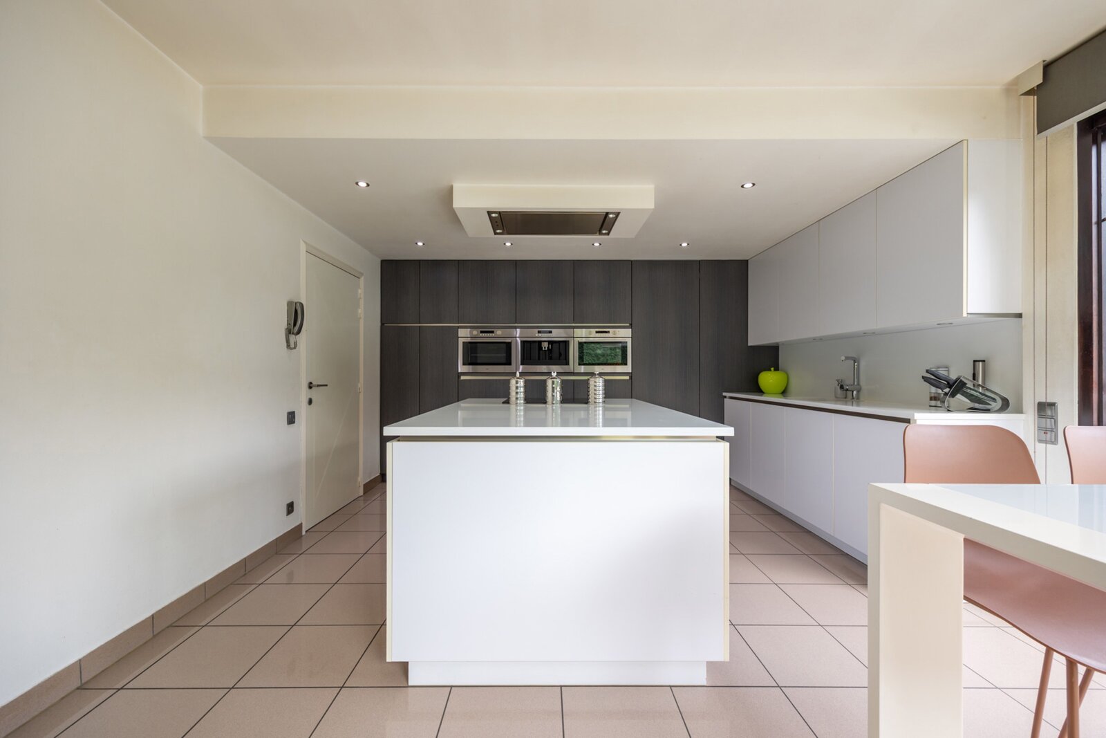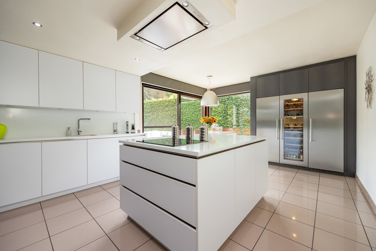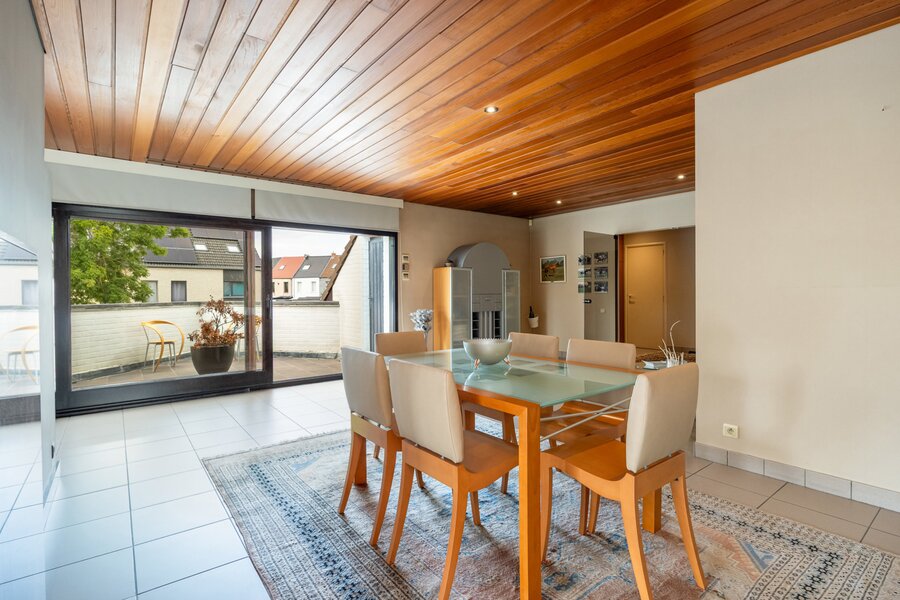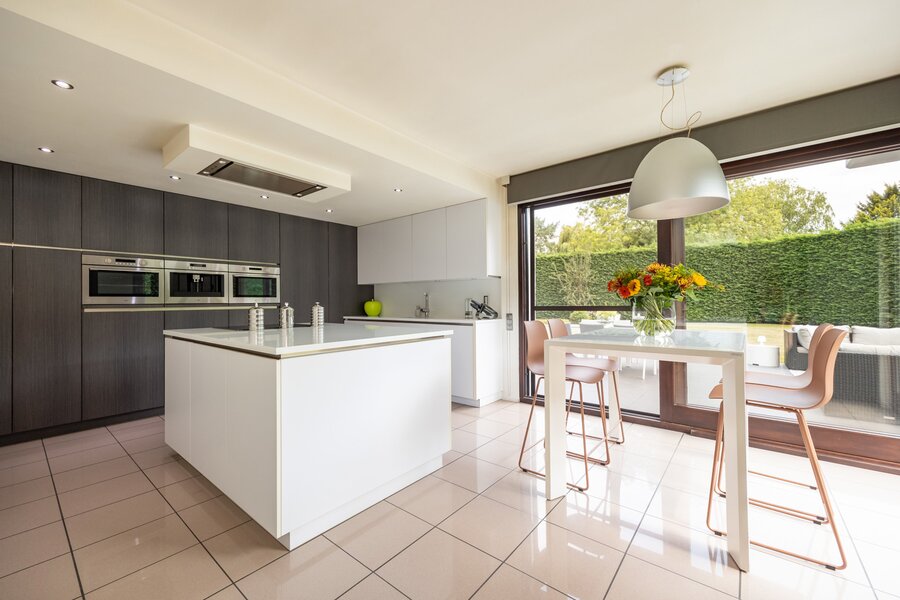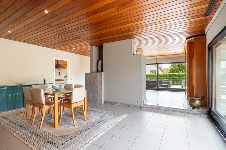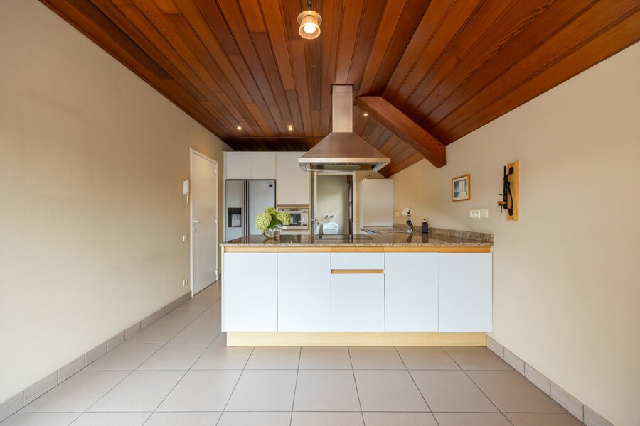 Aangrenzend bevindt zich een vernieuwde keuken, die tip top is uitgerust ook met een wijnkoeler en koffiemachine. De keuken is een zalige plek voor elke hobbykok en geeft uit op een ruim terras waar het heerlijk vertoeven is; een hapje en een drankje zijn nooit veraf.