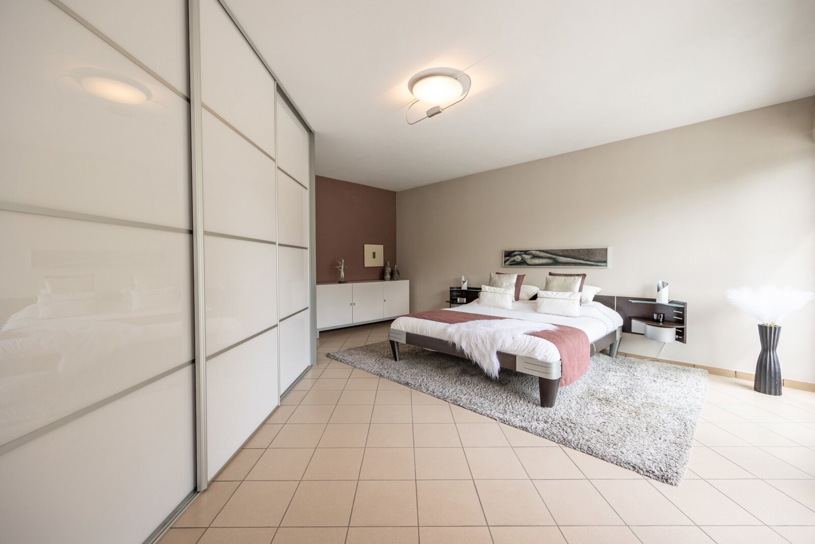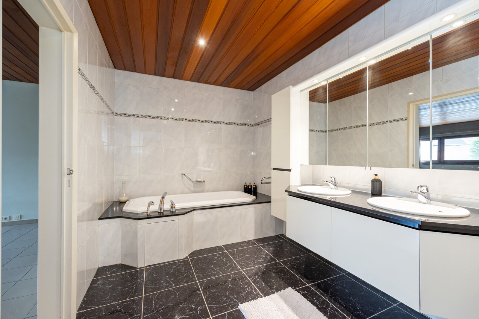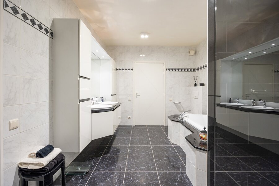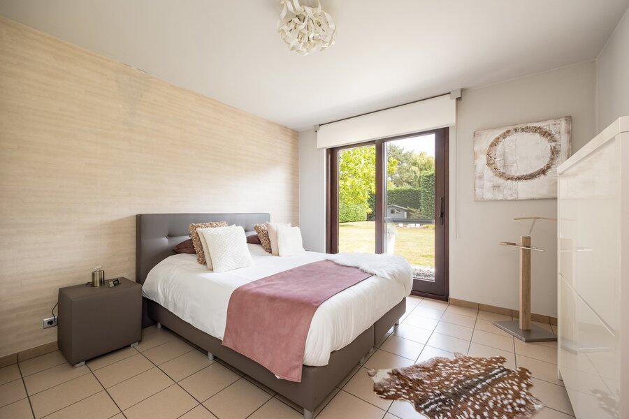 Verder bevinden zich in dit woongedeelte op de benedenverdieping drie volwaardige slaapkamers. Eén van deze slaapkamers, de master bedroom, beschikt over een eigen badkamer. Deze is voorzien van een dubbel lavabomeubel, een ligbad, een ruime inloopdouche en een toilet. Daarnaast is er nog een extra badkamer op het gelijkvloers met een enkel lavabomeubel en een douche.