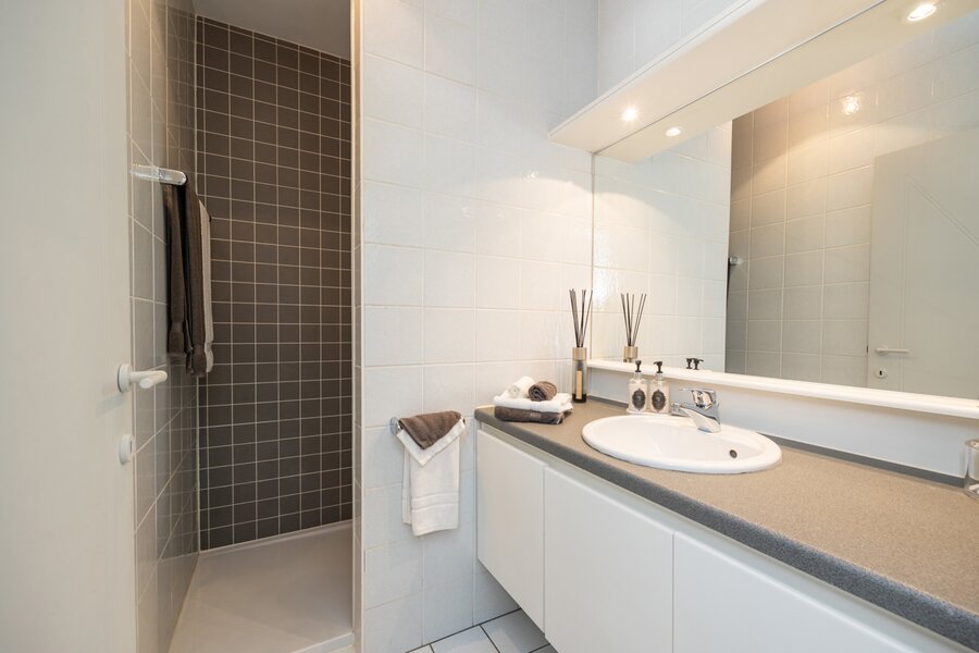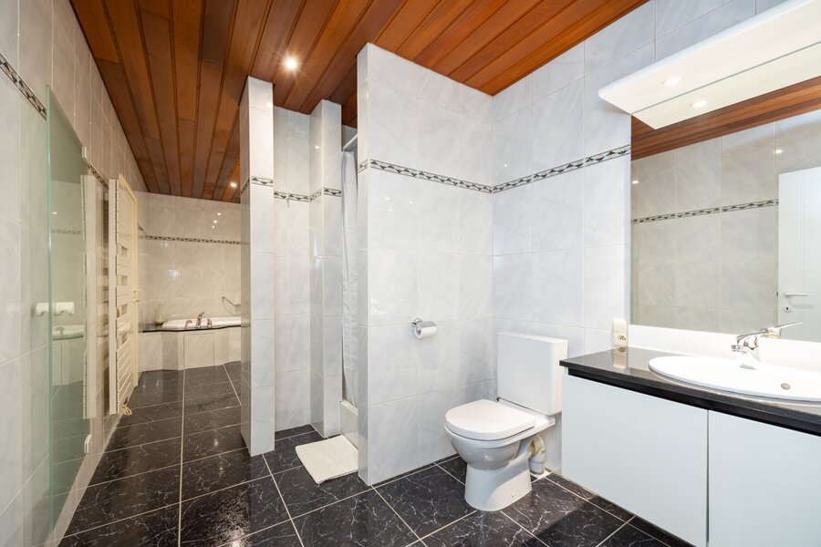 Op deze verdieping vind je ook twee volwaardige slaapkamers en twee badkamers: één met een enkel lavabomeubel, ligbad, douche en toilet, en een andere met een enkel lavabomeubel en douche.