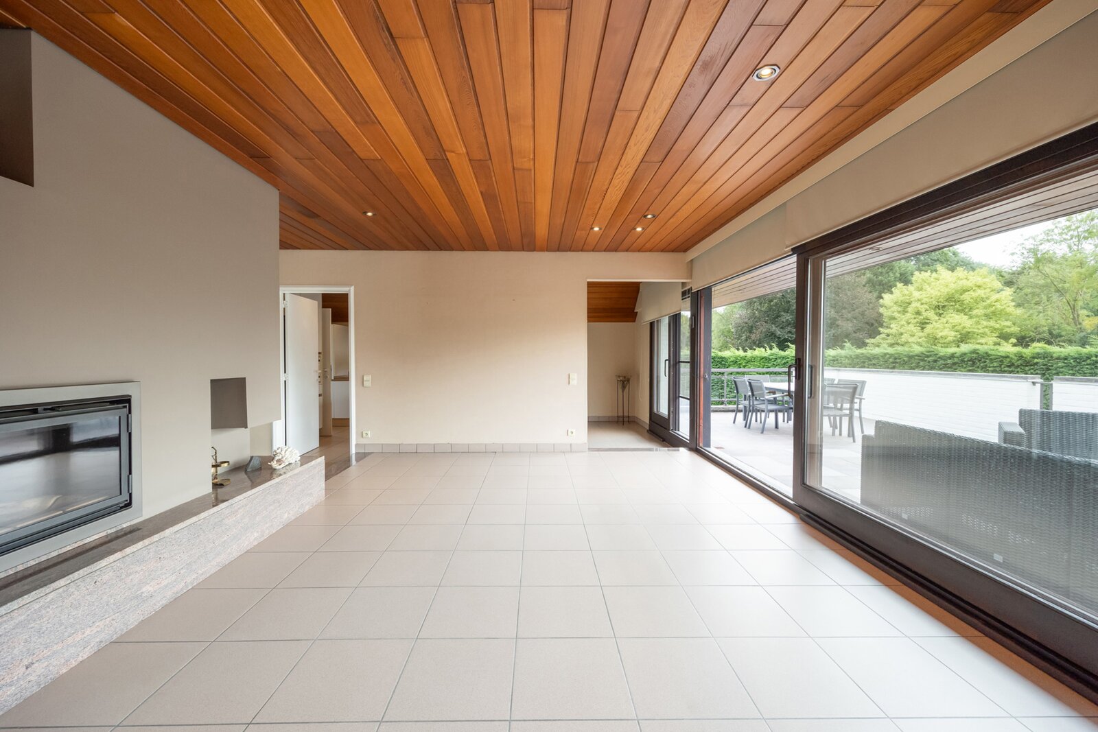 Een trap brengt je naar de eerste verdieping, hier treffen we een inkomhal met gastentoilet alsook praktische ingemaakte kasten. Verderdoor wederom een grote leefruimte met een gezellige haard en veel natuurlijk licht, dankzij de grote ramen die uitgeven op een ruim terras.
