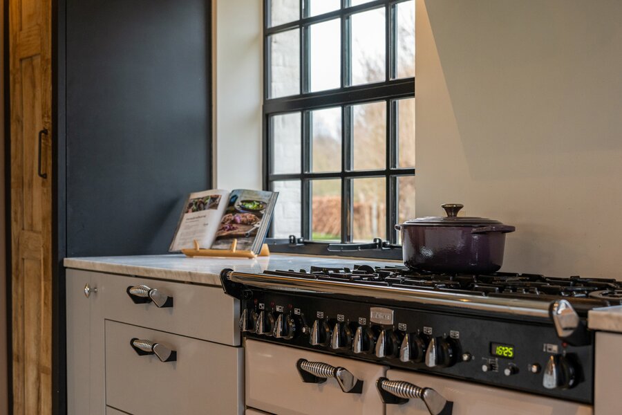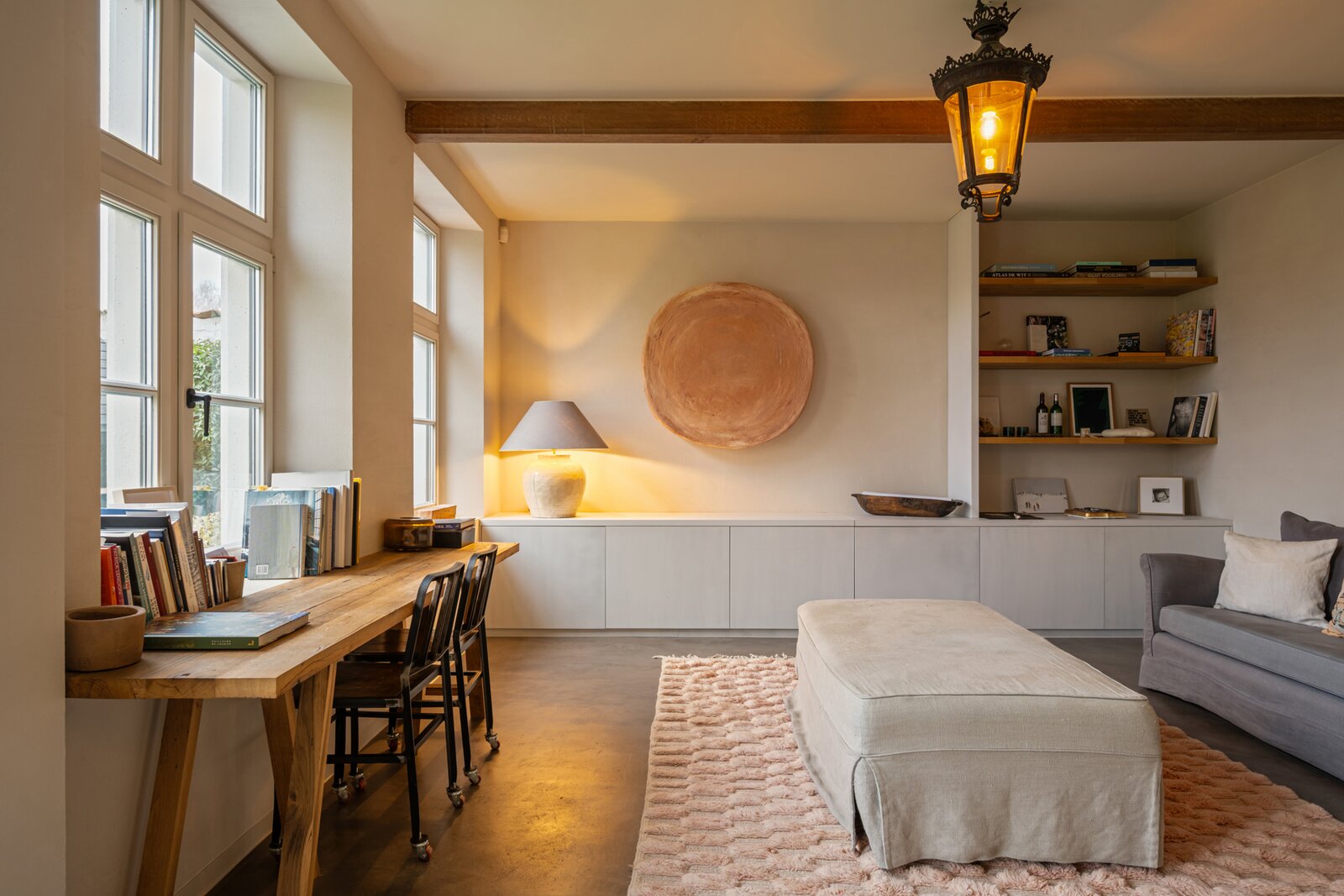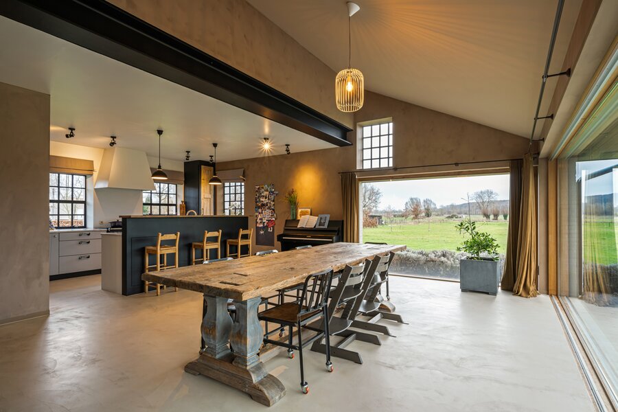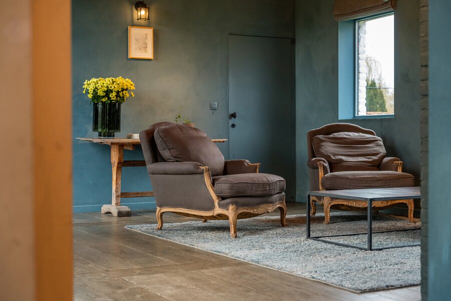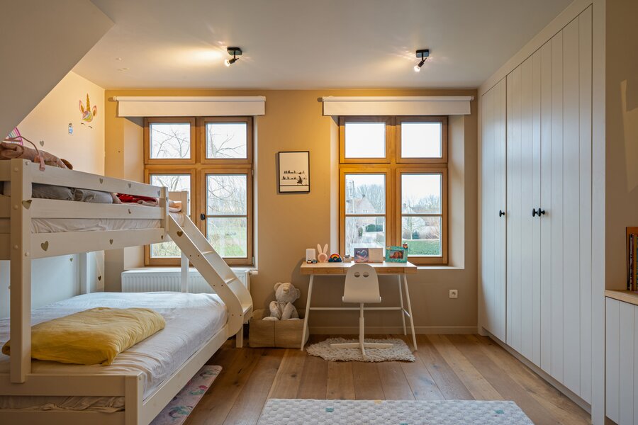 Op het gelijkvloers vormt de open keuken samen met de eetplaats het hart van de woning. Dankzij de grote raampartijen geniet u hier van een prachtig uitzicht op de oude abdijsite en het omliggende open landschap. De keuken is volledig geïnstalleerd en uitgerust met een stijlvol Falcon-toestel. Aansluitend is er een ruime zitplaats met open haard en authentiek plafond, die zorgen voor een warme en gezellige sfeer. Tot slot is er een aparte lees- of bureauruimte met eigen toegang.