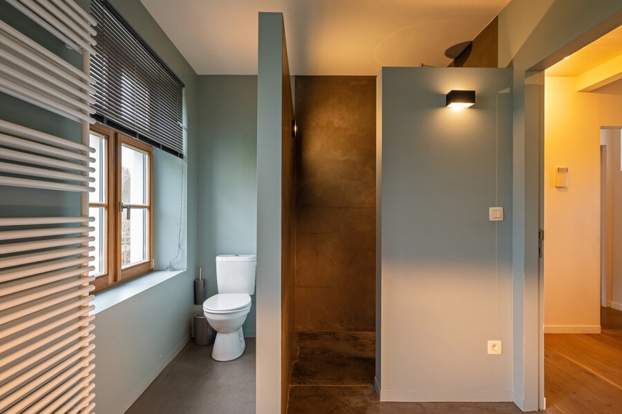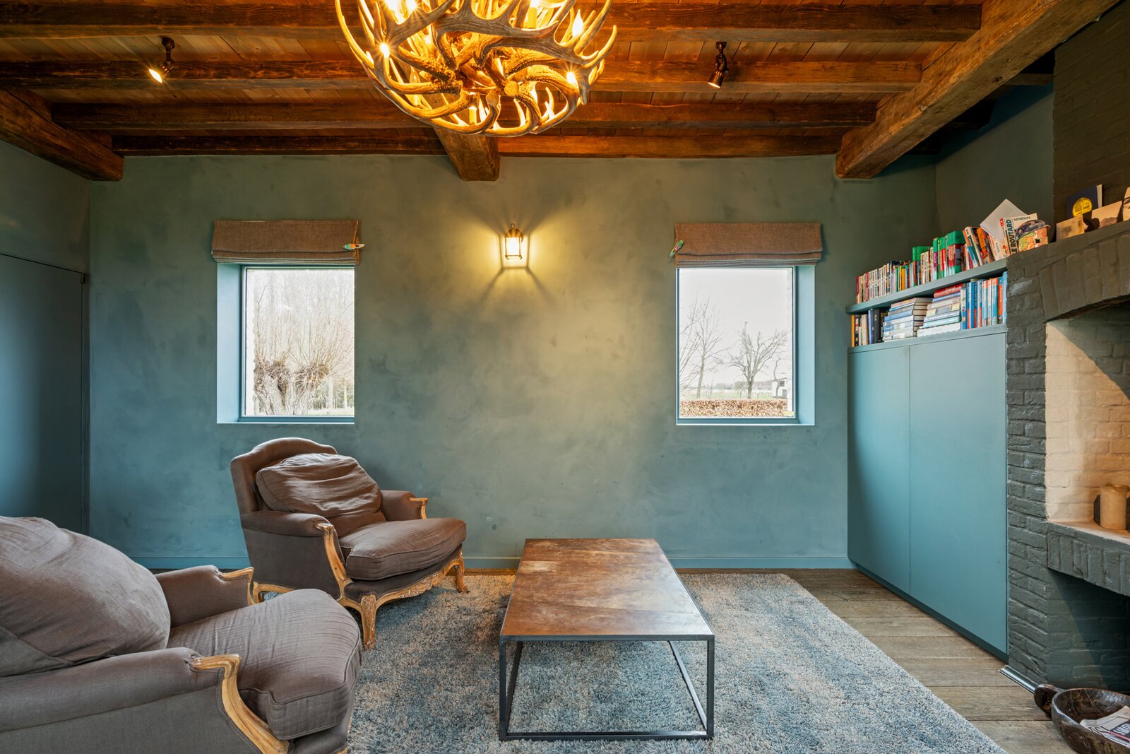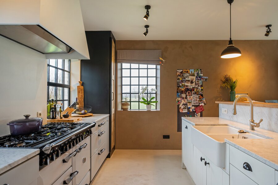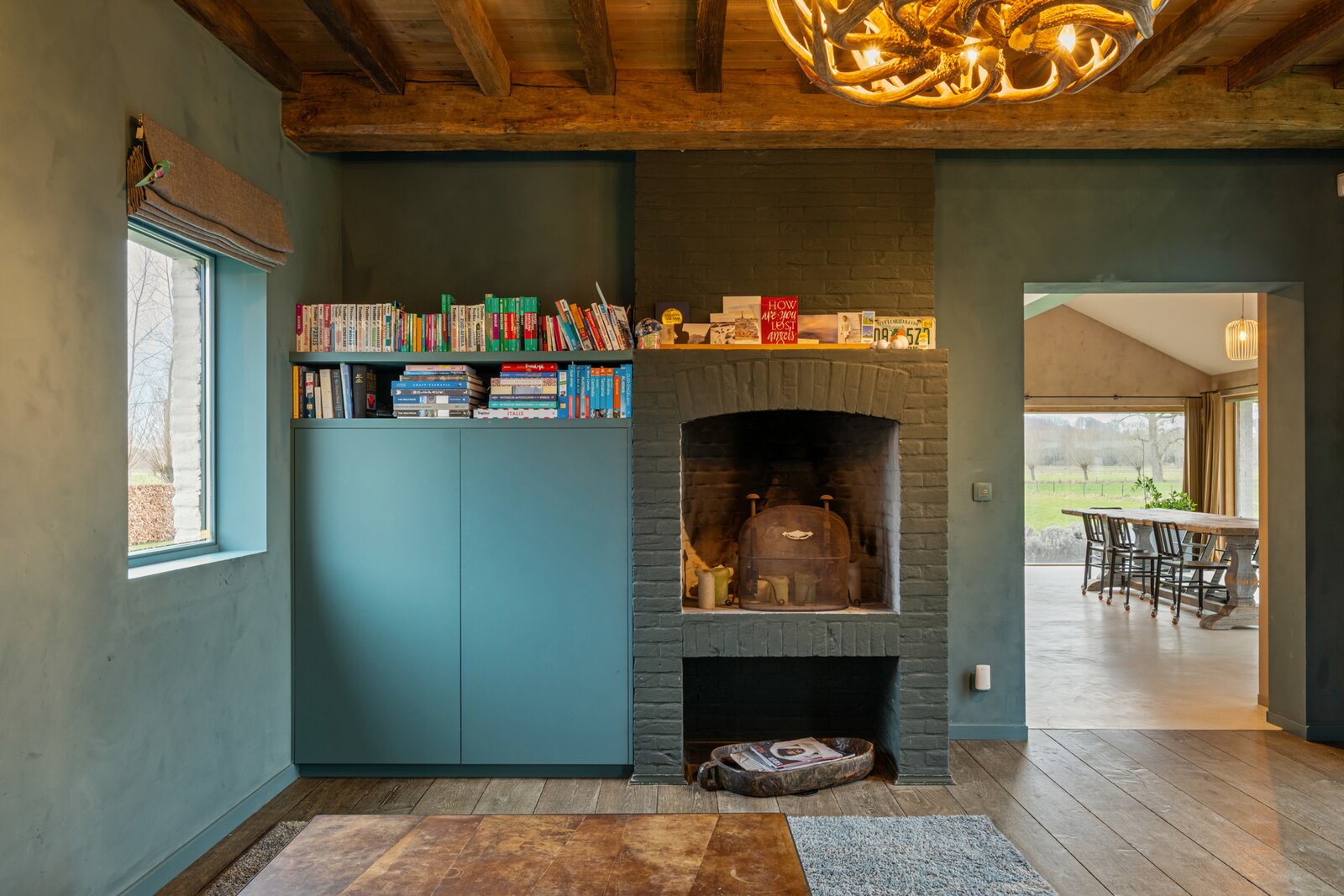Op het gelijkvloers vormt de open keuken samen met de eetplaats het hart van de woning. Dankzij de grote raampartijen geniet u hier van een prachtig uitzicht op de oude abdijsite en het omliggende open landschap. De keuken is volledig geïnstalleerd en uitgerust met een stijlvol Falcon-toestel. Aansluitend is er een ruime zitplaats met open haard en authentiek plafond, die zorgen voor een warme en gezellige sfeer. Tot slot is er een aparte lees- of bureauruimte met eigen toegang.