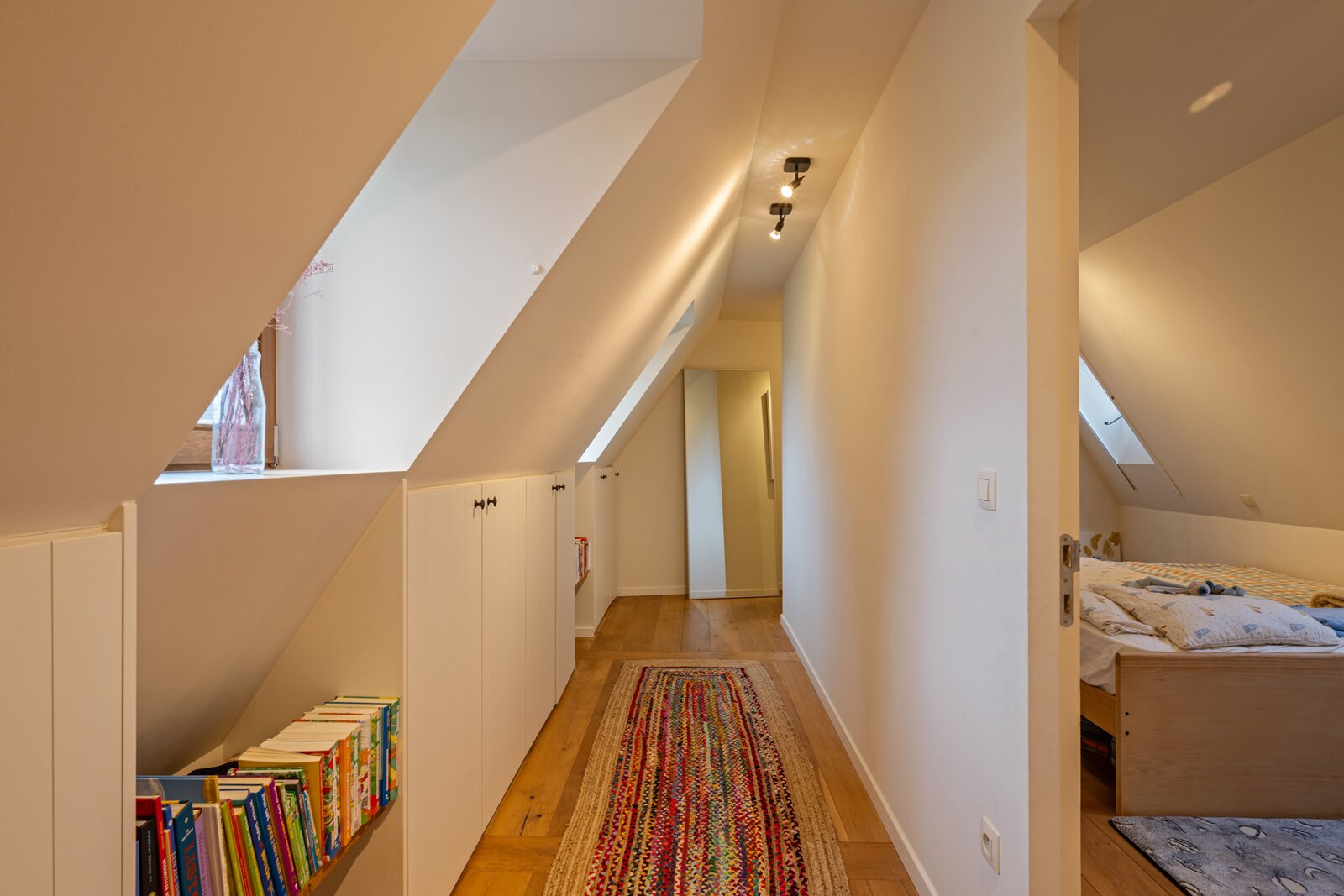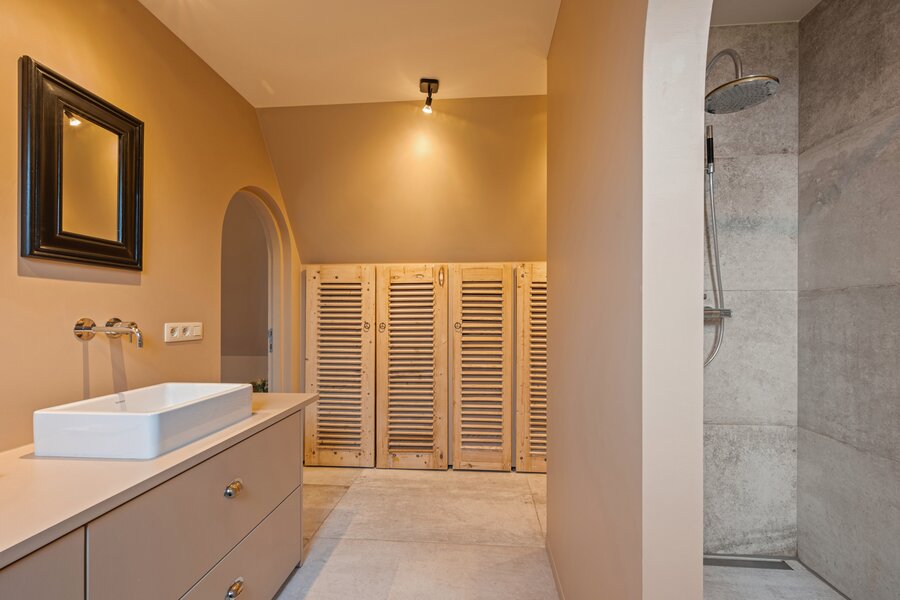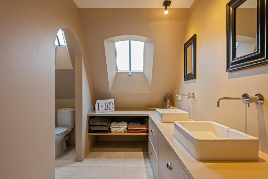 Op de eerste verdieping sluit de masterbedroom aan op een eigen badkamer, die voorzien is van een dubbele lavabo, douche en toilet. Verder zijn er nog twee ruime slaapkamers, alsook een ruime tweede badkamer met bad, douche, dubbele lavabo en toilet. De tweede verdieping biedt plaats voor een multifunctionele ruimte en een vierde slaapkamer.