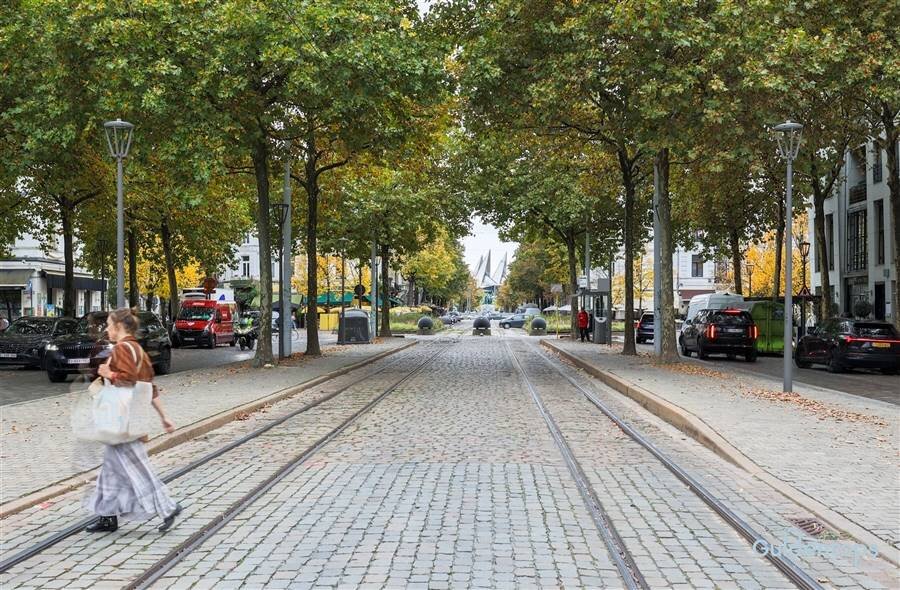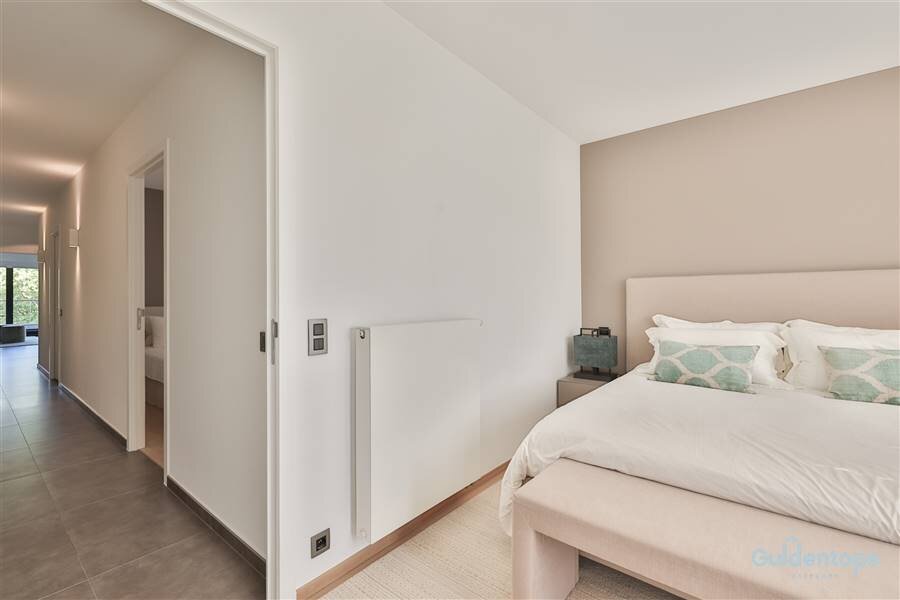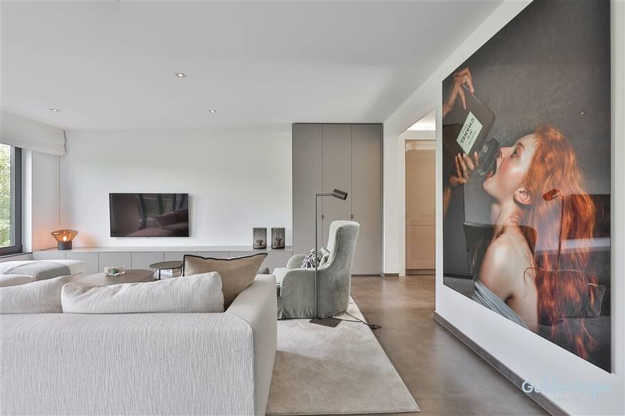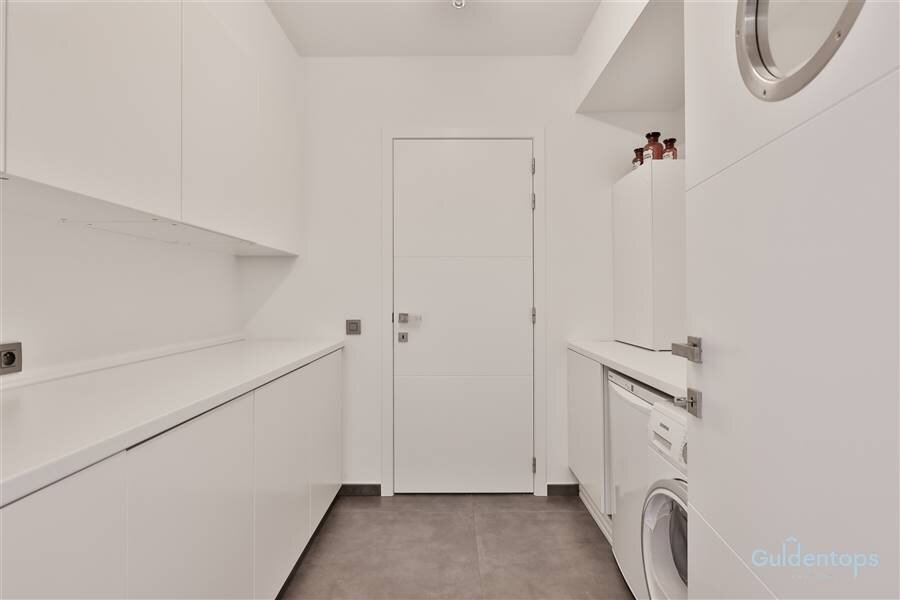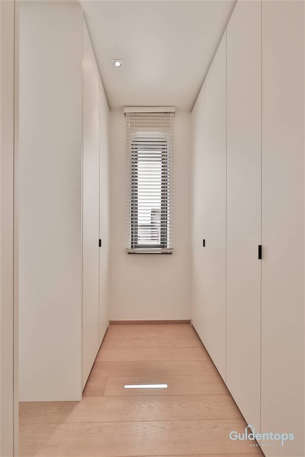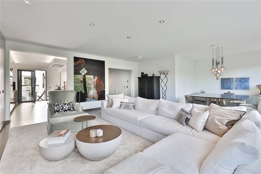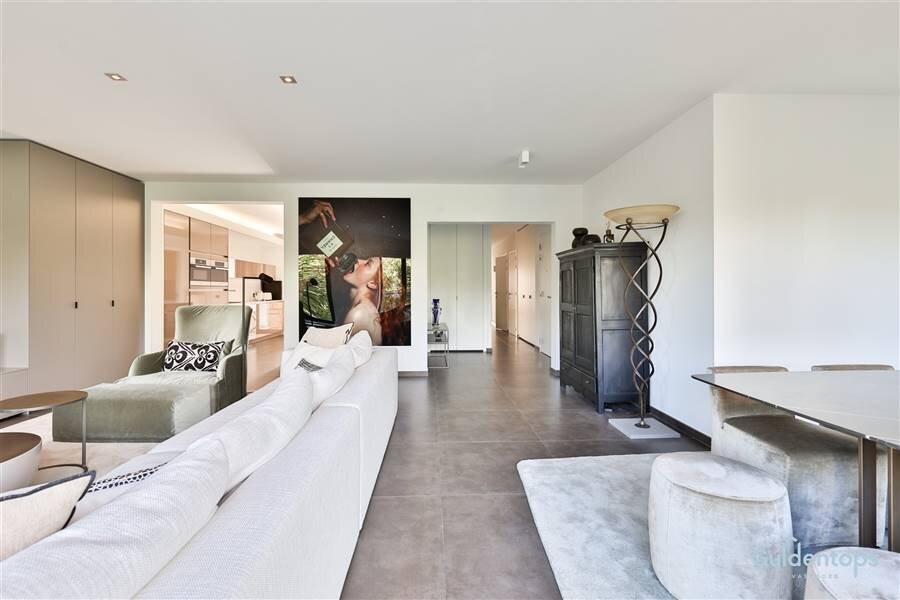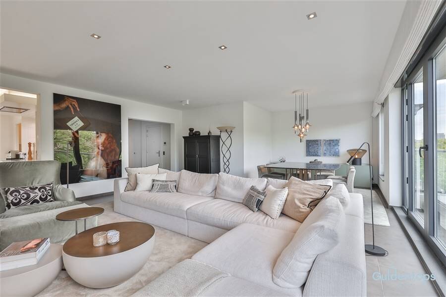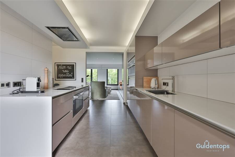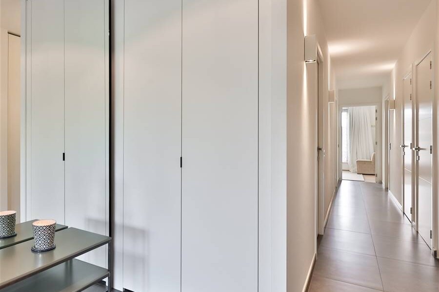 De indrukwekkende leefruimte vormt het hart van het appartement en biedt een zee van licht dankzij de grote raampartijen. De op maat gemaakte meubelwand met geïntegreerde tv-opstelling creëert een strak en tijdloos interieur. De luxueuze designkeuken met hoogwaardige afwerking en topapparatuur sluit aan op een zeer ruime en praktische bijkeuken/wasplaats.