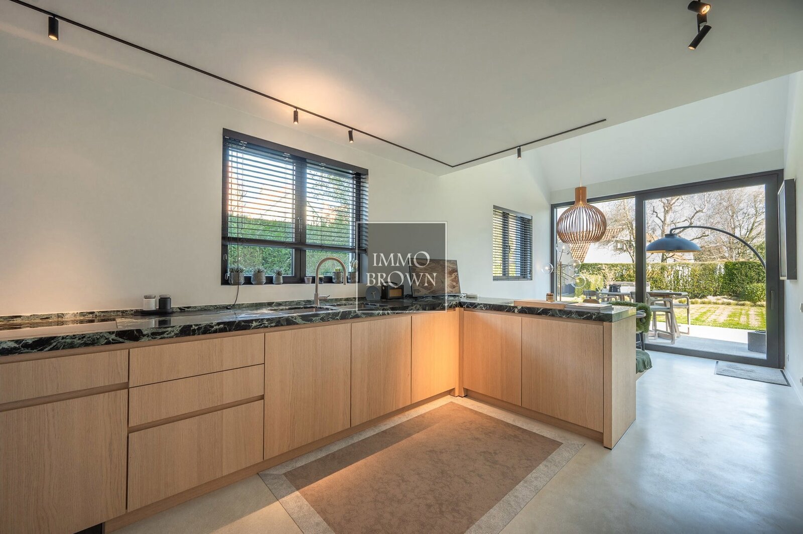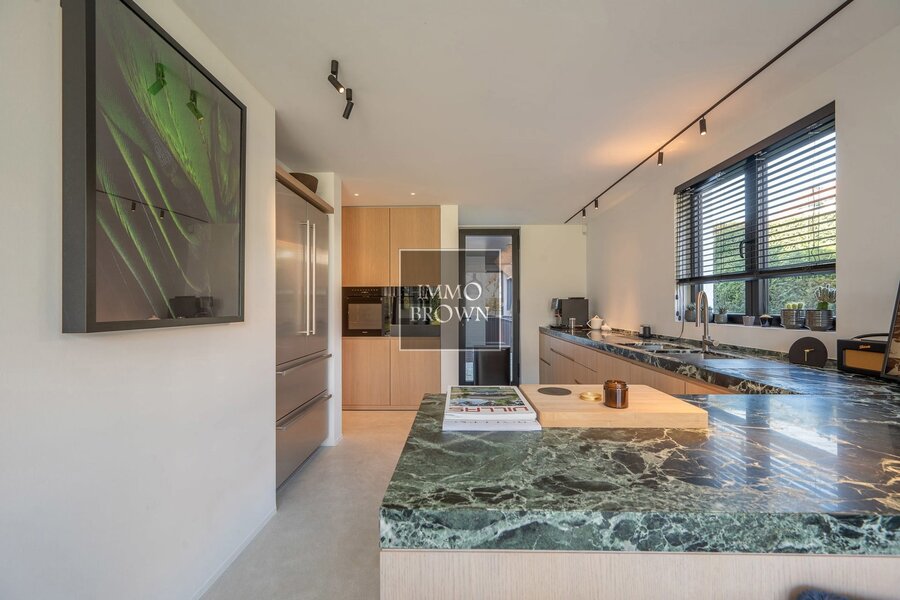 La cuisine entièrement équipée est finie avec des matériaux haut de gamme et dispose d’un coin petit-déjeuner offrant une belle vue sur le jardin. La buanderie fonctionnelle, attenante à la cuisine, est équipée de placards sur mesure.