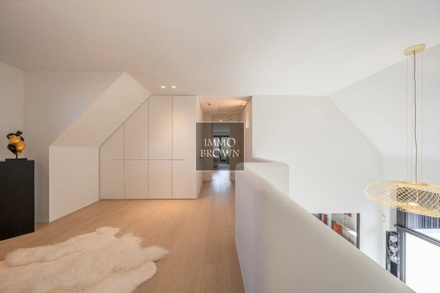 Le hall d’entrée spacieux et lumineux vous accueille avec un vestiaire élégant, un placard sur mesure, des toilettes pour invités et une cave à vin raffinée. Depuis ce hall central, vous accédez directement au séjour, à la buanderie/pratique arrière-cuisine et au garage intégré.