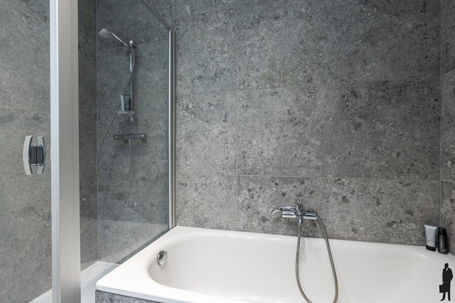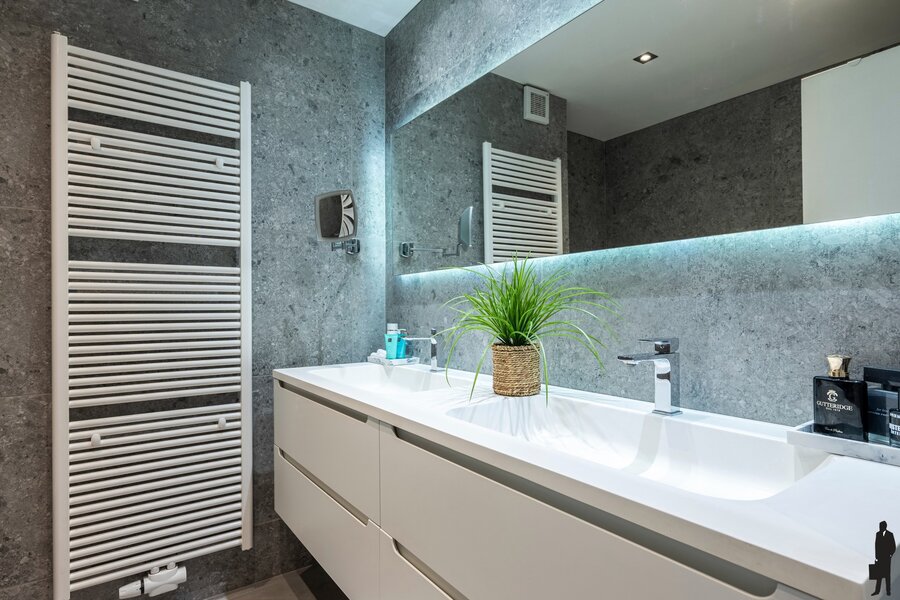 - Een volledig uitgeruste badkamer met douche, ligbad, dubbele lavabo en handdoekradiator