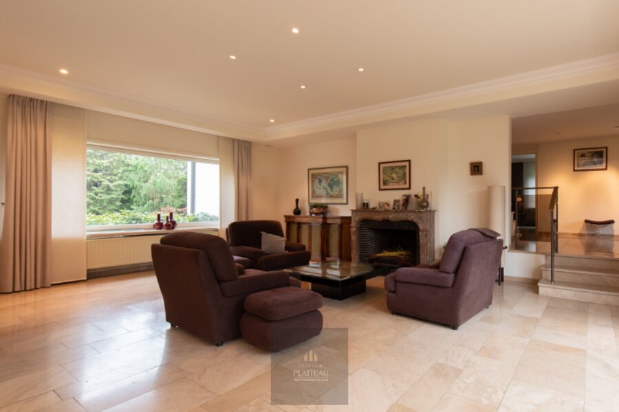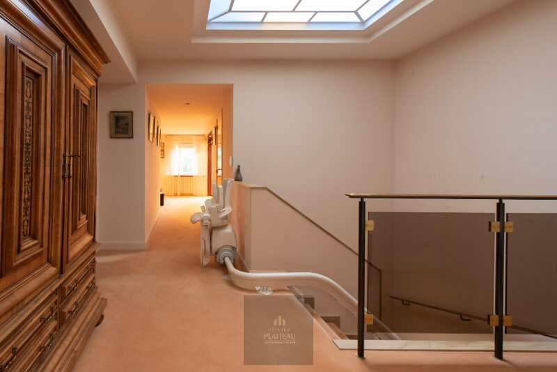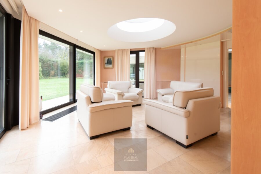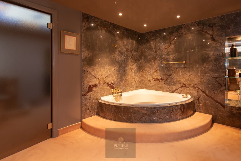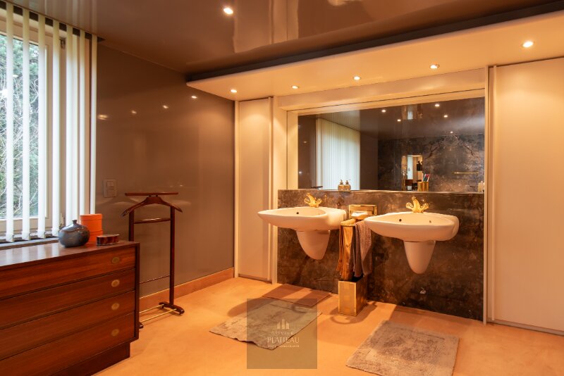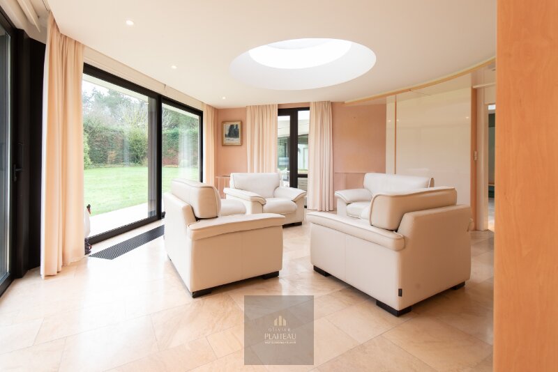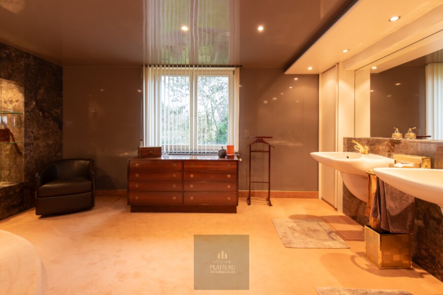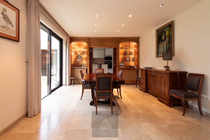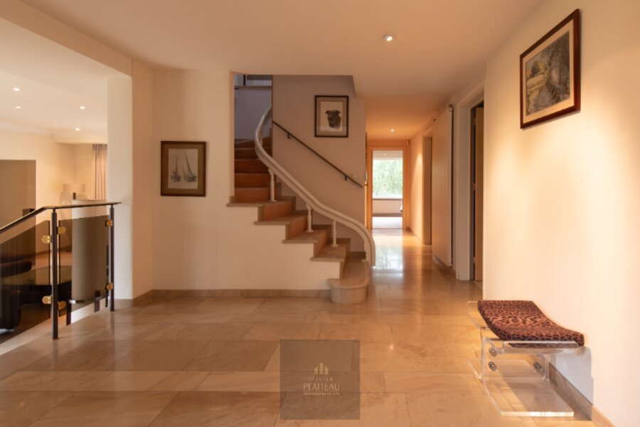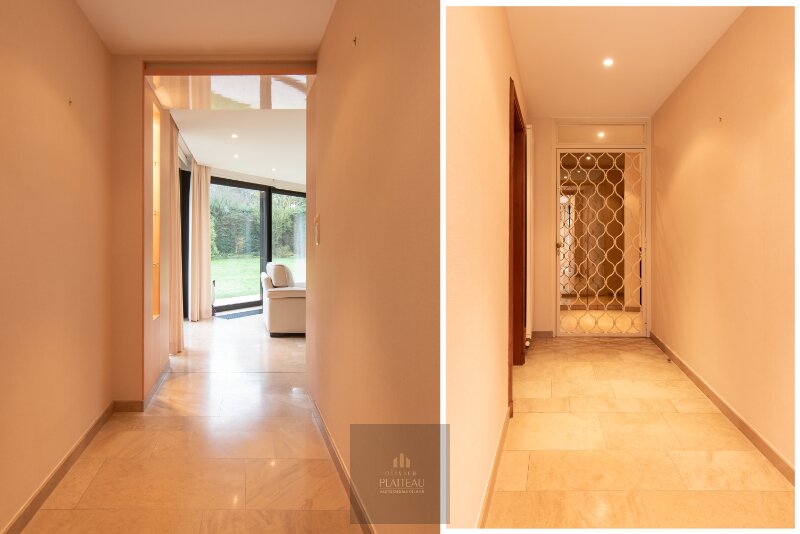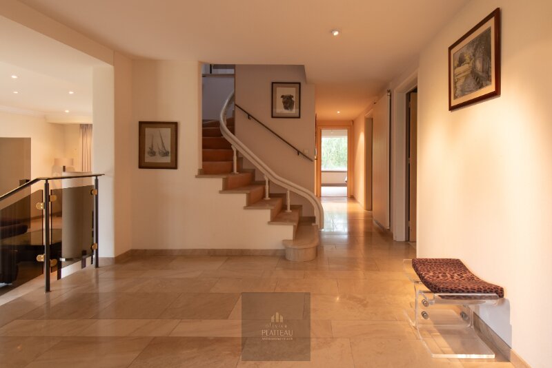 La villa vous accueille dans un hall d'entrée imposant avec vestiaire et toilettes séparées pour les invités. Le grand salon lumineux respire la classe et la chaleur et dispose d'une cheminée, d'un coin salon supplémentaire et d'une salle à manger donnant sur la cuisine semi-ouverte. Les matériaux utilisés, notamment les sols en travertin et les menuiseries en aluminium, soulignent le caractère haut de gamme et intemporel de la villa.