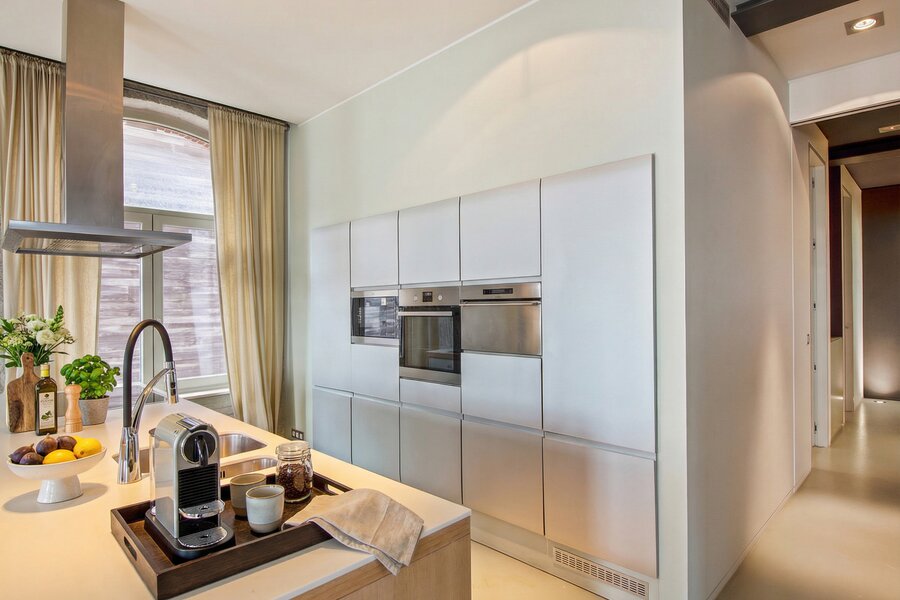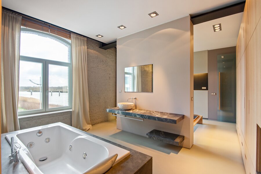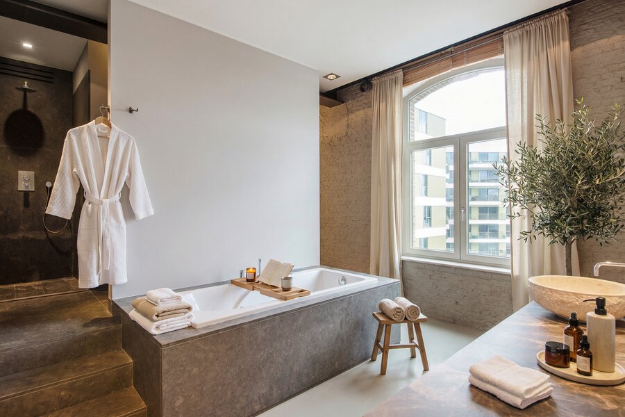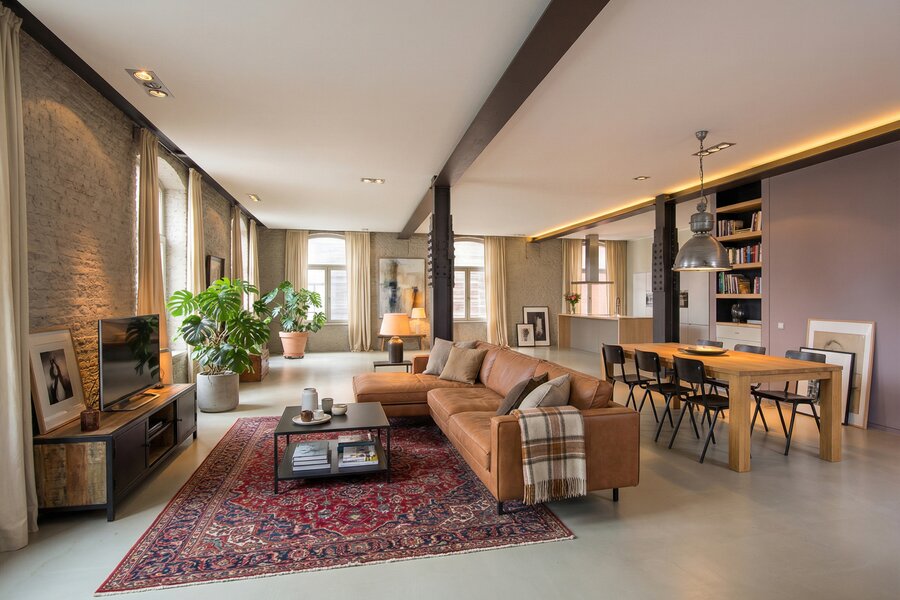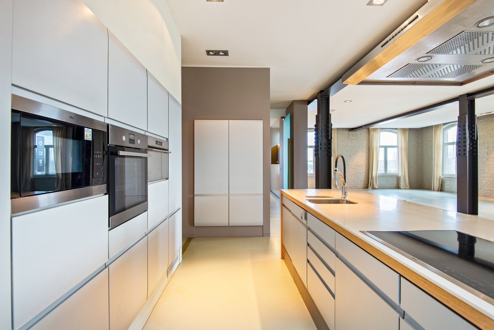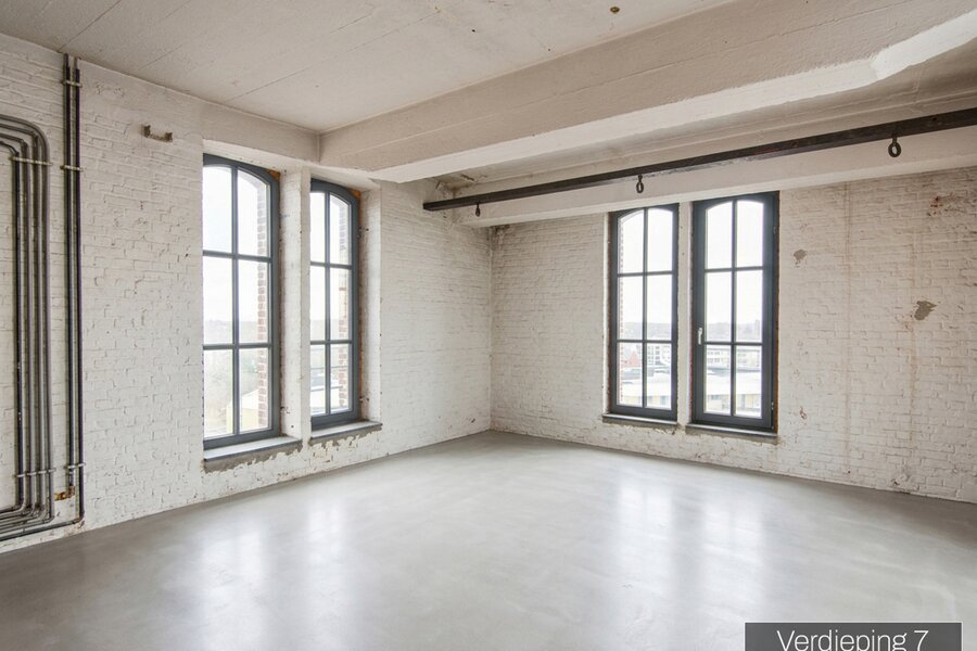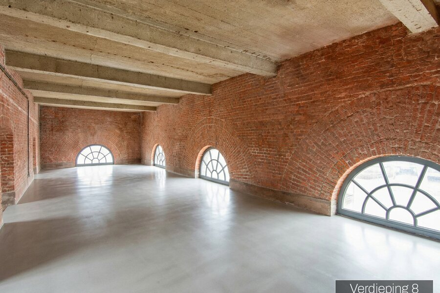 De oorspronkelijke, industriële bloemmolens Rypens dateren uit 1897. Door de eeuwen heen onderging het bakstenen complex in sobere neorenaissancestijl heel wat upgrades en transformaties. Deze loft op de tweede verdieping is goed voor 254 m² bewoonbare oppervlakte en biedt frontaal zicht op het water. Op de zevende en achtste verdieping (in de “toren”) vinden we bovendien nog twee (privatieve) polyvalente ruimtes met schitterende vergezichten.