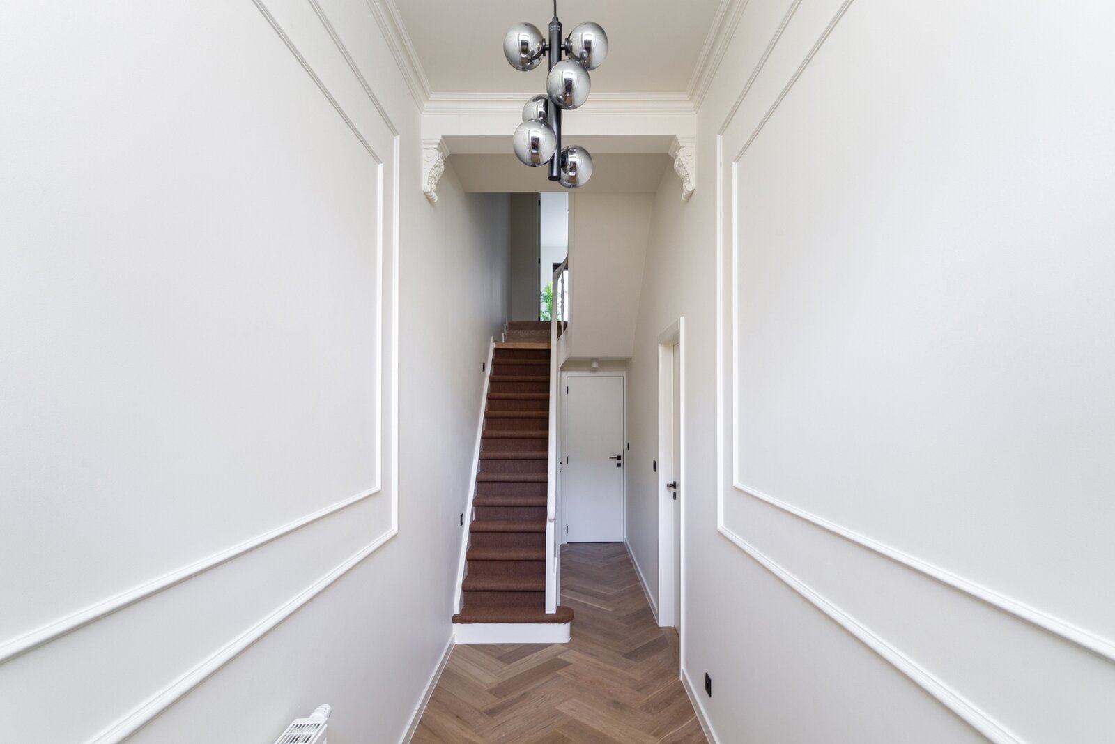 Bij het betreden van de woning wordt u meteen verwelkomd in een indrukwekkende inkomhal met zeer hoge plafonds en prachtige originele moulures, een eerste statement van klasse.