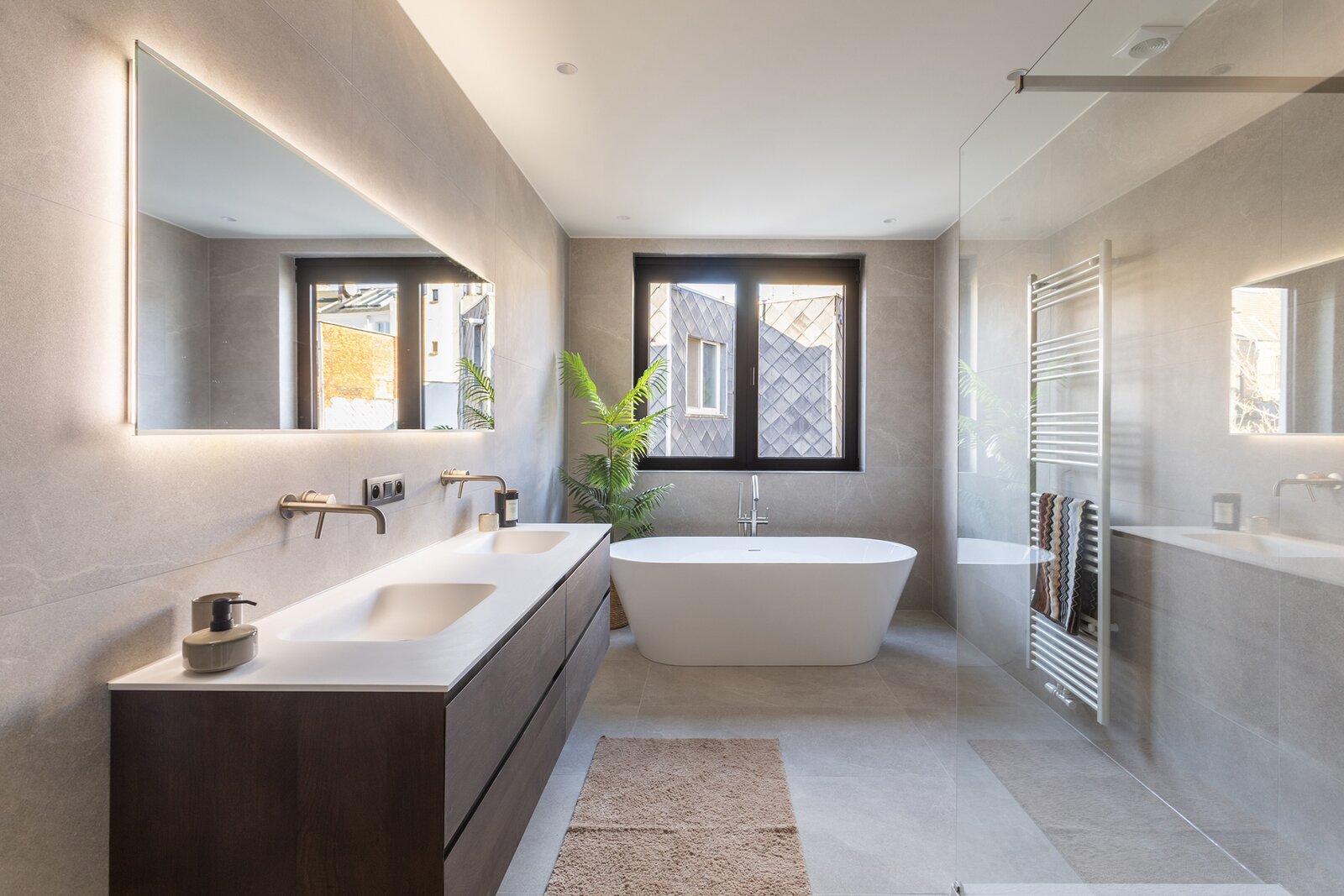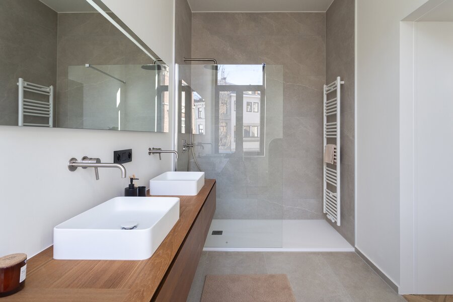 De tweede tussenverdieping is voorzien van een tweede, zeer ruime badkamer, uitgerust met een ligbad, douche en dubbele lavabo.