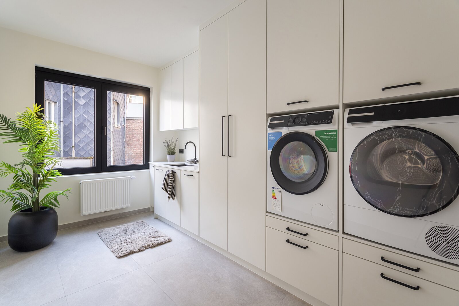 Op de eerste tussenverdieping bevindt zich een zeer ruime waskamer, voorzien van volledig ingebouwde kasten voor een praktisch en optimaal gebruik.