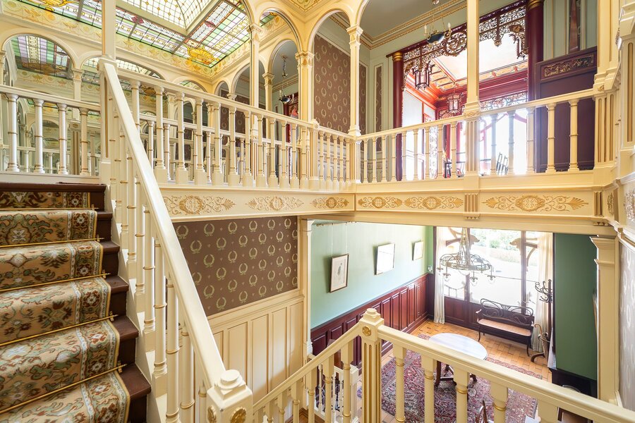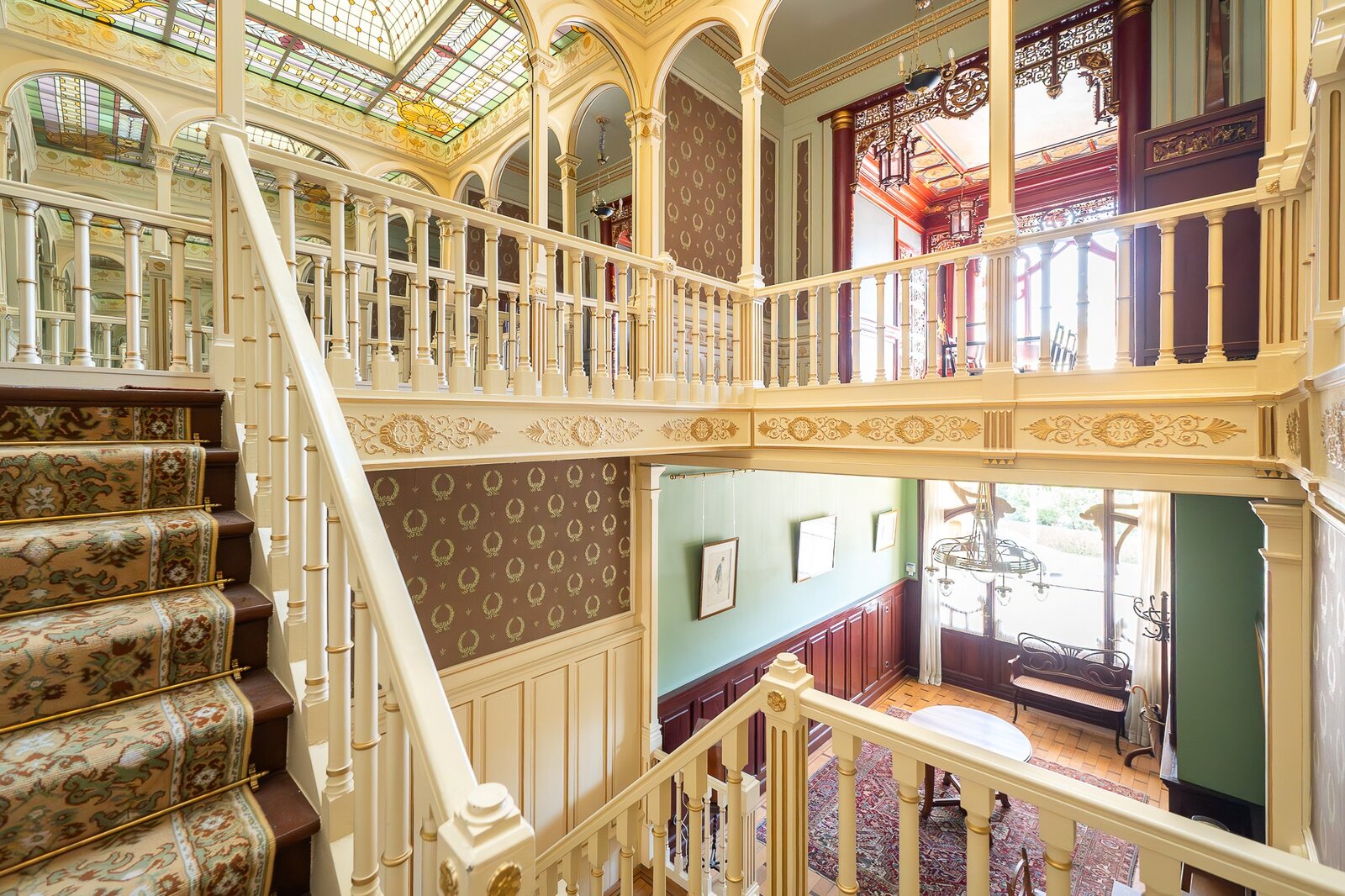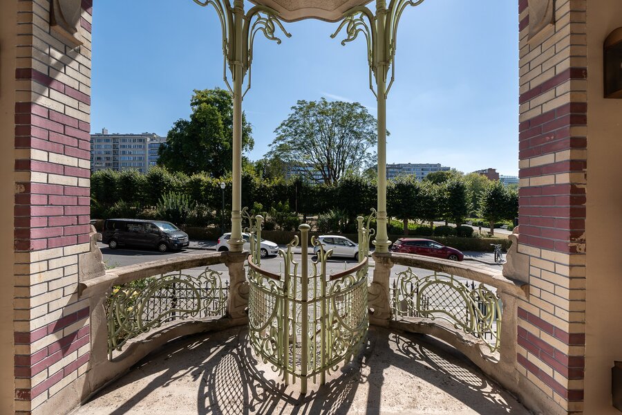 Située sur le square Ambiorix, cette maison emblématique de 1903, signée Gustave Strauven, développe une superficie brute de ± 436 m² (PEB : D) sur 5 niveaux. Elle comprend 3 chambres, 3 salles d’eau, une terrasse panoramique et une architecture remarquable. Restaurée entre 2008 et 2019, elle conjugue patrimoine et confort contemporain.