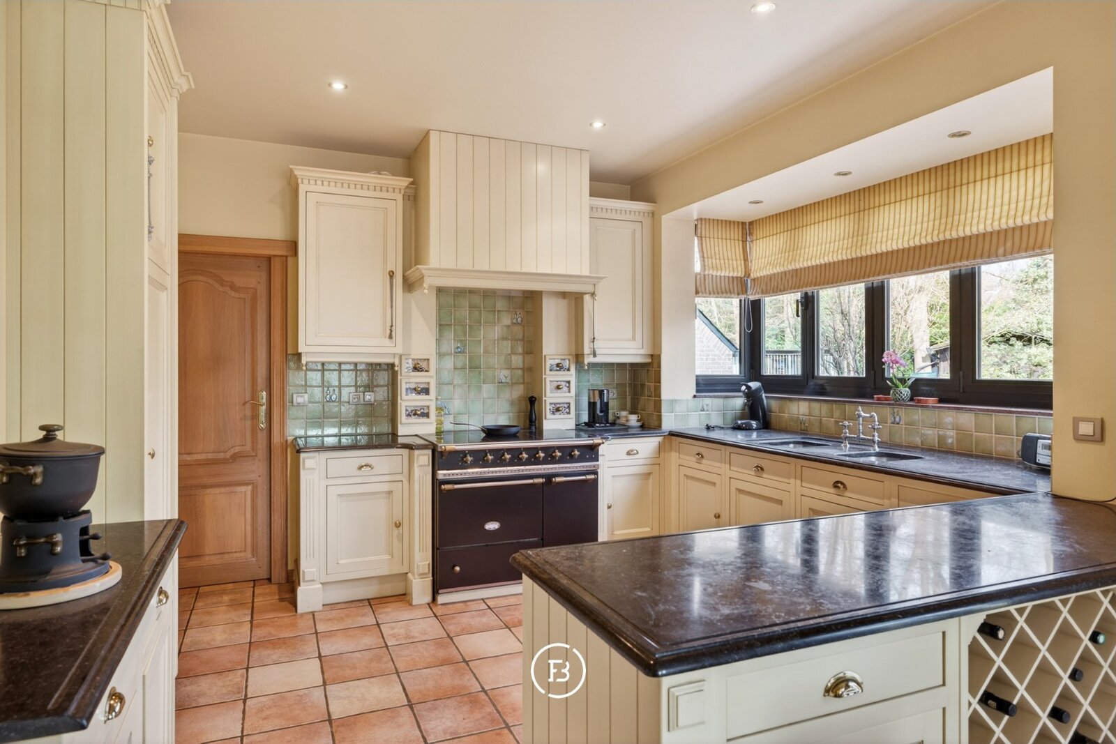 La cuisine ouverte, entièrement équipée, attire immédiatement le regard. Elle dispose notamment d’une cuisinière haut de gamme Lacanche, appréciée des amateurs de gastronomie pour son allure authentique. La cuisine communique directement avec une grande buanderie et un espace de rangement, offrant un accès au garage intégré pour deux voitures.