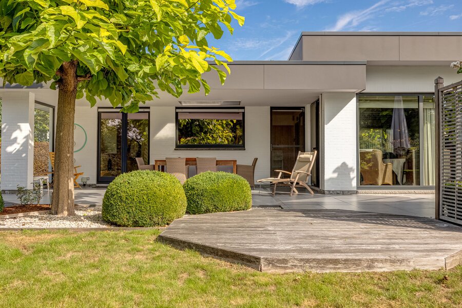 Het gedeeltelijk overdekt terras maakt buiten genieten mogelijk in elk seizoen.