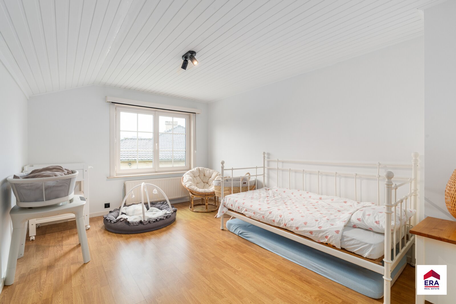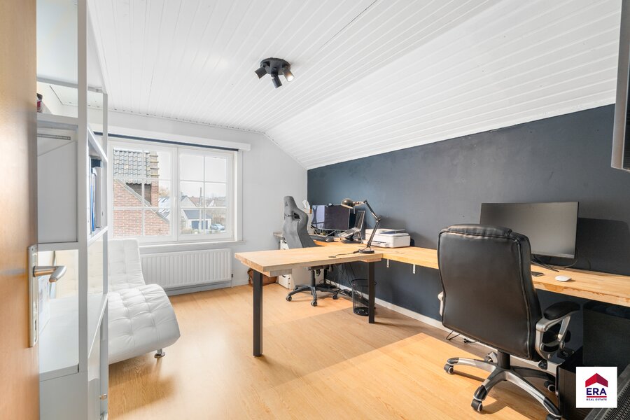 À l’étage se trouvent quatre chambres spacieuses, dont une avec placards intégrés, ainsi qu’une salle de bains équipée d’une douche, d’un double lavabo et d’un WC. Un grenier est également présent et offre un espace de rangement supplémentaire.