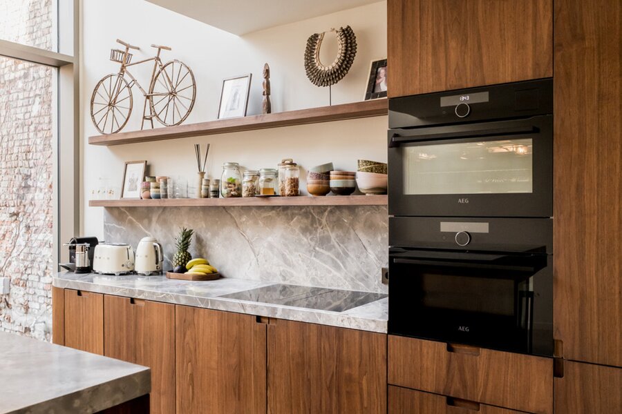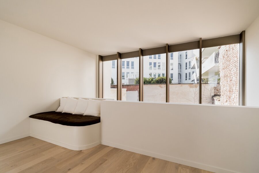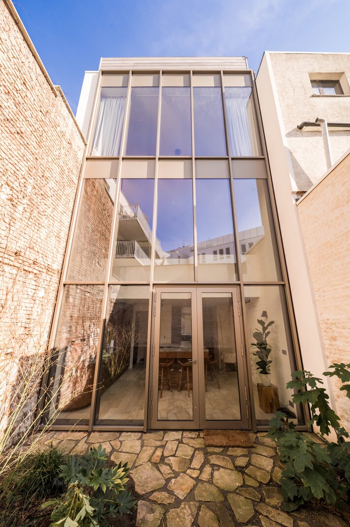 La façade arrière impressionnante, sur trois étages, apporte lumière et sensation d’espace. La première mezzanine accueille un home cinéma confortable.