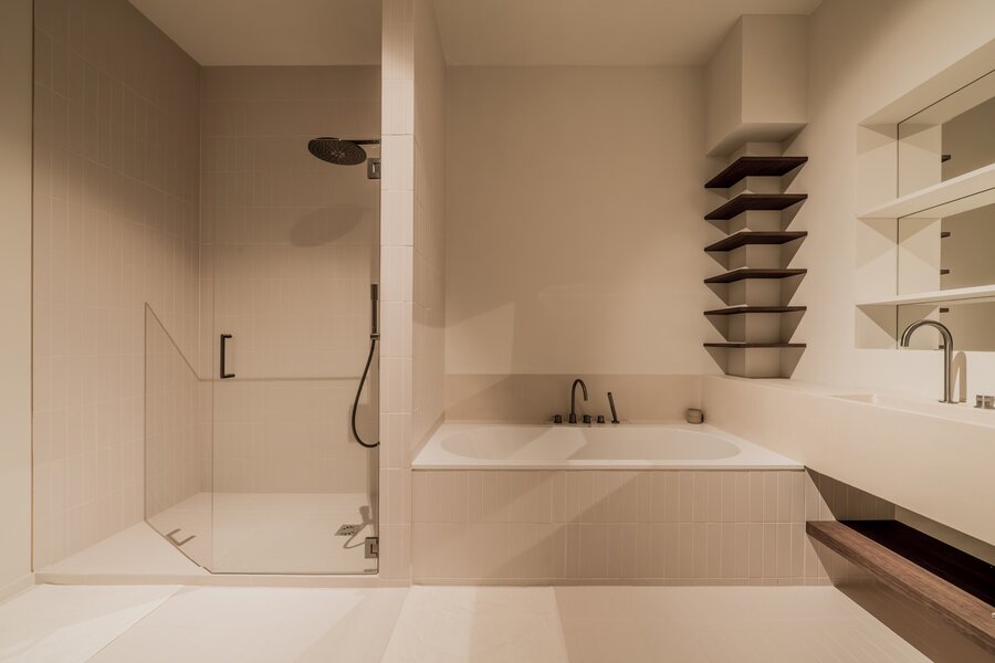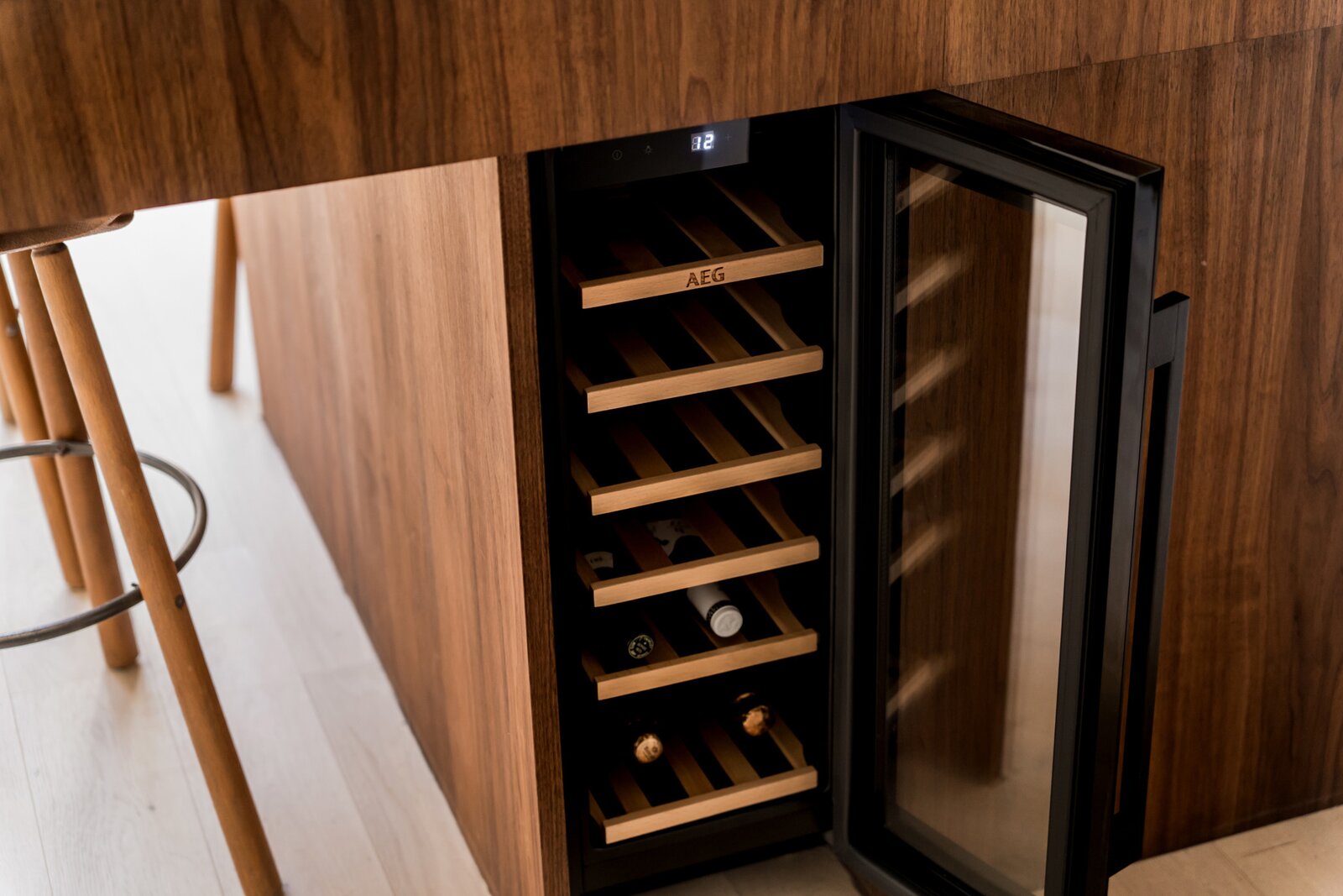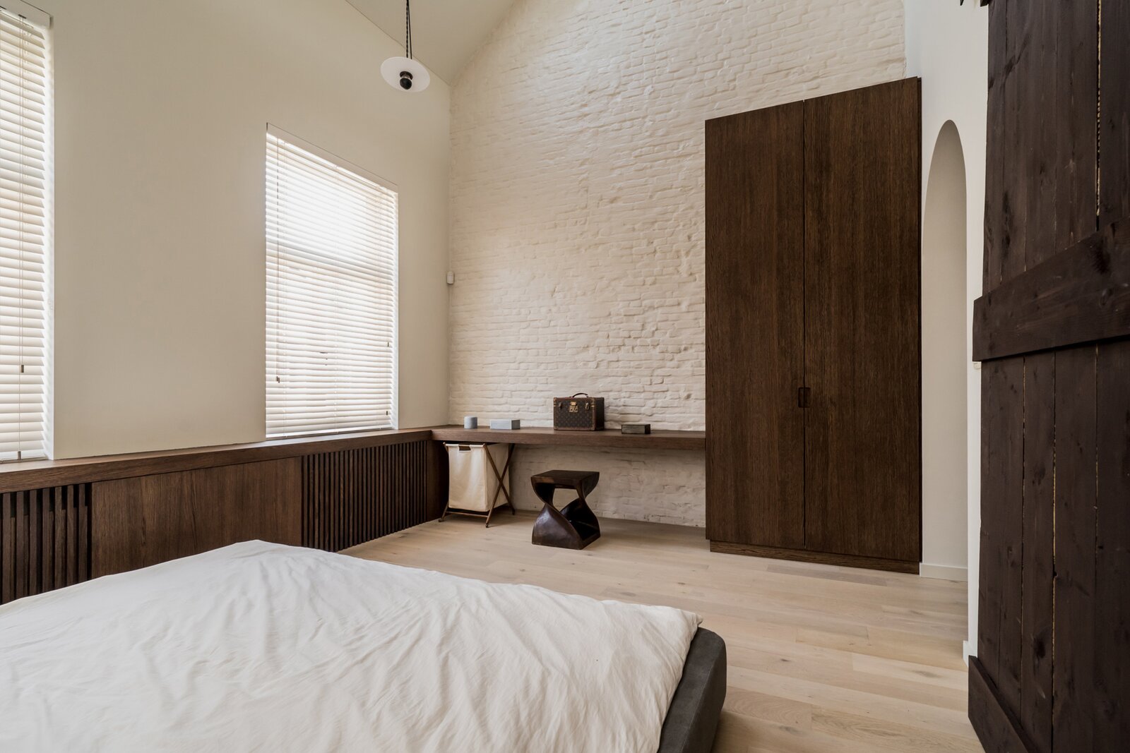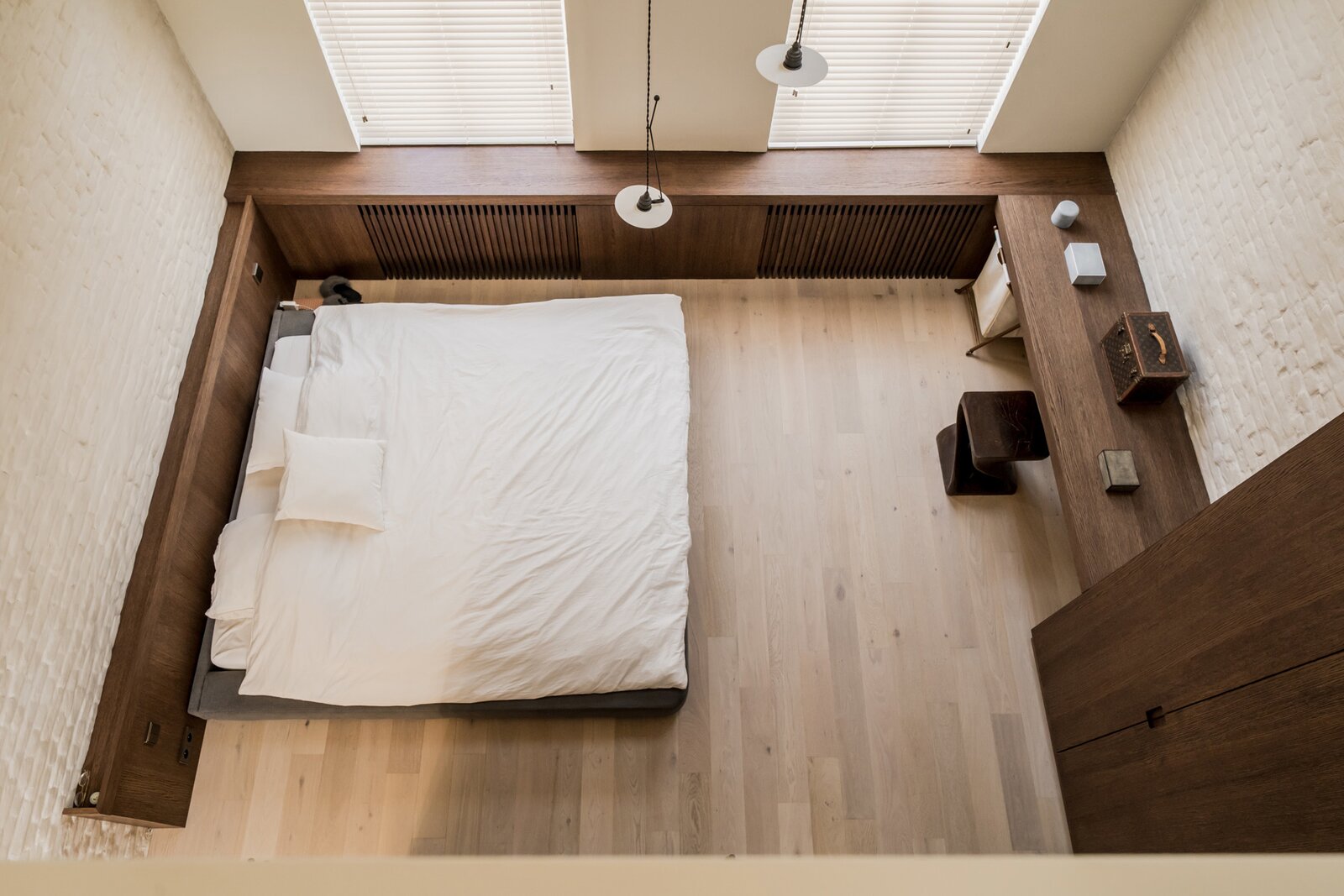 Dès l’entrée, l’atmosphère sereine inspirée du wabi-sabi se fait sentir. Le rez-de-chaussée offre une cuisine luxueuse en pierre naturelle et placage de noyer, un espace de vie et salle à manger ouvert, ainsi qu’un patio baigné par le soleil de l’après-midi.