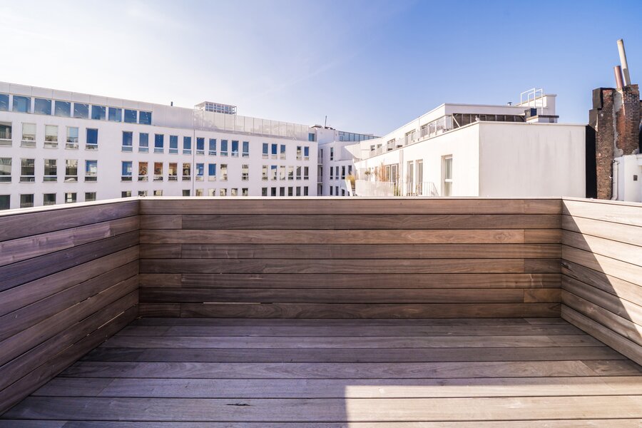 Un ensoleillé toit-terrasse offre un espace parfait pour profiter du soleil. L’ensemble de l’ameublement peut être repris si désiré.