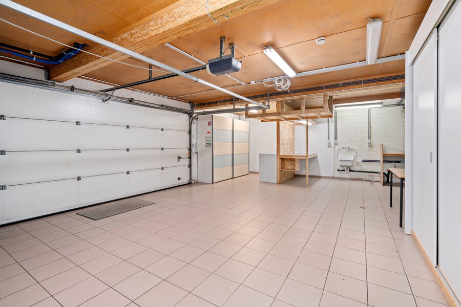 Het gelijkvloers verwelkomt u met een overdekte inkom, een ruime inkomhal met gastentoilet, een stijlvolle handelsruimte van 31 m² aan de straatzijde en een lichtrijke leefruimte met zithoek. De volledig uitgeruste keuken sluit aan op een praktische bijkeuken. De ruime inpandige garage biedt plaats aan twee wagens.