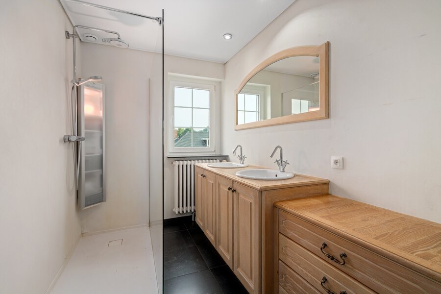 Op de eerste verdieping vindt u drie elegante slaapkamers, een luxueuze badkamer, een overloop met ingemaakte kasten, een landschapsbureel, een gezellige zithoek en een tweede badkamer.