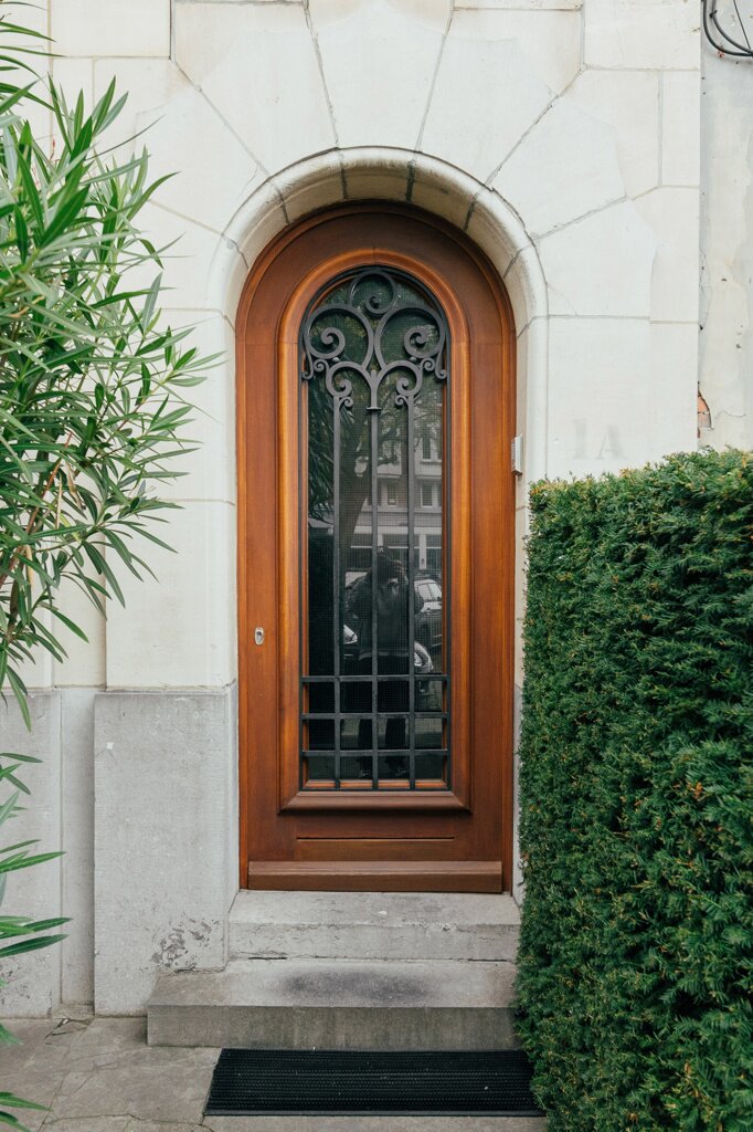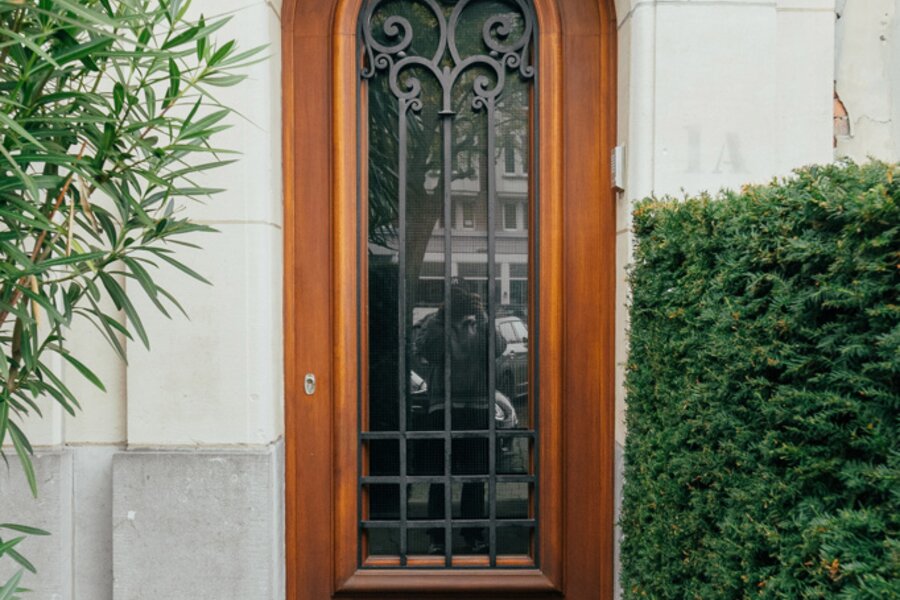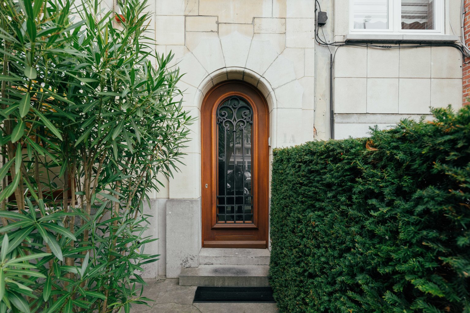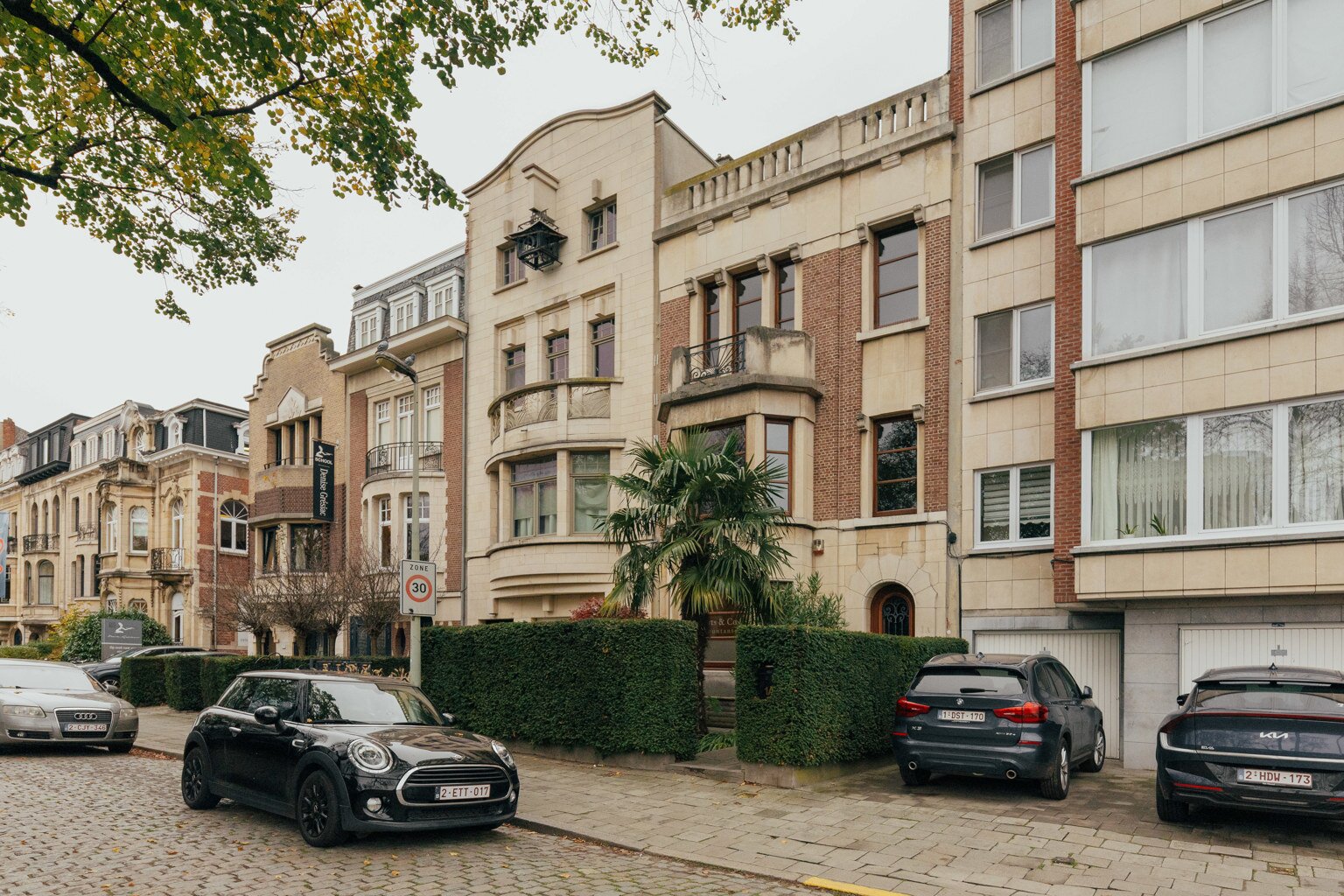 Cette maison de maître Art déco de 1929, conçue par l’architecte Emiel Janssens — rarement documenté — reflète l’élégance raffinée de l’entre-deux-guerres. Le jardin d’entrée luxuriant, agrémenté d’un palmier sculptural et d’un érable japonais flamboyant, offre à la fois intimité et une touche d’exotisme.