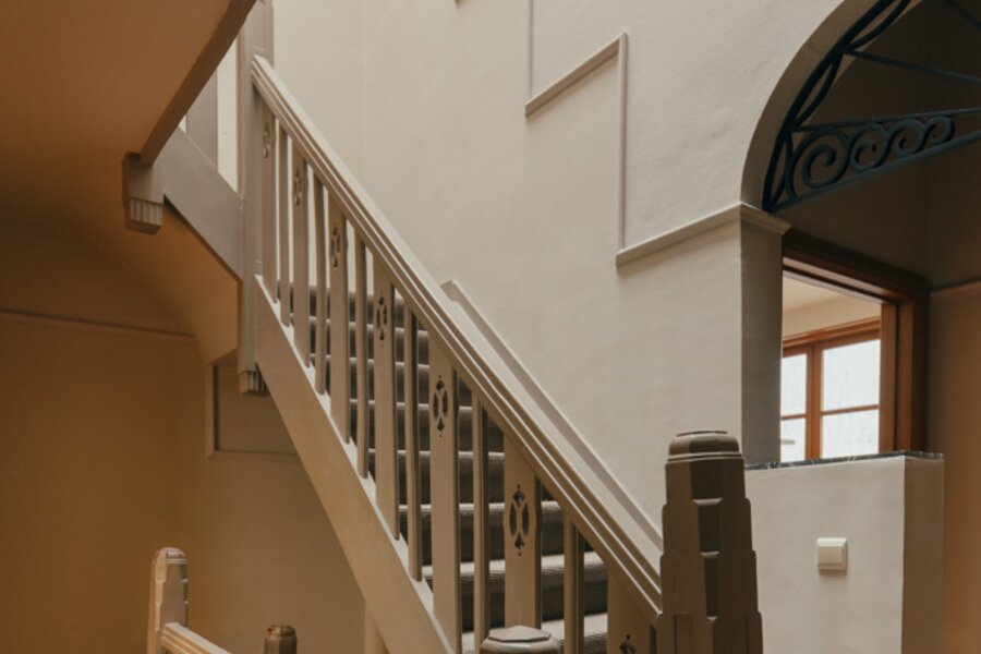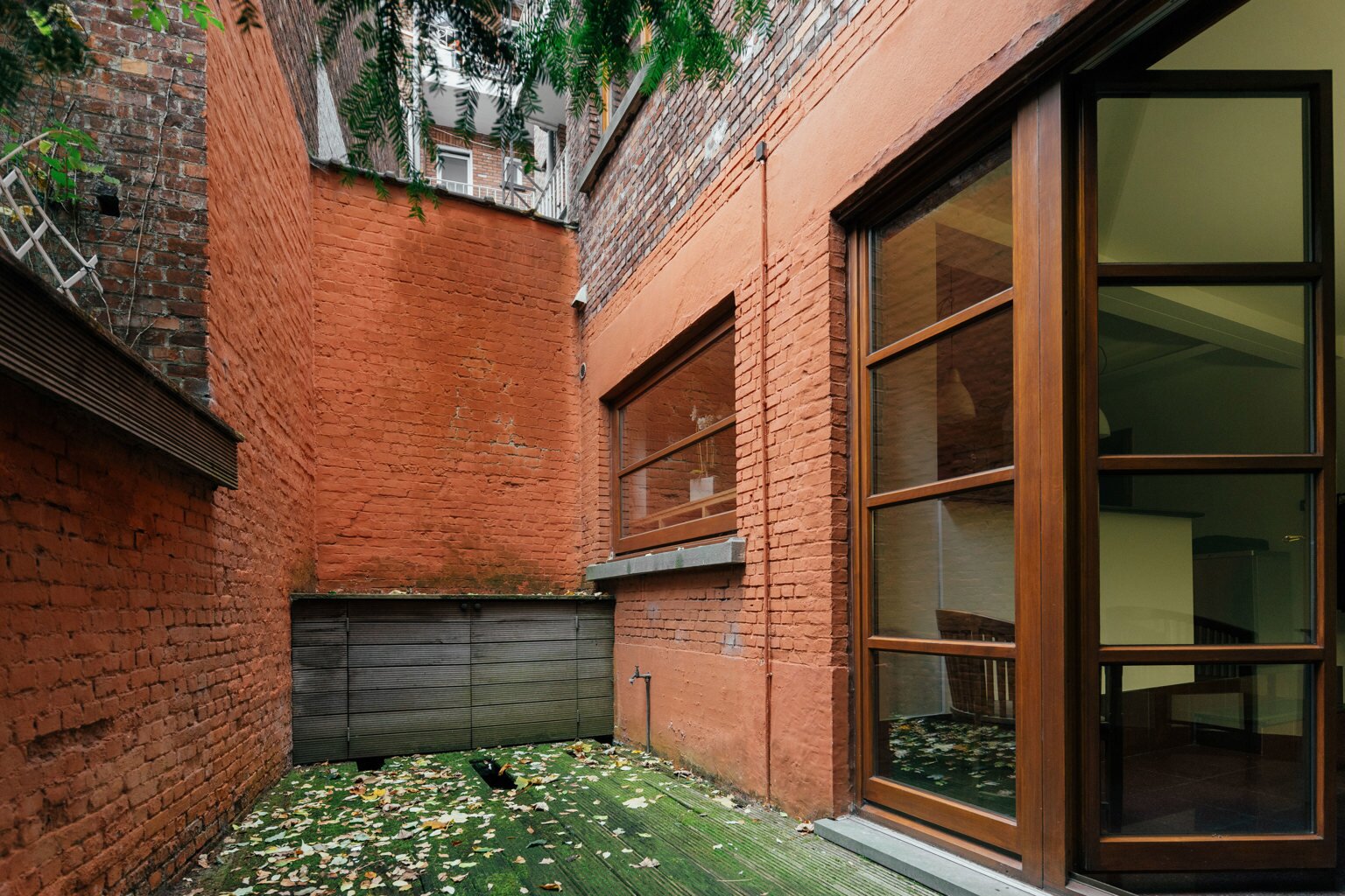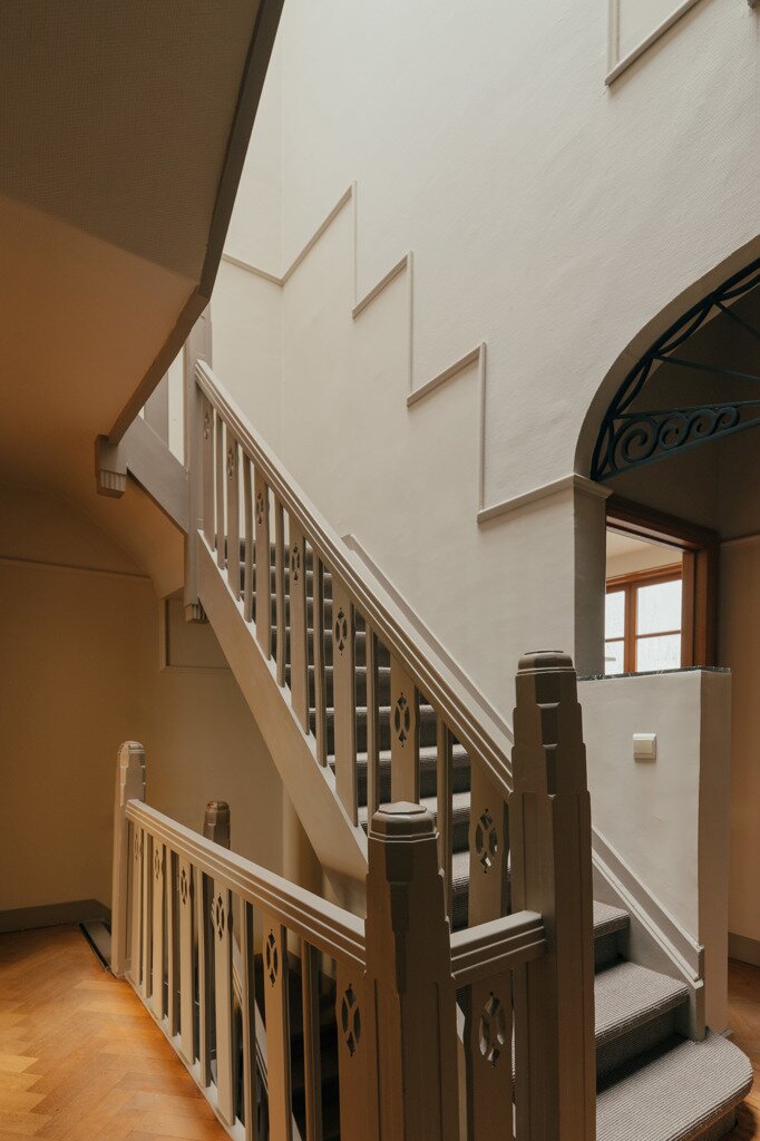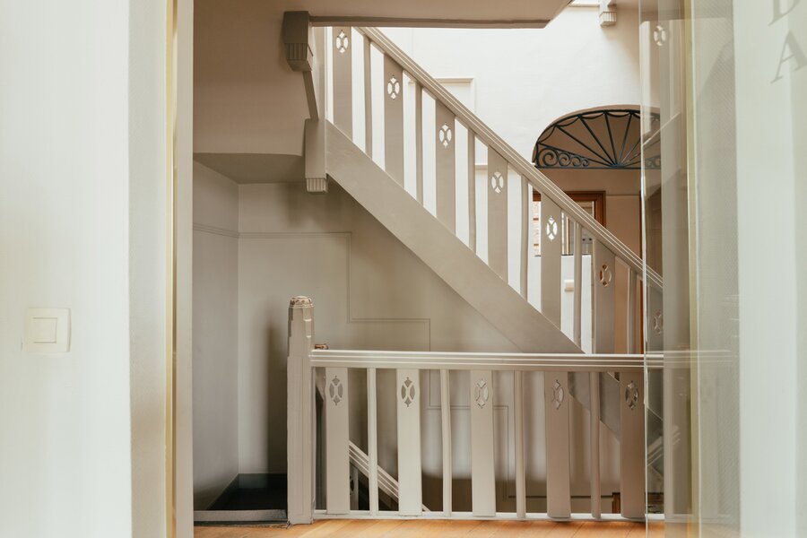 À l’intérieur, la maison se déploie autour d’un impressionnant hall central avec escalier monumental et puits de lumière — une véritable déclaration architecturale qui marque toute la largeur de la demeure. Au rez-de-chaussée se trouvent un bureau côté rue, une salle à manger chaleureuse et une cuisine donnant sur une cour intime. À l’étage, un salon accueillant orné de boiseries raffinées vous attend, accompagné d’une chambre et d’une salle de bains. Le deuxième étage propose trois chambres supplémentaires, une seconde salle de bains et un espace de rangement pratique.