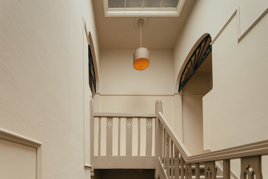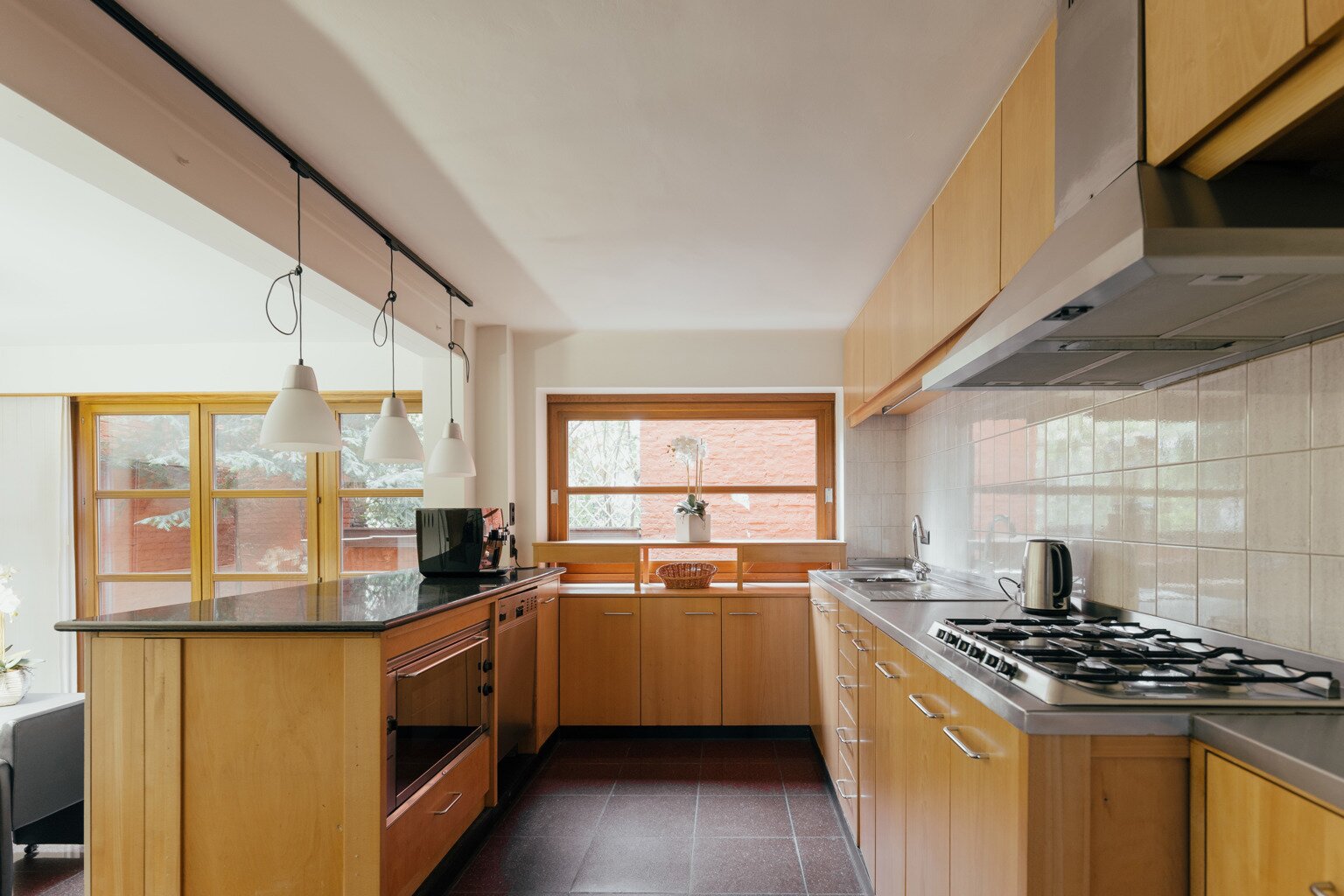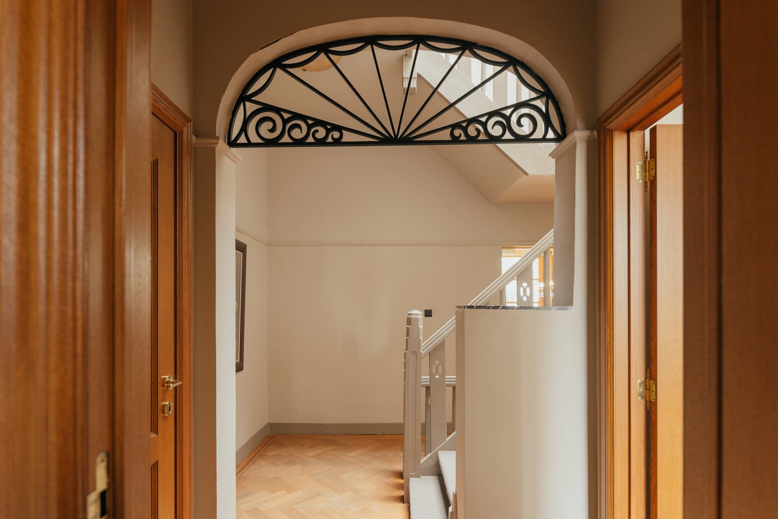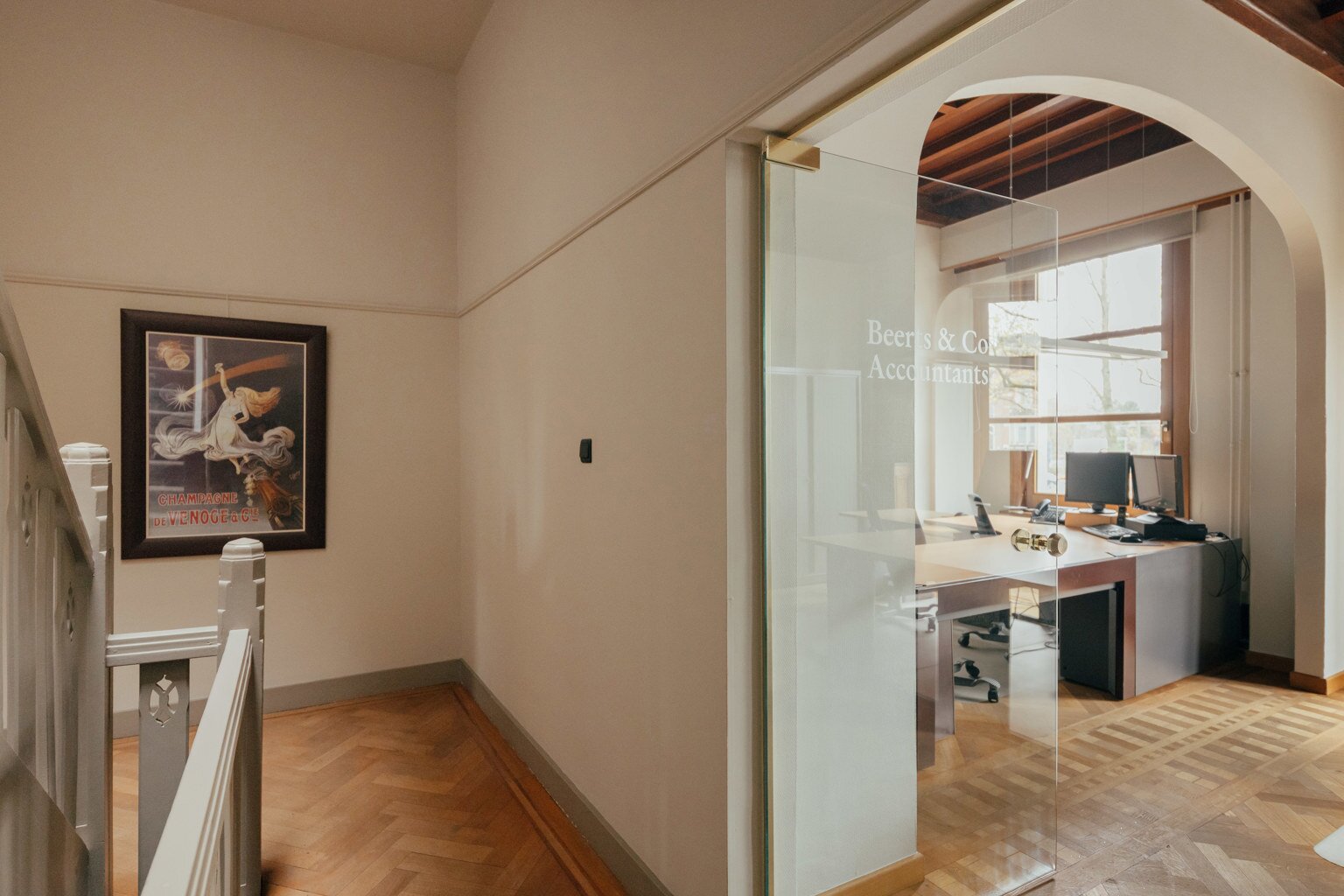 À l’intérieur, la maison se déploie autour d’un impressionnant hall central avec escalier monumental et puits de lumière — une véritable déclaration architecturale qui marque toute la largeur de la demeure. Au rez-de-chaussée se trouvent un bureau côté rue, une salle à manger chaleureuse et une cuisine donnant sur une cour intime. À l’étage, un salon accueillant orné de boiseries raffinées vous attend, accompagné d’une chambre et d’une salle de bains. Le deuxième étage propose trois chambres supplémentaires, une seconde salle de bains et un espace de rangement pratique.
