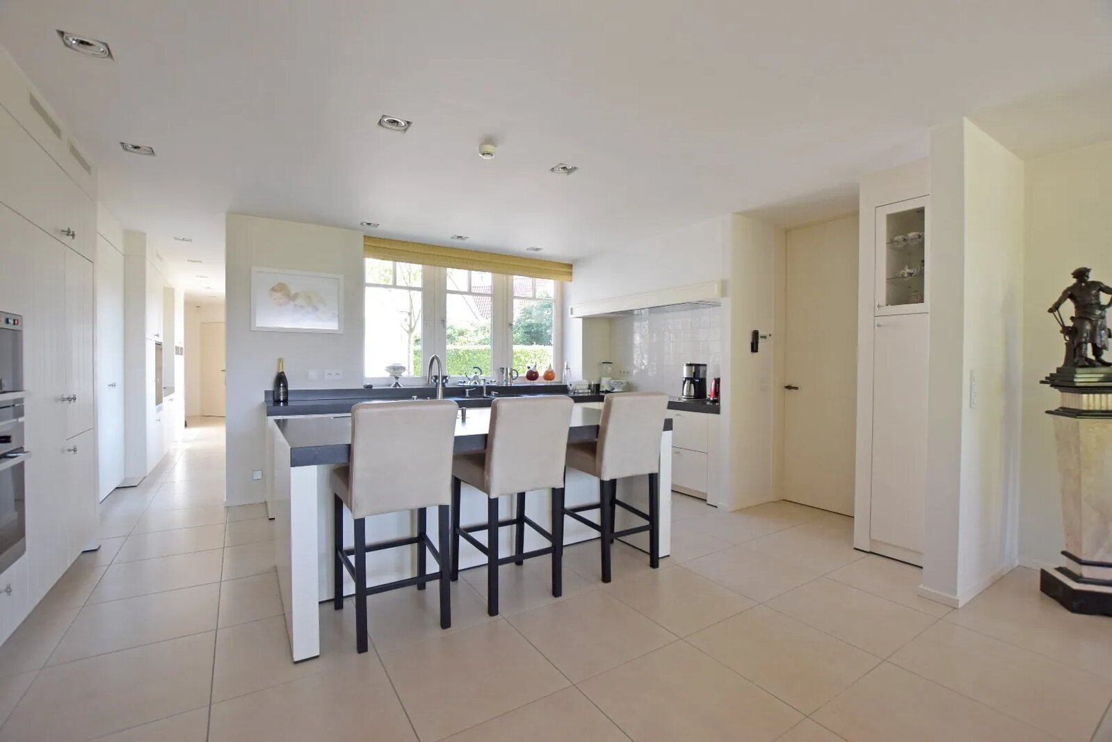 A proximité de la cuisine se trouve un passage avec placards intégrés, une buanderie pratique et un hall qui mène au garage dans la dépendance attenante. Au-dessus du garage se trouve un studio indépendant avec un séjour et une chambre ouverte, une kitchenette et une salle de douche.