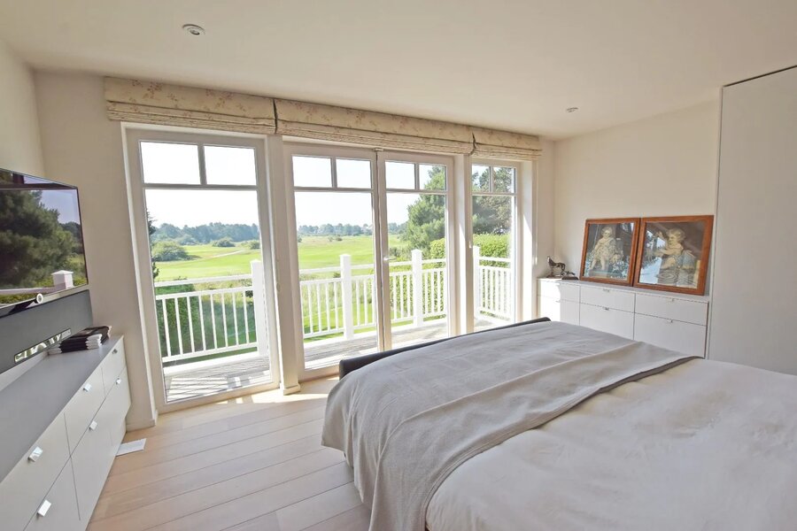 Au premier et deuxième étages : grande chambre principale avec terrasse donnant sur le green adjacent, grandesalle de bain privative avec bain avec vue frontale sur le golf.