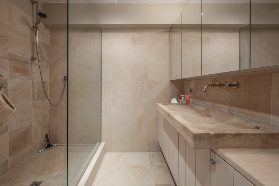 Hall d’entrée avec vestiaire et toilette invités. Spacieux séjour avec vue latérale sur mer, comprenant un salon et une salle à manger. Cuisine semi-ouverte, avec espace de rangement attenant équipé d’un raccordement pour machine à laver/sèche-linge. L’appartement dispose de 2 chambres, chacune avec sa salle de douche privative et des placards intégrés. Les deux chambres donnent à l’arrière sur une terrasse orientée à l’ouest. Débarras avec techniques. Local à vélos commun et cave privative dans la résidence.