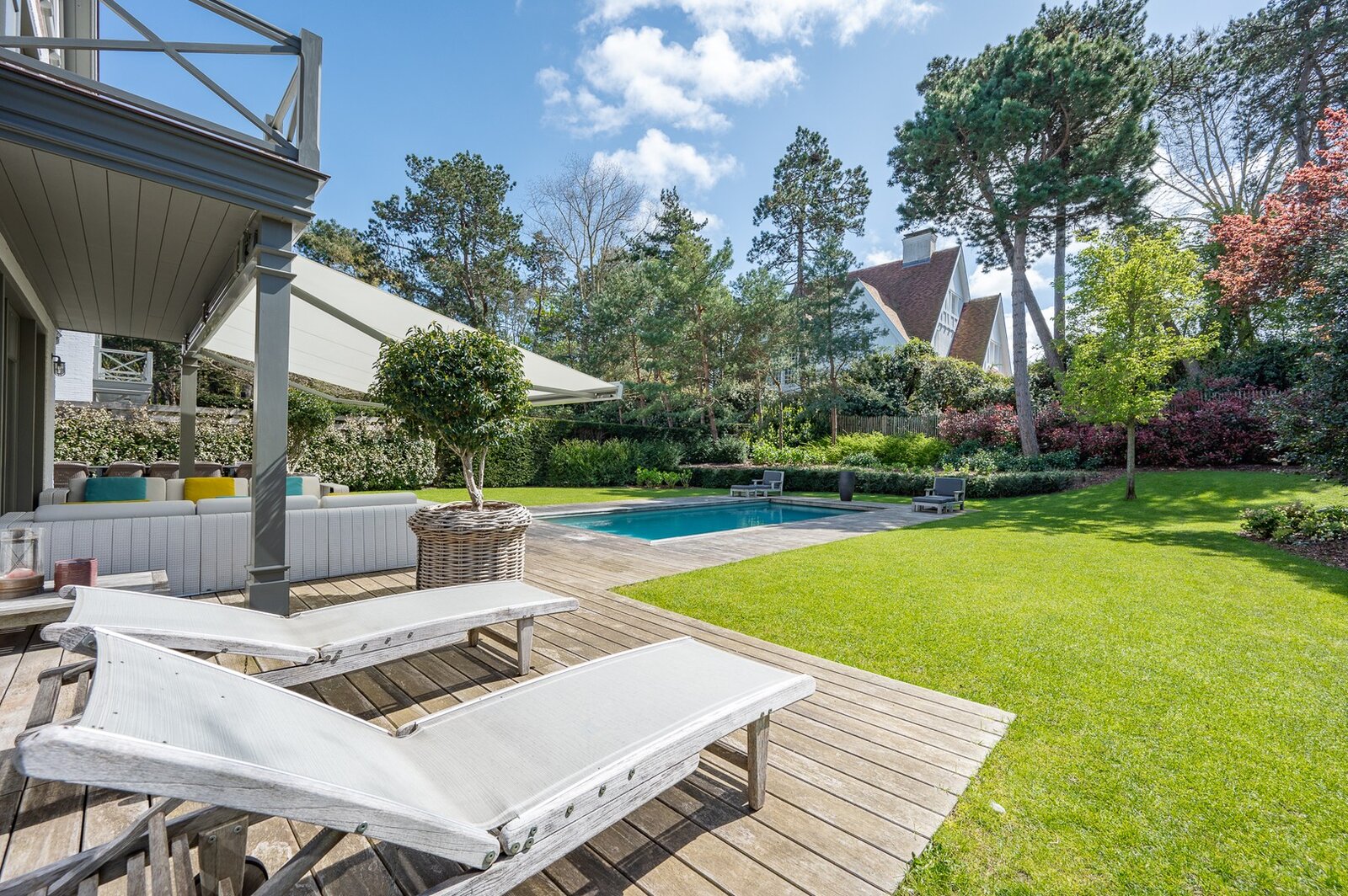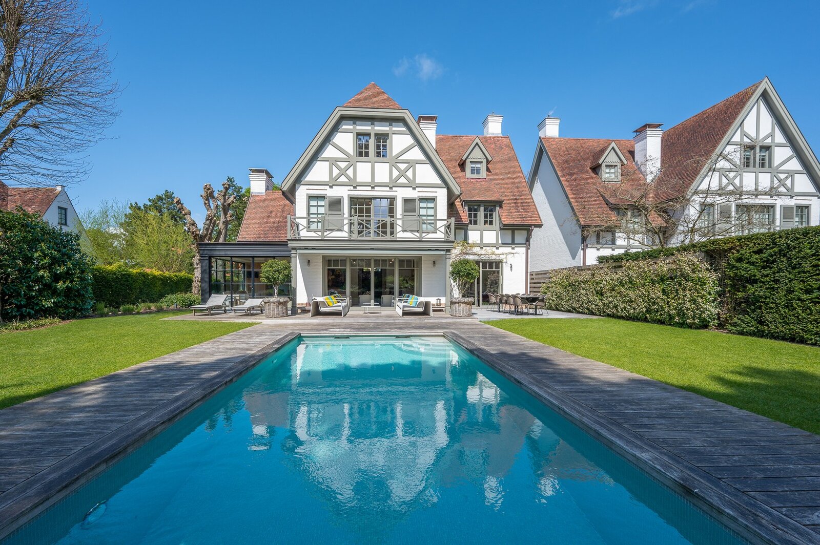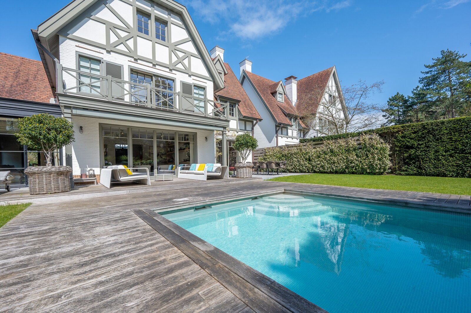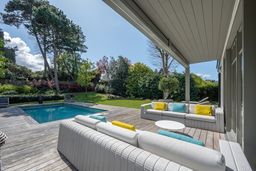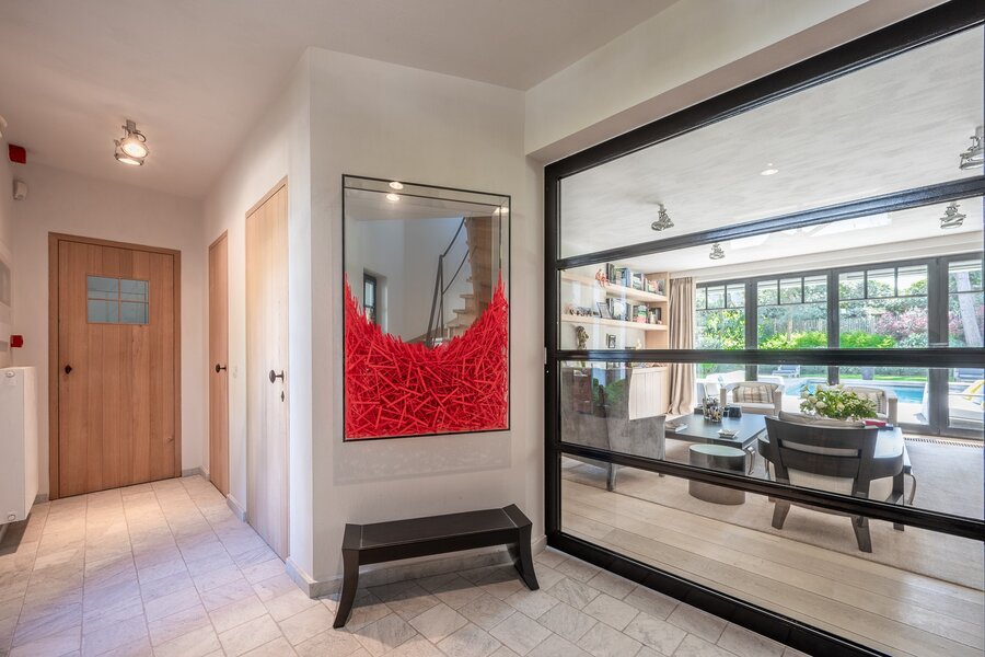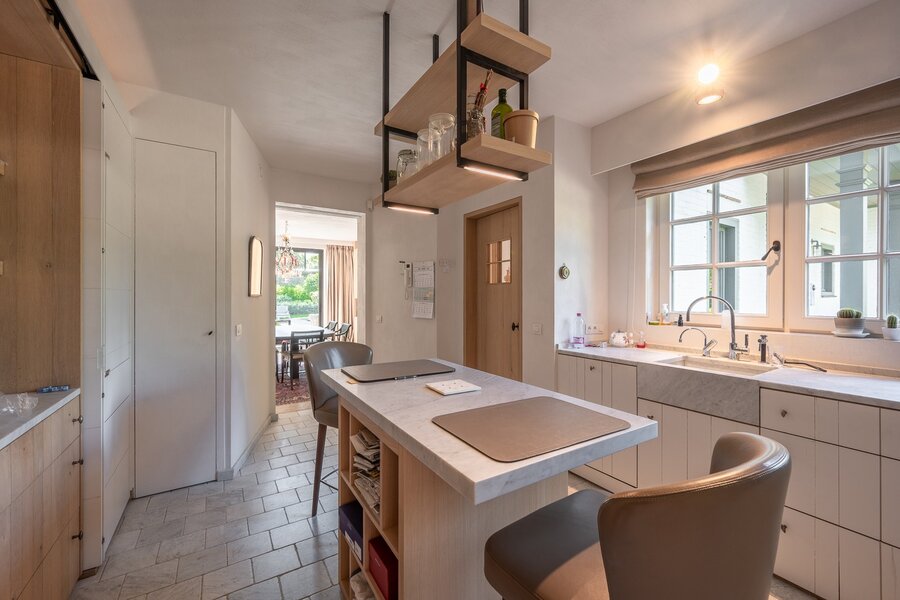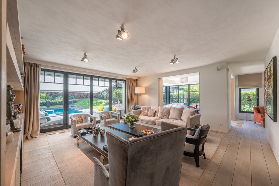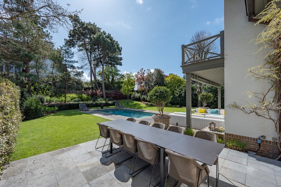 Belle villa située au calme dans un petit sentier au Zoute, à quelques pas des magasins, de la mer et de la plage. Disposition: hall d'entrée avec vestiaire et toilettes invités. Salon très lumineux (cheminée) grâce à de grandes fenêtres donnant sur le jardin ensoleillé et la piscine. Coin TV avec espace bureau. Salle à manger. Cuisine agréable avec coin petit-déjeuner. Au premier étage : chambre principale spacieuse donnant sur la terrasse, dressing et salle de bains attenante (double lavabo, baignoire, douche à l'italienne et toilettes séparées). Bureau/deuxième chambre. 3ème chambre avec salle de douche, cuisine et salon (peut servir comme studio/conciergerie). Au deuxième étage, 2 chambres spacieuses. Salle de bains. La villa dispose d'un sous-sol comprenant une salle de réunion/détente, une buanderie et un local technique. Magnifique jardin paysager avec terrasse et piscine chauffée. Garage intérieur pour deux voitures et grand parking extérieur. Les finitions ont été soignées dans les moindres détails et la villa est équipée d'un système de climatisation, arrosage automatique et alarme. Contactez Immo Knokke Real Estate pour organiser une visite.