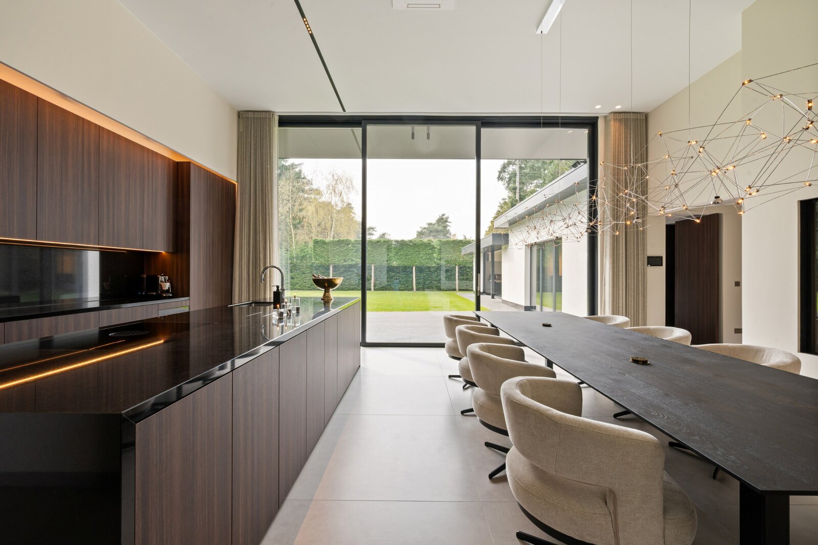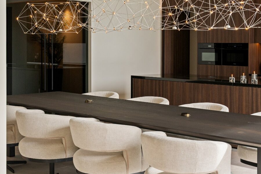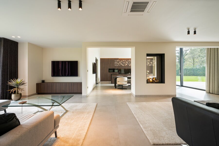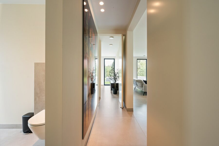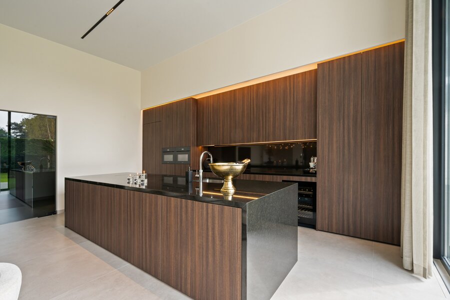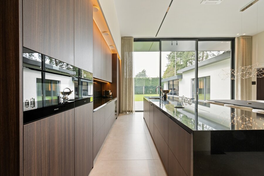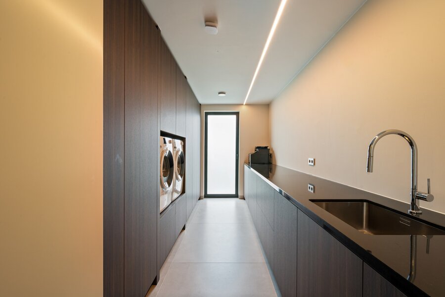 Distribution : Par le hall d'entrée central avec toilettes invités, vous entrez dans cette magnifique maison contemporaine. De là, vous accédez à la zone de vie ouverte et lumineuse, comprenant un coin salon confortable avec cheminée au gaz, une salle à manger et une cuisine ouverte entièrement équipée. Grâce aux fenêtres du sol au plafond, vous bénéficiez ici d'une abondance de lumière naturelle et d'une belle vue sur le jardin confortable. La cuisine est équipée de tous les appareils modernes (Miele), dont un lave-vaisselle, un réfrigérateur, un congélateur, 2 fours combinés, une cave à vin, une plaque de cuisson à induction avec hotte intégrée (Bora) et un évier. À côté se trouve un débarras / buanderie pratique avec raccordement pour lave-linge et sèche-linge.