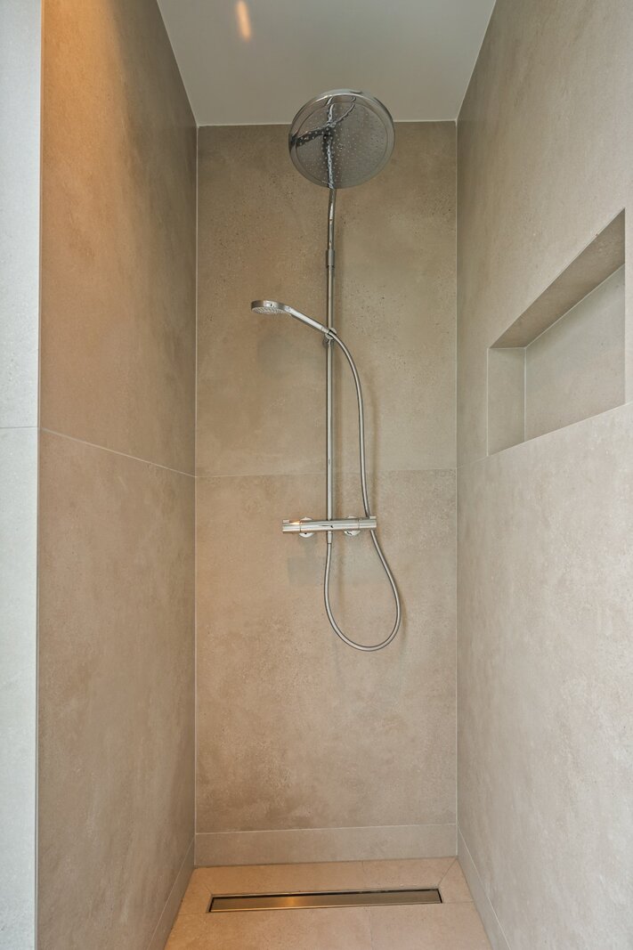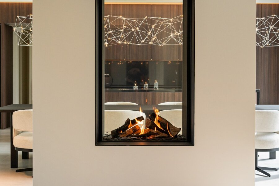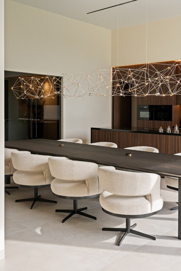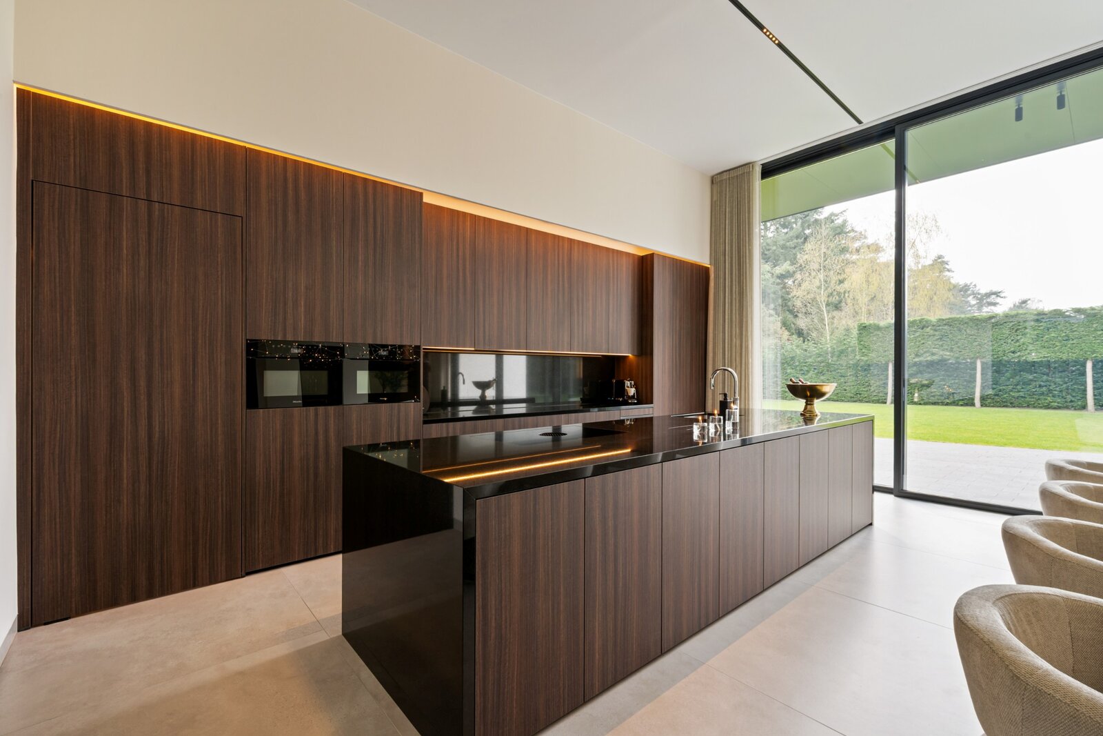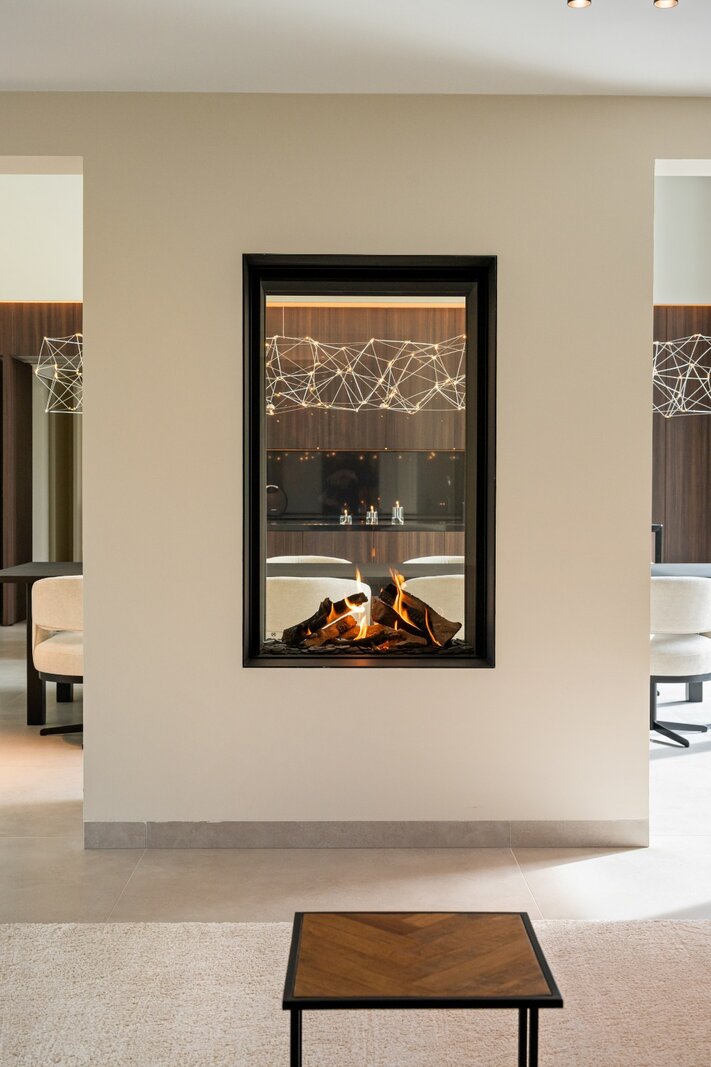 Distribution : Par le hall d'entrée central avec toilettes invités, vous entrez dans cette magnifique maison contemporaine. De là, vous accédez à la zone de vie ouverte et lumineuse, comprenant un coin salon confortable avec cheminée au gaz, une salle à manger et une cuisine ouverte entièrement équipée. Grâce aux fenêtres du sol au plafond, vous bénéficiez ici d'une abondance de lumière naturelle et d'une belle vue sur le jardin confortable. La cuisine est équipée de tous les appareils modernes (Miele), dont un lave-vaisselle, un réfrigérateur, un congélateur, 2 fours combinés, une cave à vin, une plaque de cuisson à induction avec hotte intégrée (Bora) et un évier. À côté se trouve un débarras / buanderie pratique avec raccordement pour lave-linge et sèche-linge.