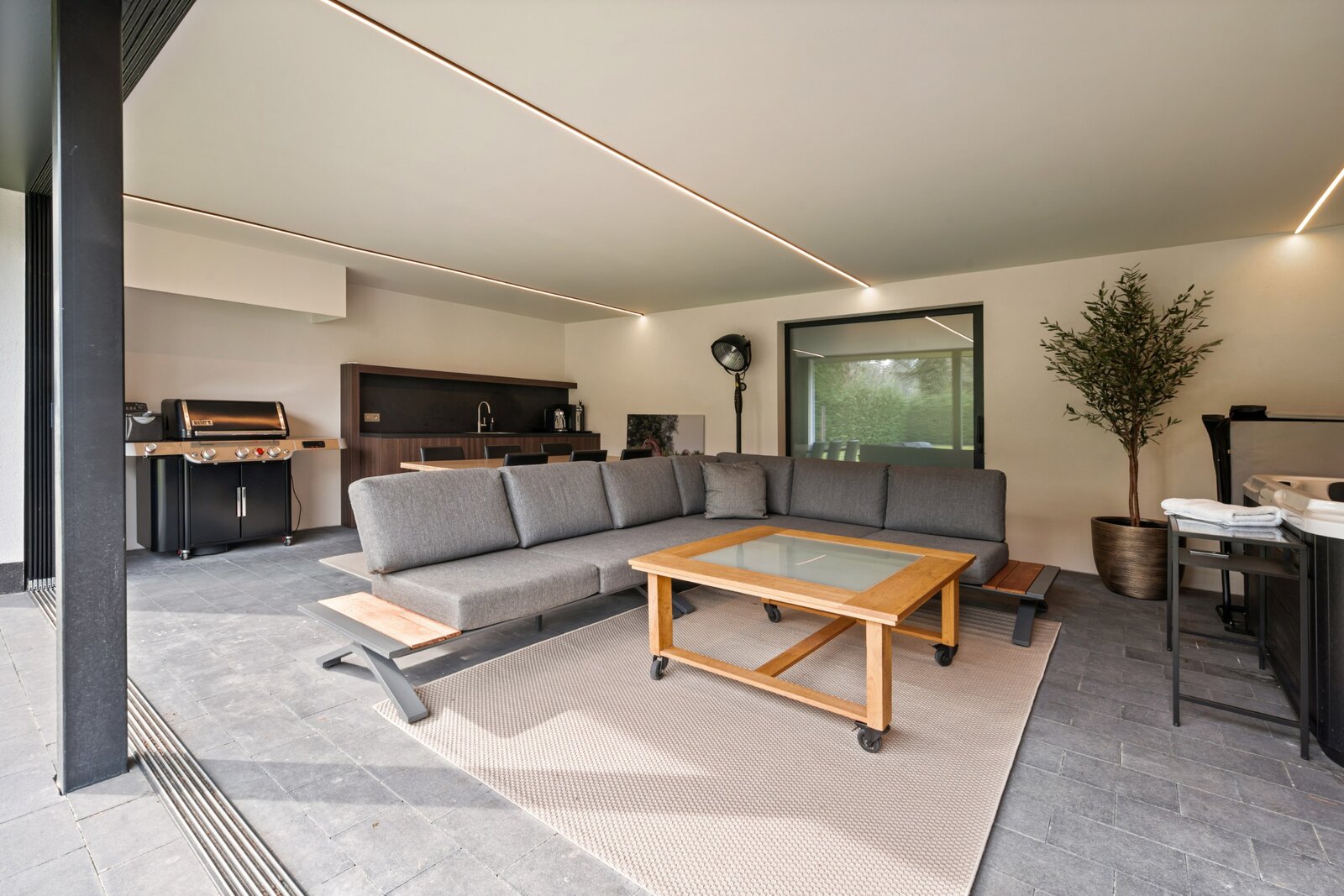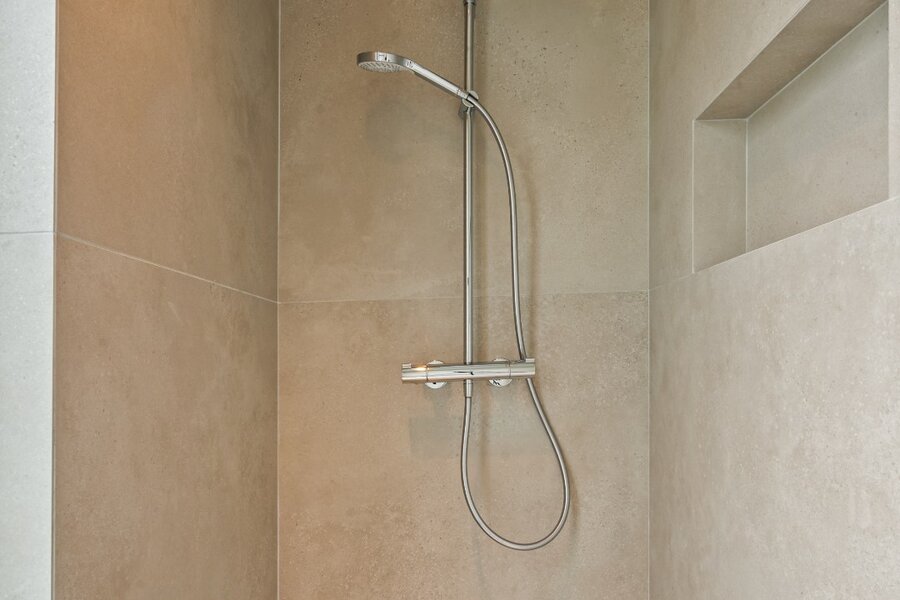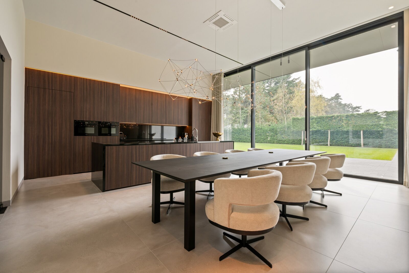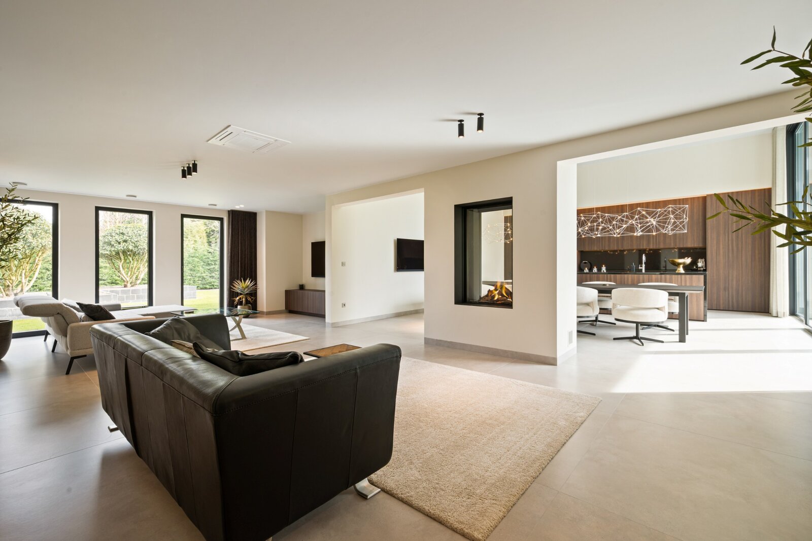 Distribution : Par le hall d'entrée central avec toilettes invités, vous entrez dans cette magnifique maison contemporaine. De là, vous accédez à la zone de vie ouverte et lumineuse, comprenant un coin salon confortable avec cheminée au gaz, une salle à manger et une cuisine ouverte entièrement équipée. Grâce aux fenêtres du sol au plafond, vous bénéficiez ici d'une abondance de lumière naturelle et d'une belle vue sur le jardin confortable. La cuisine est équipée de tous les appareils modernes (Miele), dont un lave-vaisselle, un réfrigérateur, un congélateur, 2 fours combinés, une cave à vin, une plaque de cuisson à induction avec hotte intégrée (Bora) et un évier. À côté se trouve un débarras / buanderie pratique avec raccordement pour lave-linge et sèche-linge.