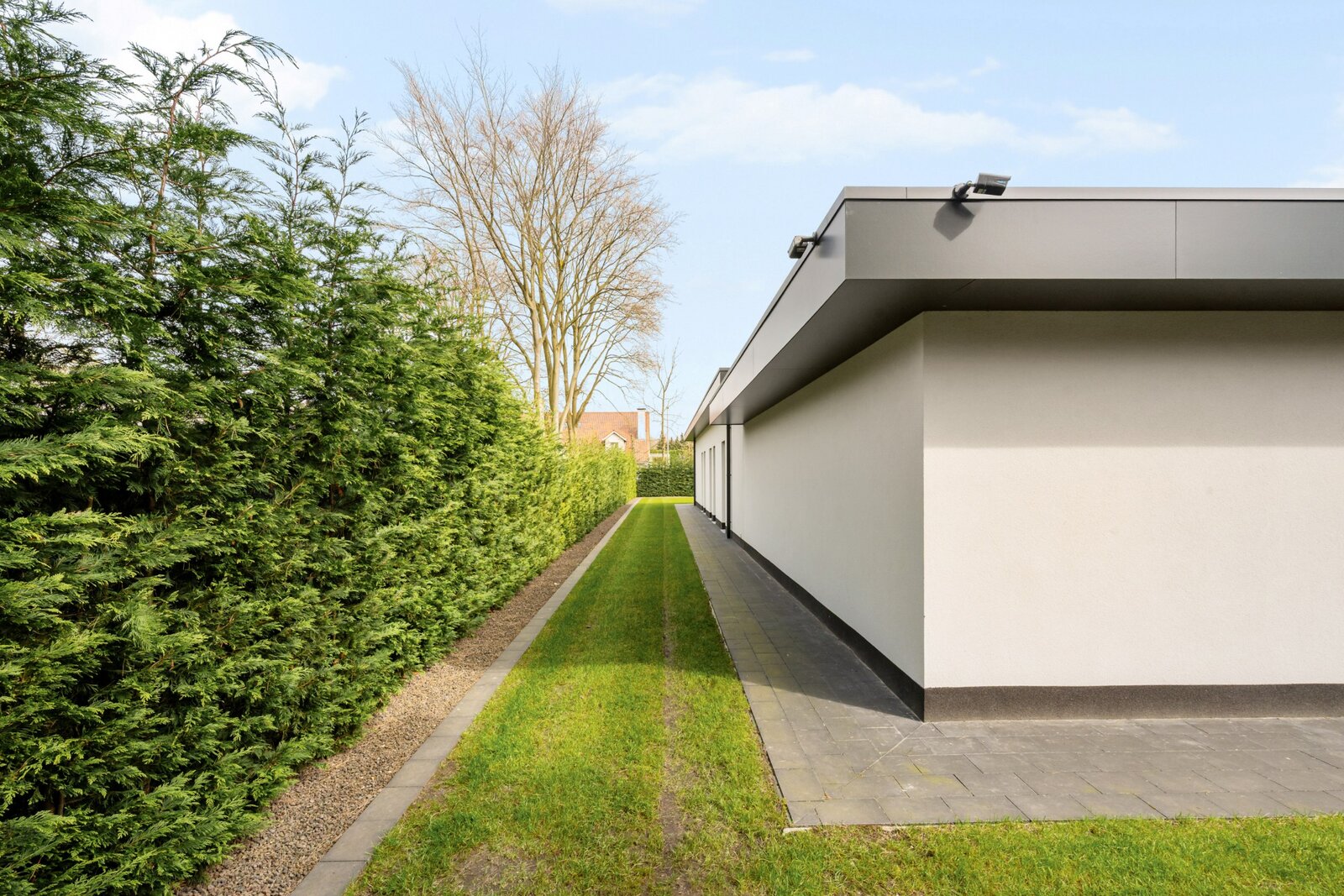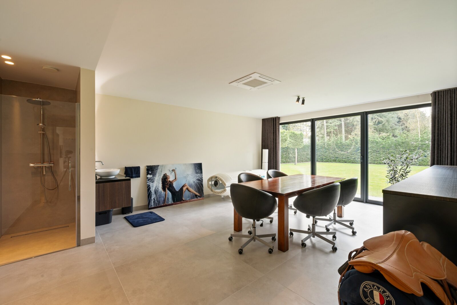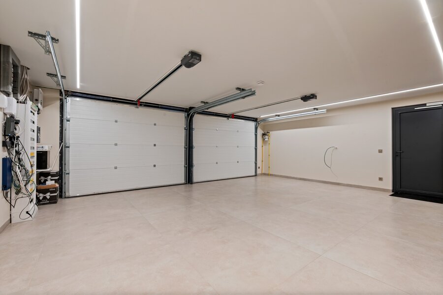 De plus, la maison dispose d'une chambre d'amis séparée avec douche et lavabo. Cet espace peut également servir de bureau ou de salle de fitness. Double garage intégré avec armoires sur mesure.