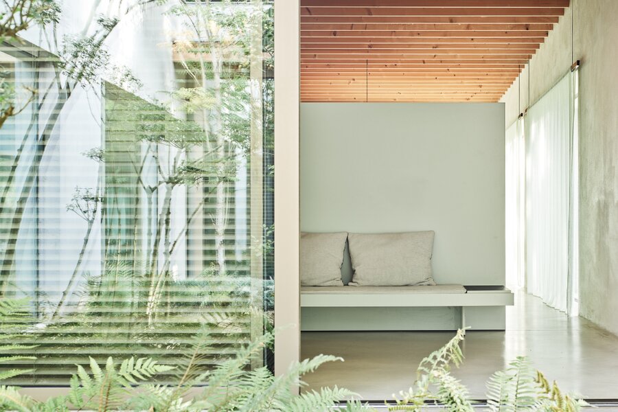 Deze laagbouwvilla werd opgevat als een uniform en massief, balkvormig volume waarbij doordachte uitsnijdingen unieke ervaringen met zich meebregen. Deze zorgen ervoor dat de verschillende ruimtes zowel van elkaar worden afgescheiden alsook op een subtiele manier met elkaar verbinding behouden.
