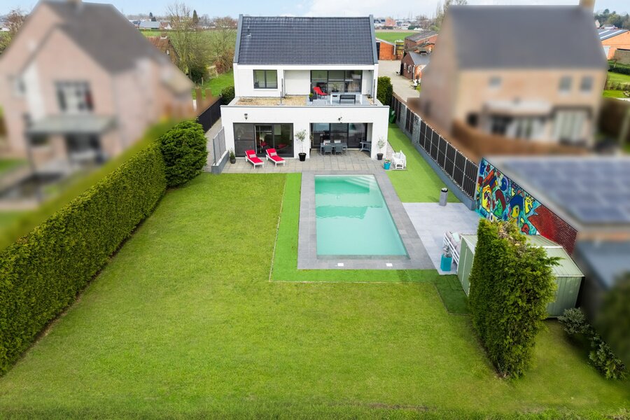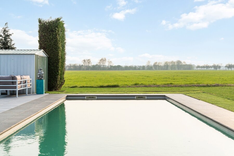 De zuid gerichte tuin biedt een hoge mate van privacy en vormt een ideale omgeving voor wie graag van het buitenleven geniet. Het verwarmde buitenzwembad, uitgerust met een afdekrolluik en zonnecollectoren, biedt een prachtig uitzicht op de achterliggende grasvelden en creëert een bijzonder rustige en aangename sfeer.