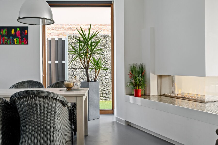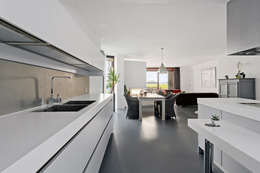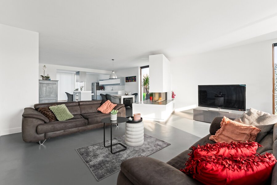 De ruime en lichtrijke leefruimte met open keuken vormt het kloppend hart van de woning. Hier bevindt zich een gezellige zithoek die uitnodigt tot ontspannen momenten. Dankzij de grote raampartijen geniet u van een overvloed aan natuurlijk licht en een prachtig panoramisch uitzicht op de tuin en het aangelegde zwembad.