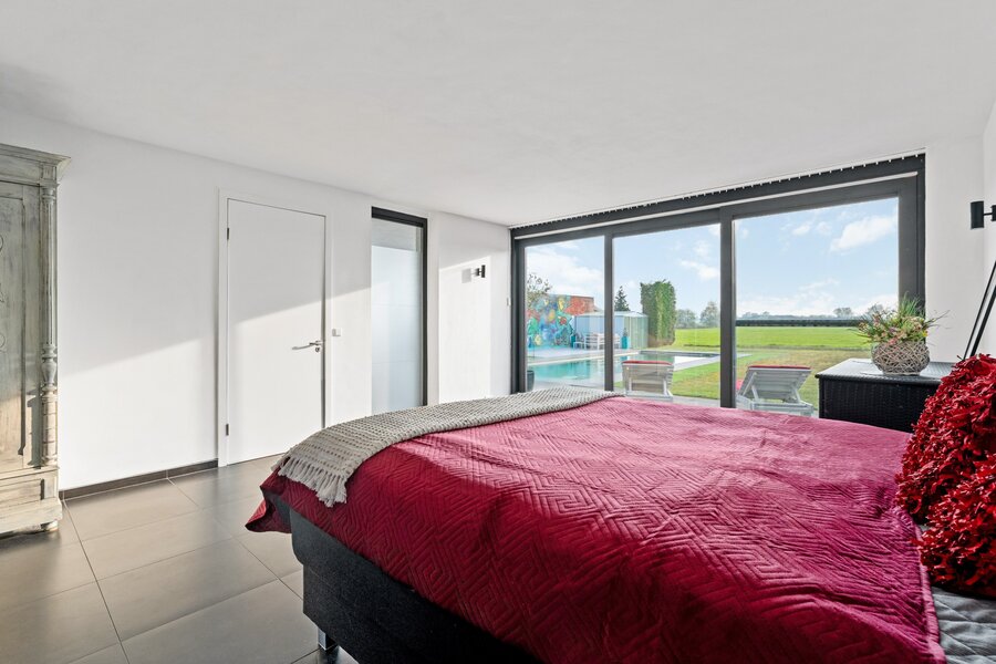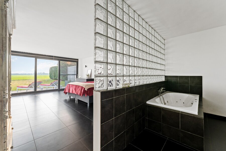 Op het gelijkvloers bevindt zich bovendien een ruime master suite met een comfortabele slaapkamer en een aansluitende badkamer. Deze badkamer is uitgerust met een jacuzzi, een wastafel, een inloopdouche en een toilet. Via de grote glazen schuifpui heeft u bovendien directe toegang tot het terras en het zwembad.