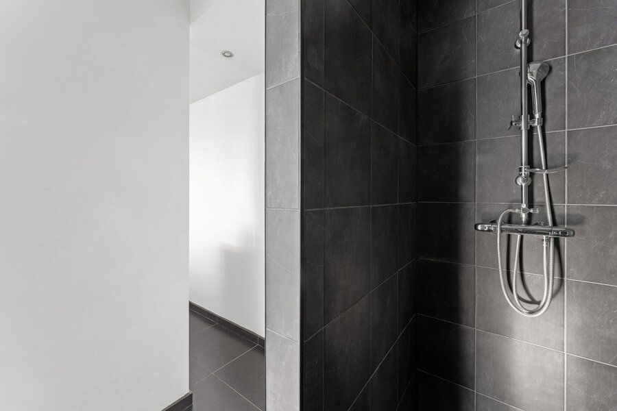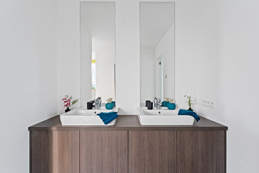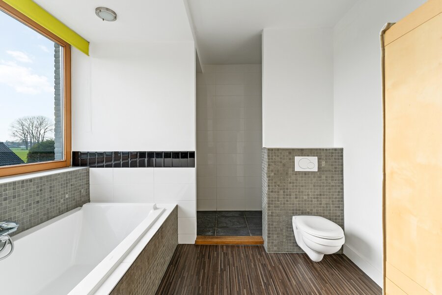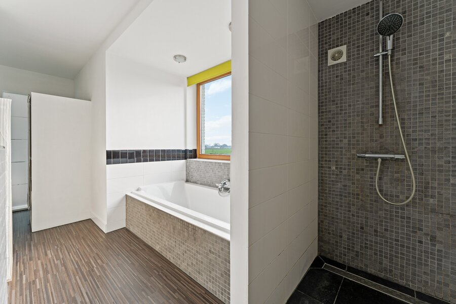 De badkamer beschikt over een dubbele wastafel in meubel, een ligbad en een inloopdouche.