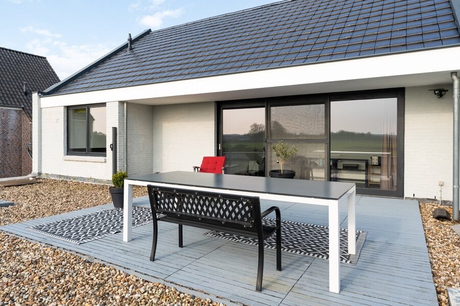 Vanuit de keuken en eetruimte heeft u via een grote schuifpui toegang tot het ruime dakterras, voorzien van twee uittrekbare windschermen, waar u in alle rust kan genieten van het mooie uitzicht.